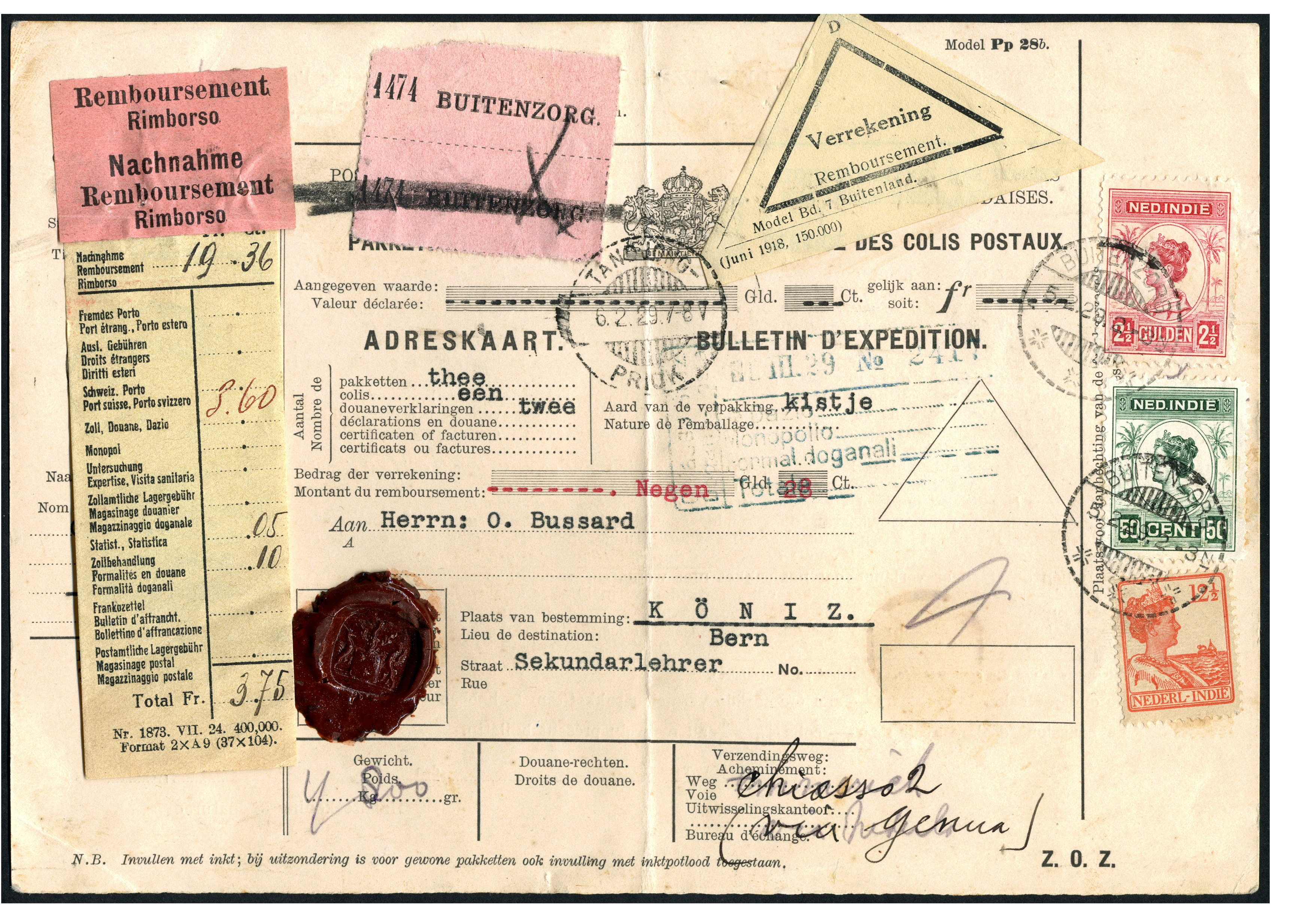 Complete adreskaart voor een postpakket van 4800 gram gefrankeerd met 12½ cent type scheepje, 50 cent en 2½ gulden type palmbomen, van Buitenzorg 5-2-1929 onder rembours verzonden via Tandjong-/Priok 6-2 en Chiasso naar Könitz,
