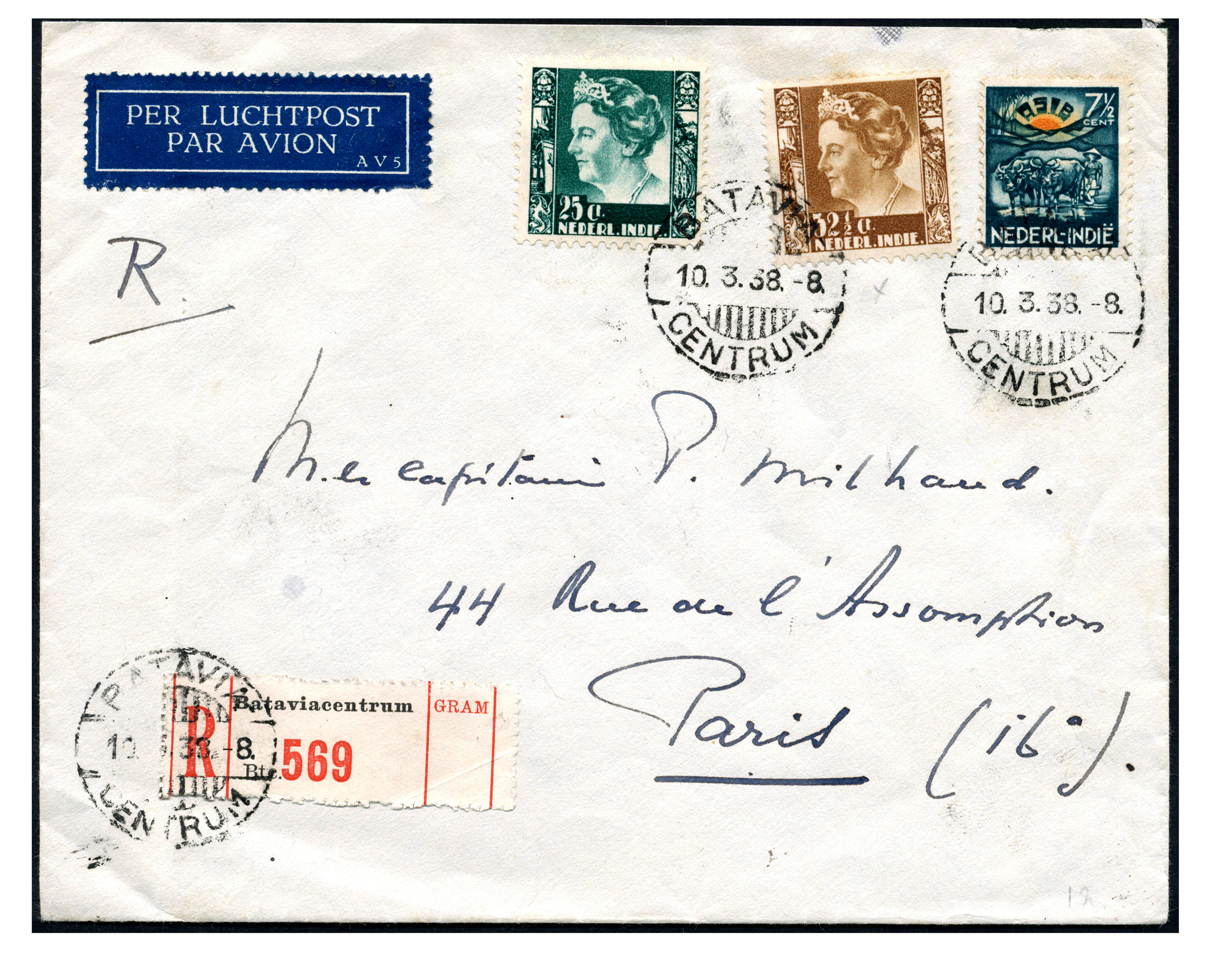 Met 7½ cent nr. 232, 25 en 32½ cent nrs. 199 en 201 gefr. couvert tussen 0-10 gram van Batavia- / Centrum 10-3-1938 aangetekend en per luchtpost verz. naar Parijs 18(€)-3. Port: 15, R-recht 20 en luchtrecht 0-10 gram 30 cent = 65