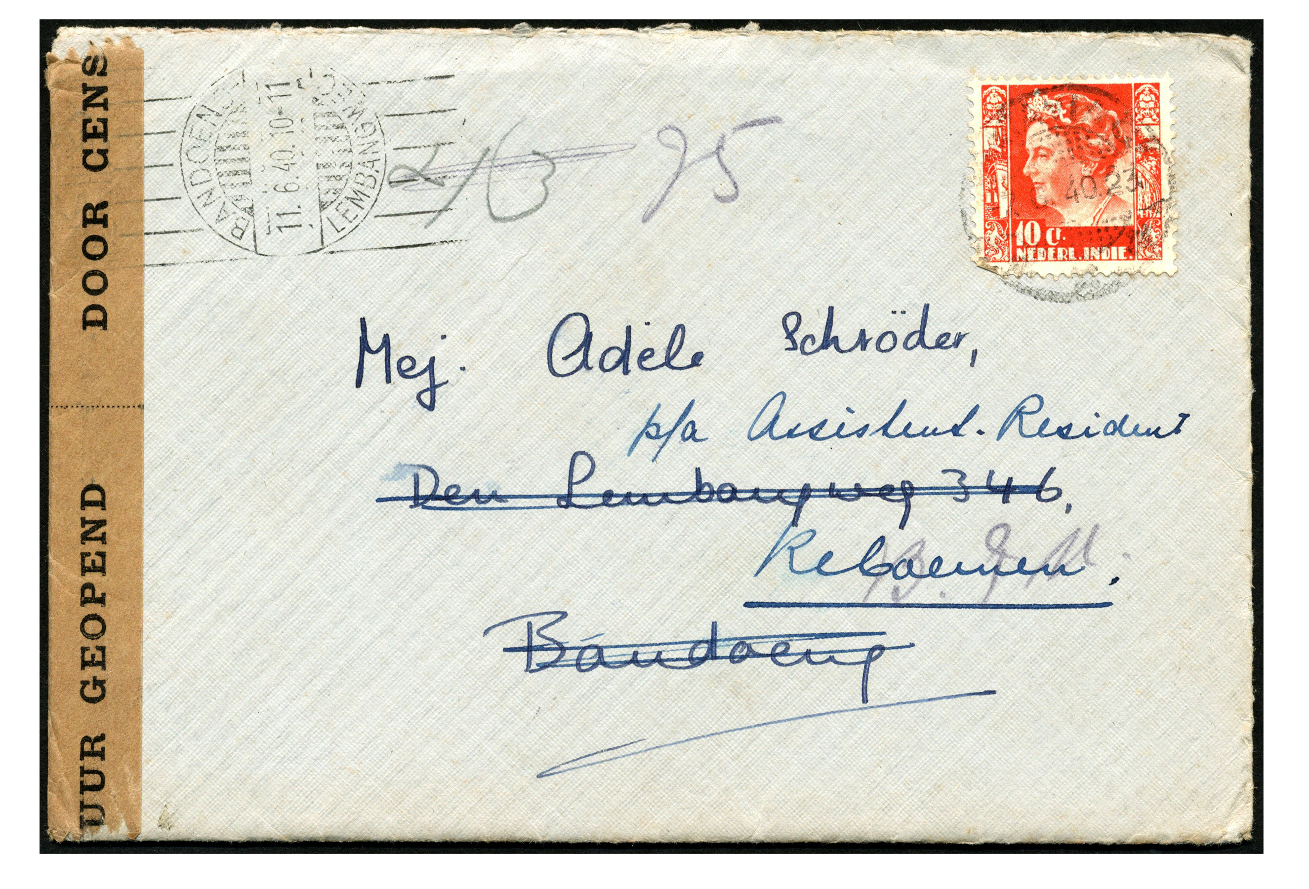 Handrolstempel BANDOENG- / LEMBANGWEG van 11-6-1940 op gecensureerde envelop met originele inhoud van Batavia 7-6-1940 naar Bandoeng, adres Lembangweg 346, doorgezonden naar Keboemen met als doorgangsstempel het rolstempel (Bu. type 4,