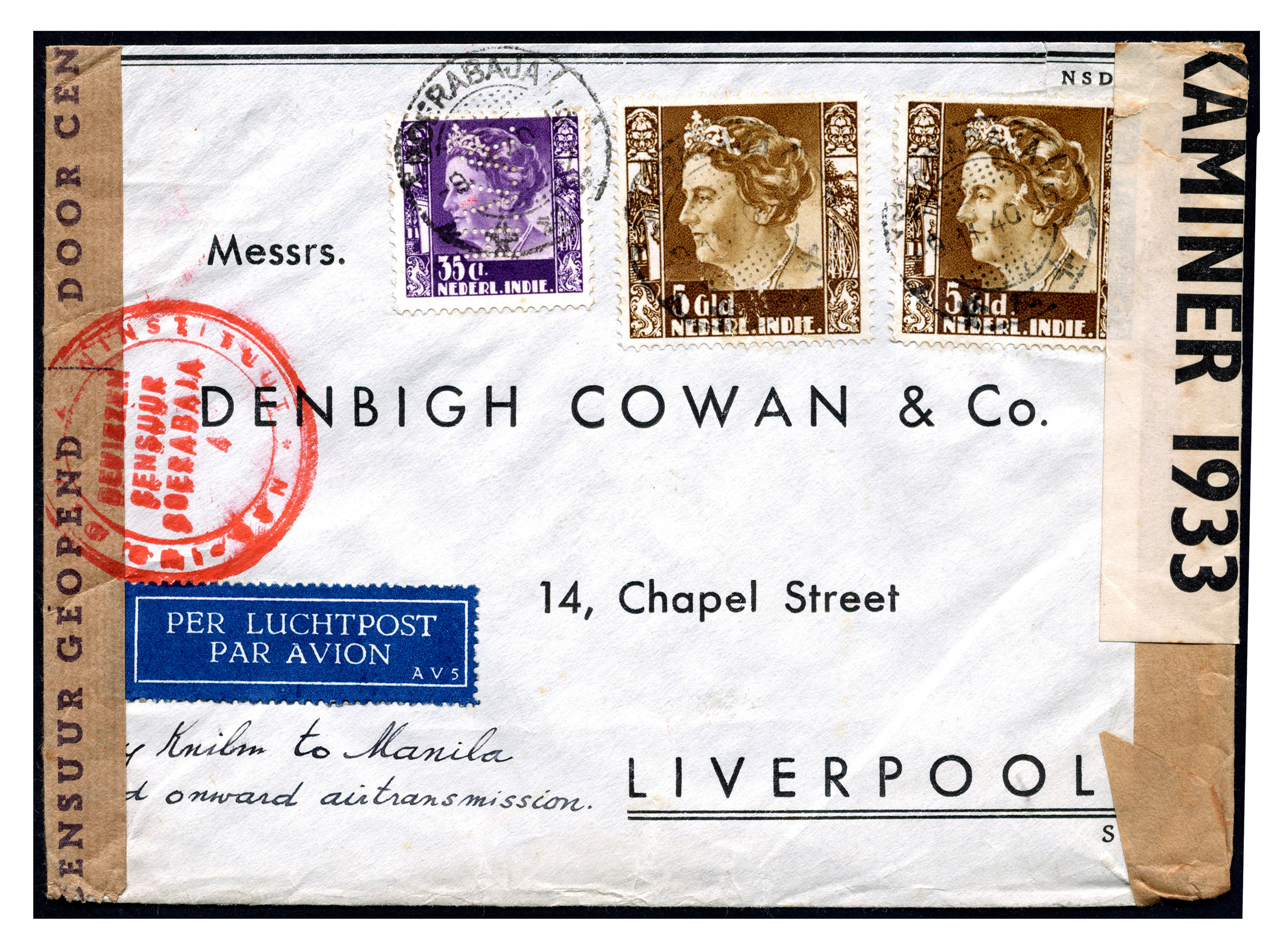 Firmacouvert (bovenkant iets ingekort) gefr. met 35 cent Kreisler met firmaperforatie H.V.A. en 2x 5 gulden, van Soerabaja 9-11-1940 (type PV2) 'by Knilm to Manila and onward airtransmission' naar Liverpool, gecensureerd in Soerabaja,