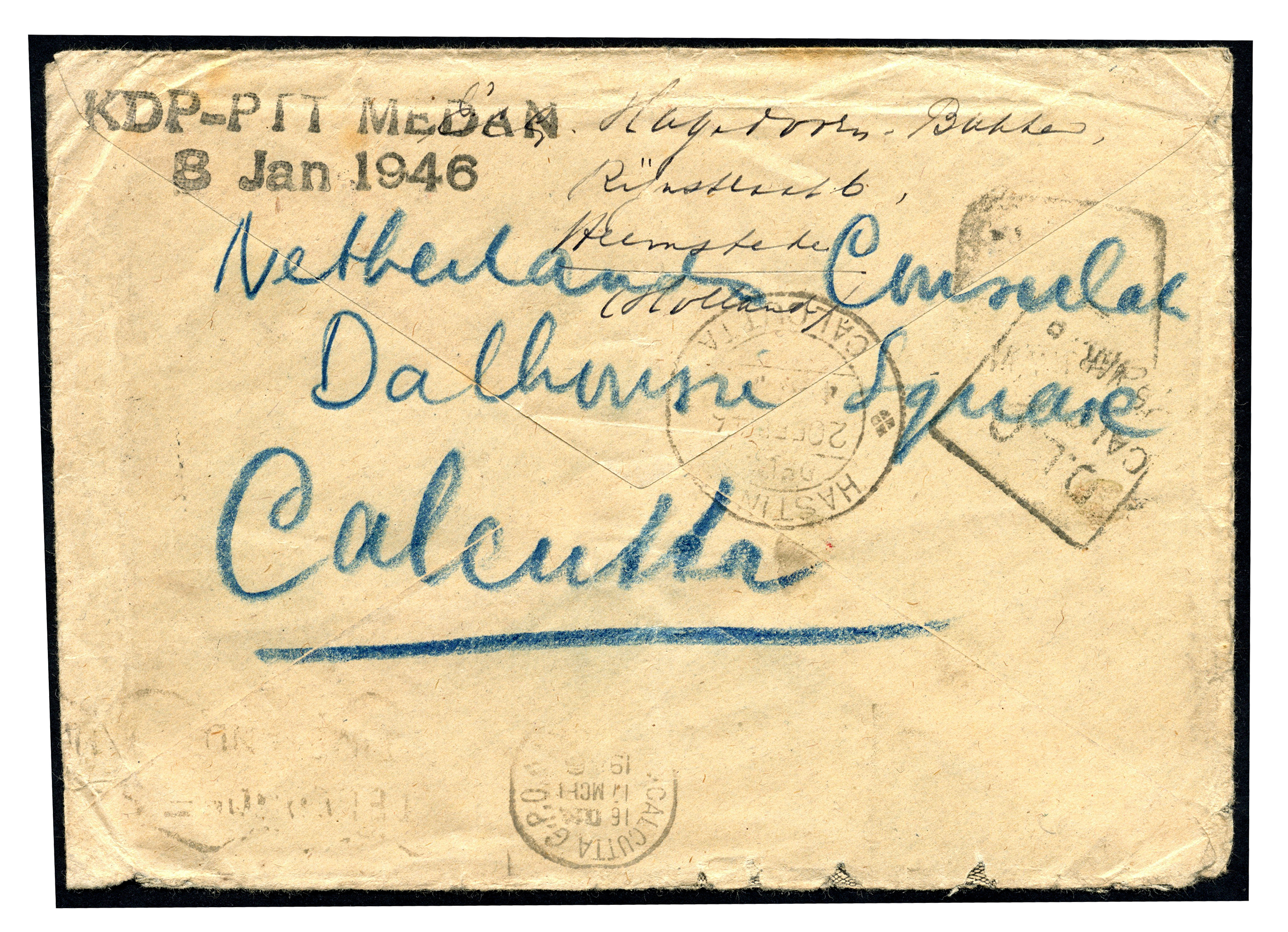 Zwerfbrief gefr. met 12½c en 2x 40c Lebeau van Heemstede 15-10-1945 per luchtpost naar een officier in Colombo, Ceylon. Vandaaruit begon de zwerftocht naar o.a. Singapore, Medan, Calcutta, met talrijke postale notities en stempels aan de