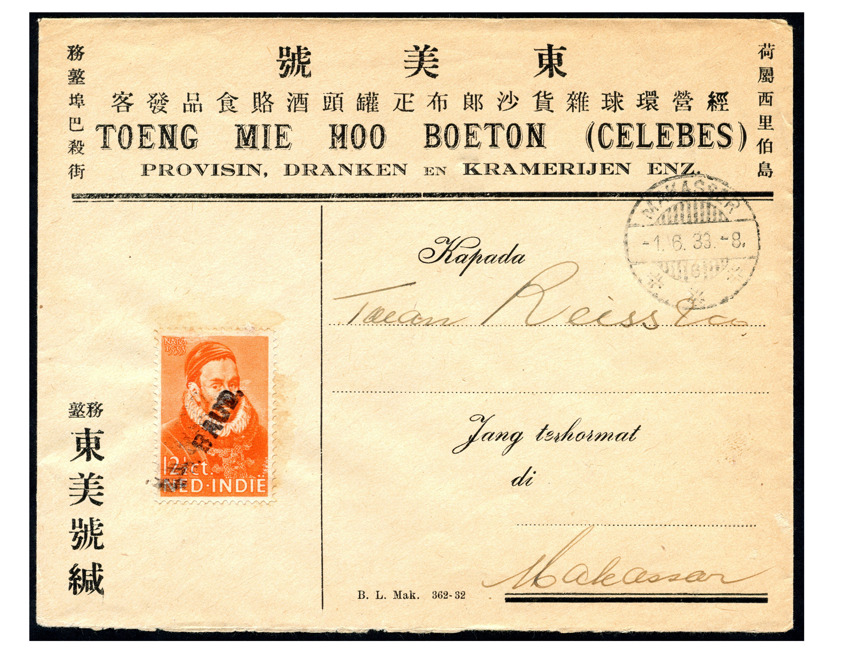 KPM. Prachtige firma-envelop uit Boeton gefr. met 12½c nr. 180 in zwart afgest. met KPM-naamstempel 'S.S. BAUD' naar Makasser 1-6-1933 (Image)