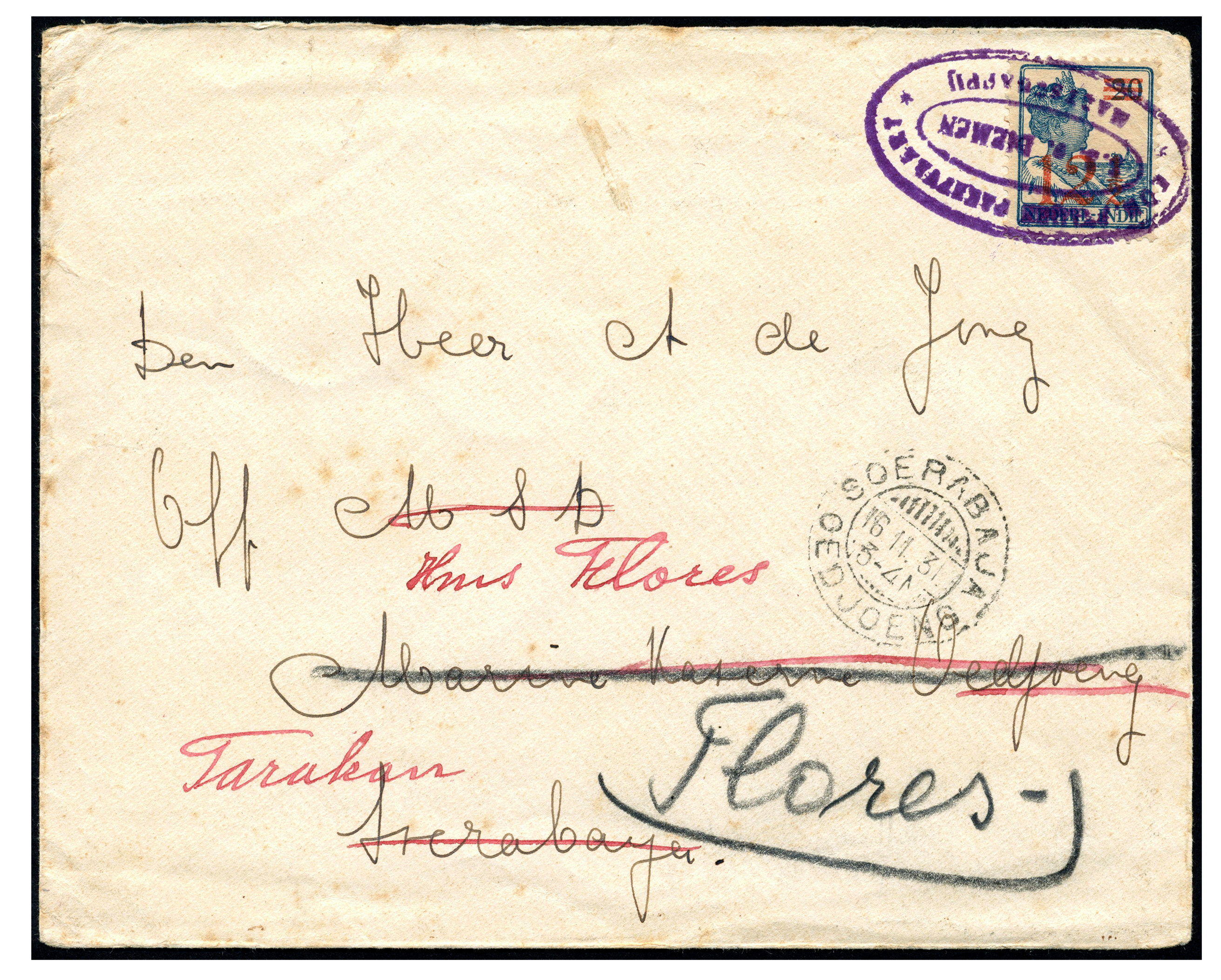 KPM. Env. gefr. met 12½ cent in violet afgest. met KPM-ovaalstempel 'S.S. v. DIEMEN' via Samarinda 12-11-1931 en Soerabaja 16-11 naar de Marine kazerne in Soerabaja/Oedjoeng, daar op 16-11 doorgezonden naar de 'Hms Flores' te Tarakan