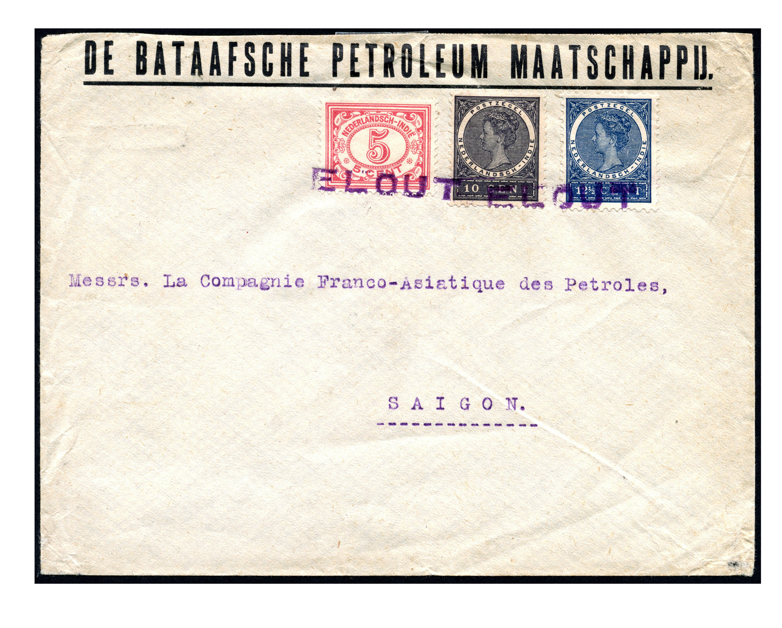KPM. Bedrijfsenvelop van de BPM gefr. met 5, 10 en 12½ cent, 2x in violet afgest. met groot KPM-naamstempel 'ELOUT', via Soerabaja 21-8-1914 naar Saigon 27-8-1914 (Image)