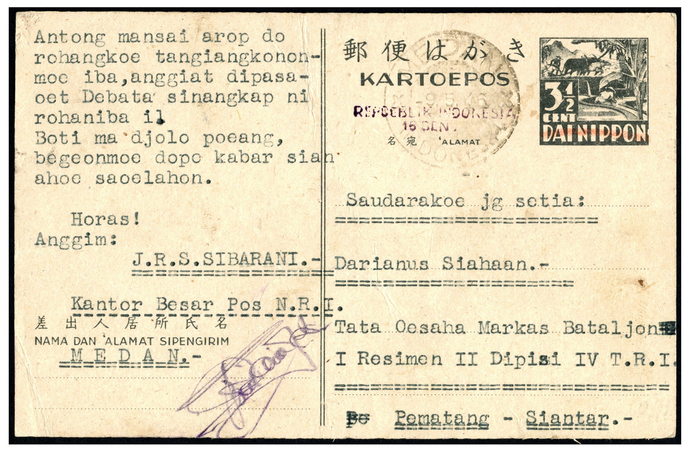 1785 on cover imageSumatra. 3½ Cent postcard type Kreisler from the Japanese occupation showing red pencil stroke through 'DAI NIPPON' and violet overprint 'Repoeblik Indonesia' (33 mm), rate 15 sen, Bu.RS 25, from Medan -9.5.46. to Pematang Siantar (Image)