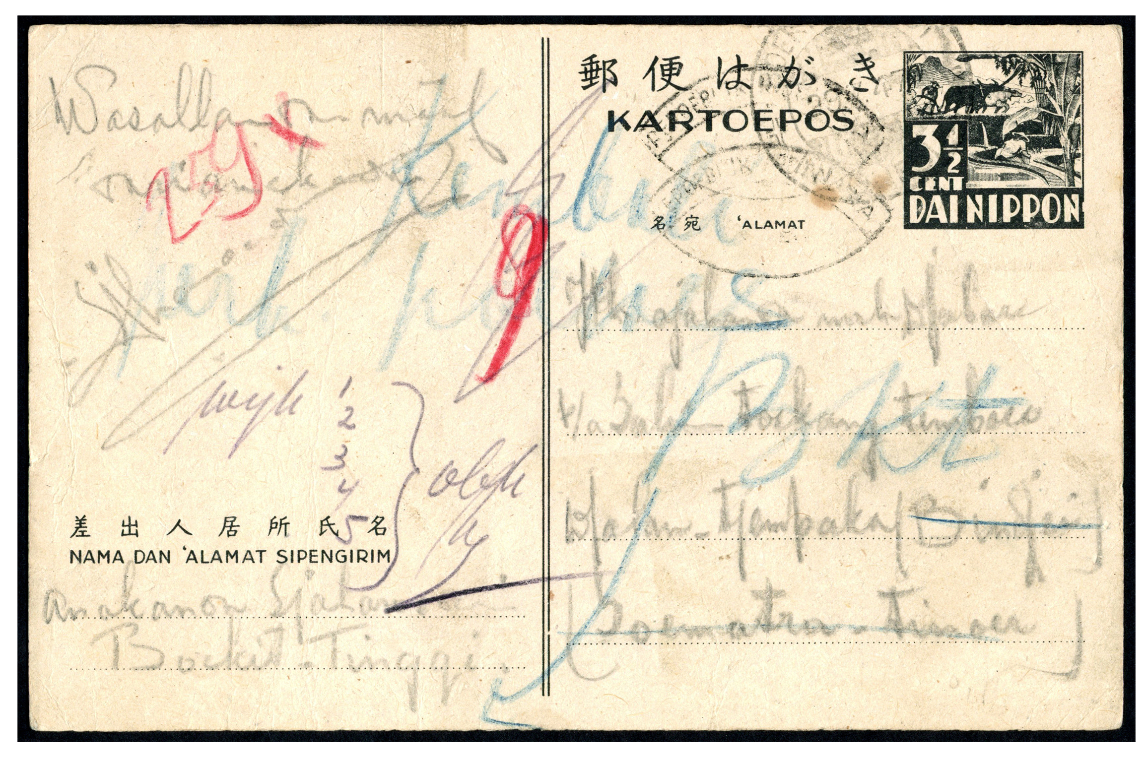 1783 on cover imageSumatra. 3½ Cent postcard type Kreisler from the Japanese occupation showing two postage paid marks 'T' in violet, rate 15 sen, Bu.RS N 14, from Padangsidempoean 16.2.46. to Medan. Scarce card (Image)