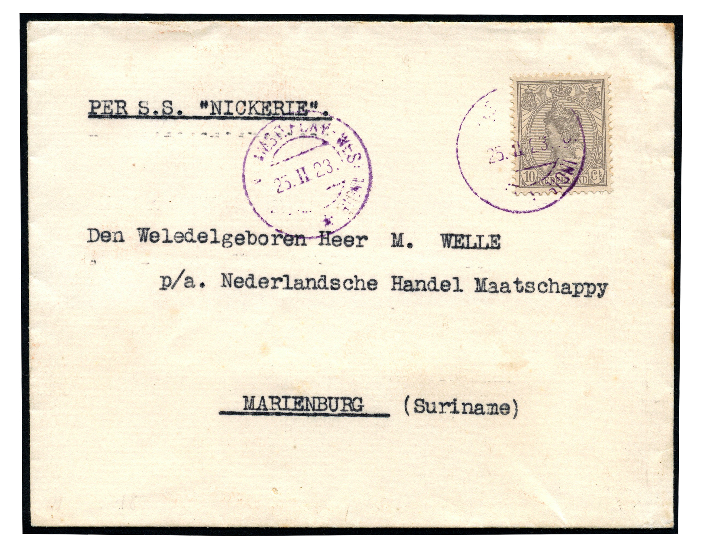 1791 on cover imageScheepspost. Env. gefr. met Ned. 10 cent Bontkraag 2x licht violet afgest. POSTAGENT AMSTERDAM - WEST INDIË 25-2-1923 met het S.S. Nickerie via Paramaribo 25-2 naar Mariënburg. Zie: ES, deel II, type 29.4.4a. Zeer zeldzaam! (Image)