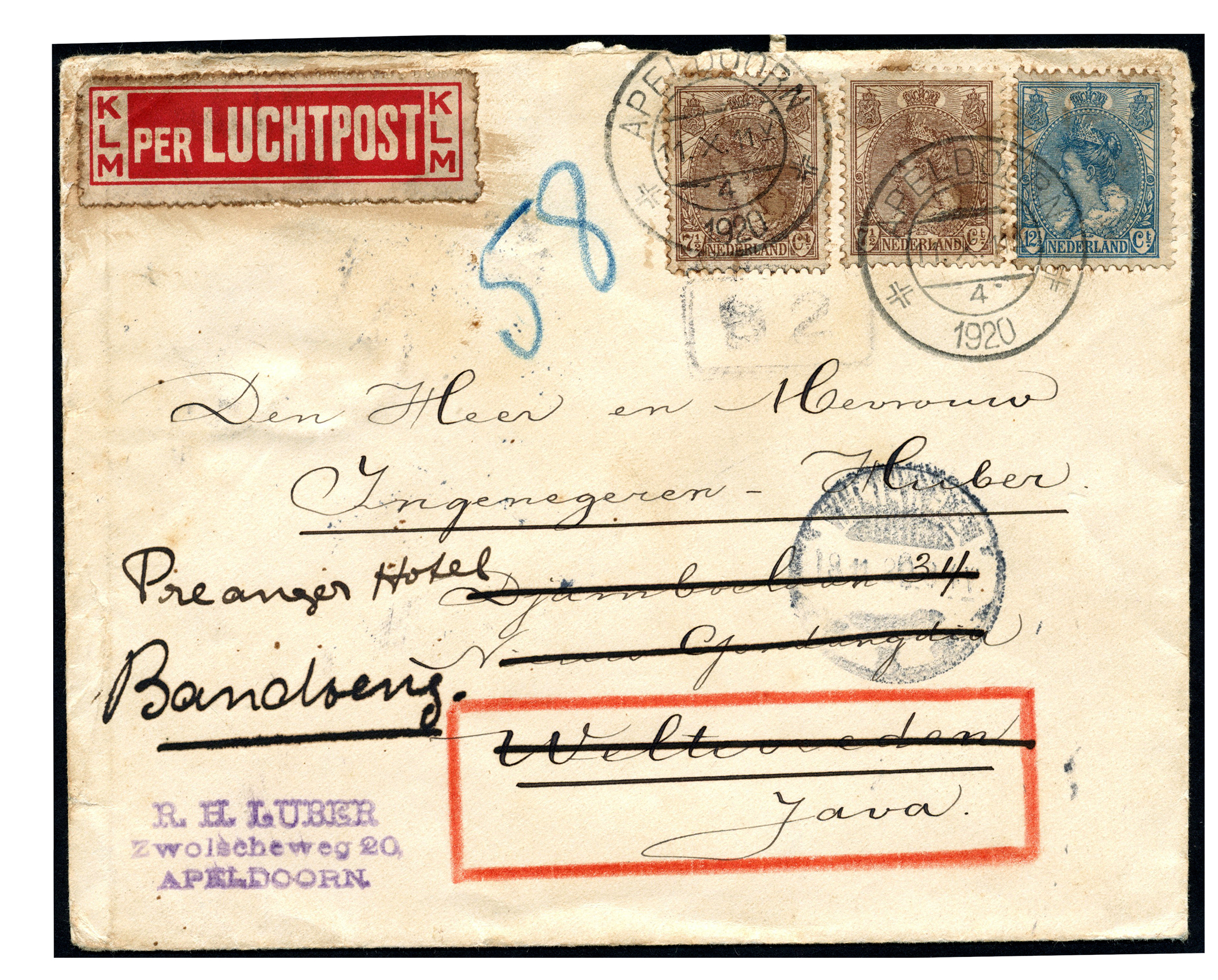 1792 on cover imageProefdienst. Envelop gefr. met 2x 7½ cent en 12½ cent Bontkraag van Apeldoorn 11-10-1920 per luchtpost van Amsterdam (Schiphol) naar Londen (Croyden) en van daaruit per zeepost naar Weltevreden 15-11-1920, op 19-11 doorgezonden naar het Preanger Hotel te Bandoeng 19-11. Links boven luchtpoststrookje type a, op de achterzijde een KLM-etiket 'Zendt uwe brieven PER LUCHTPOST' in rood, wit en blauw. Tarief: briefport 2e gew. klasse 12½ cent + luchtrecht 15 cent per 20 gram. Zie o.a. TSchroots deel 1, p.140-141, 146-147. Pennotitie op de az. 'totaal 2 briefk. en 6 brieven w.v. één drukwerk.' Het couvert vertoont wat gebruikssporen, maar is een vroeg en zeldzaam luchtpoststuk, mede door het gebruik van het KLM-etiket (Image)
