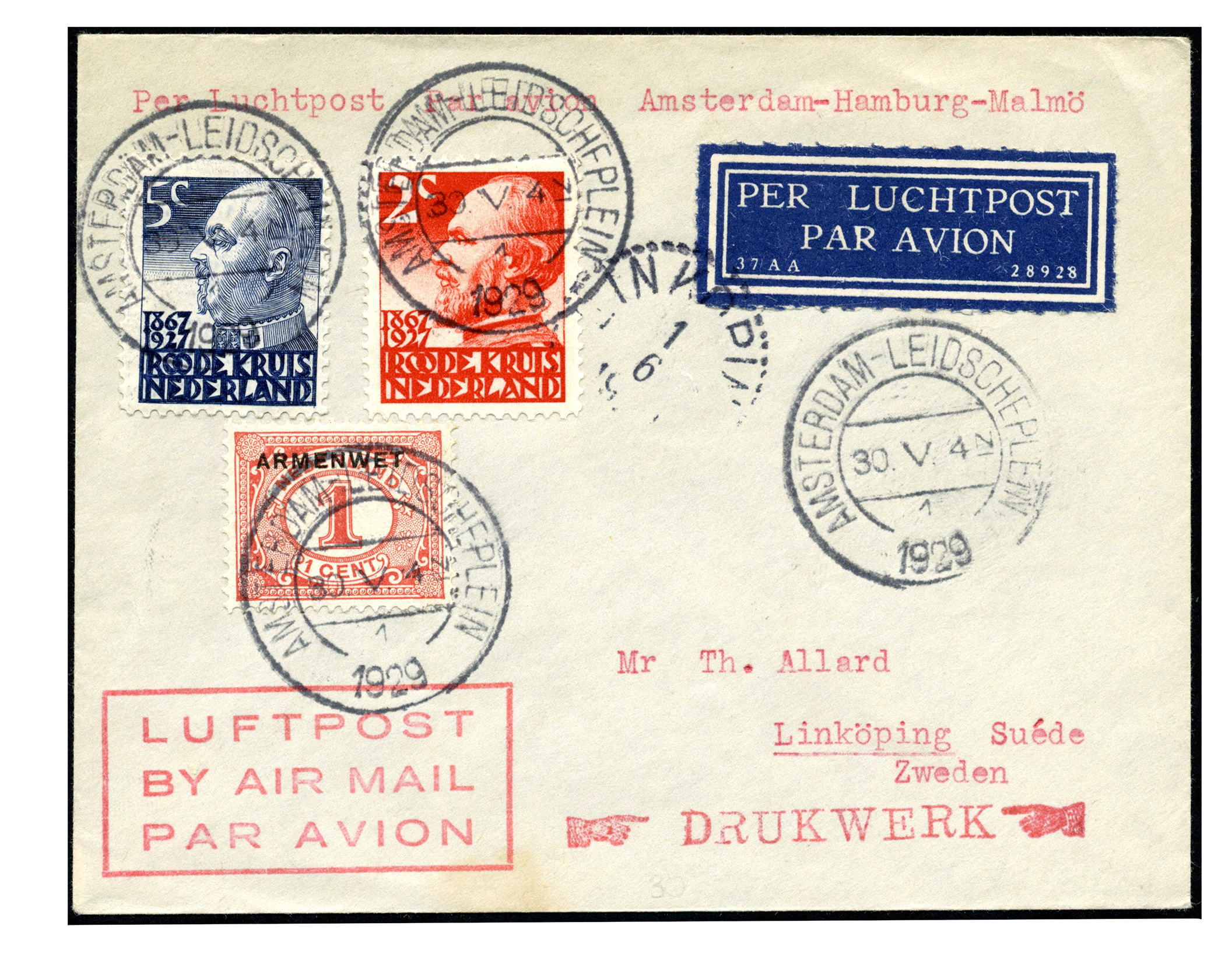 1794 on cover imageAantrekkelijk met nrs. 203, 205 en Armenwet (!) D1 gefrankeerde, als drukwerk verzonden envelop van Amsterdam-Leidscheplein 30-5-1929 met een nachtpostvlucht van dienst VII C-1929 via Kopenhagen naar Malmö en verder naar Linköping 1-6-1929. Tarief: drukwerk buitenland 2½ cent + luchtrecht naar Zweden 5 cent. Zie: TSchroots deel 1, p.288 (Image)