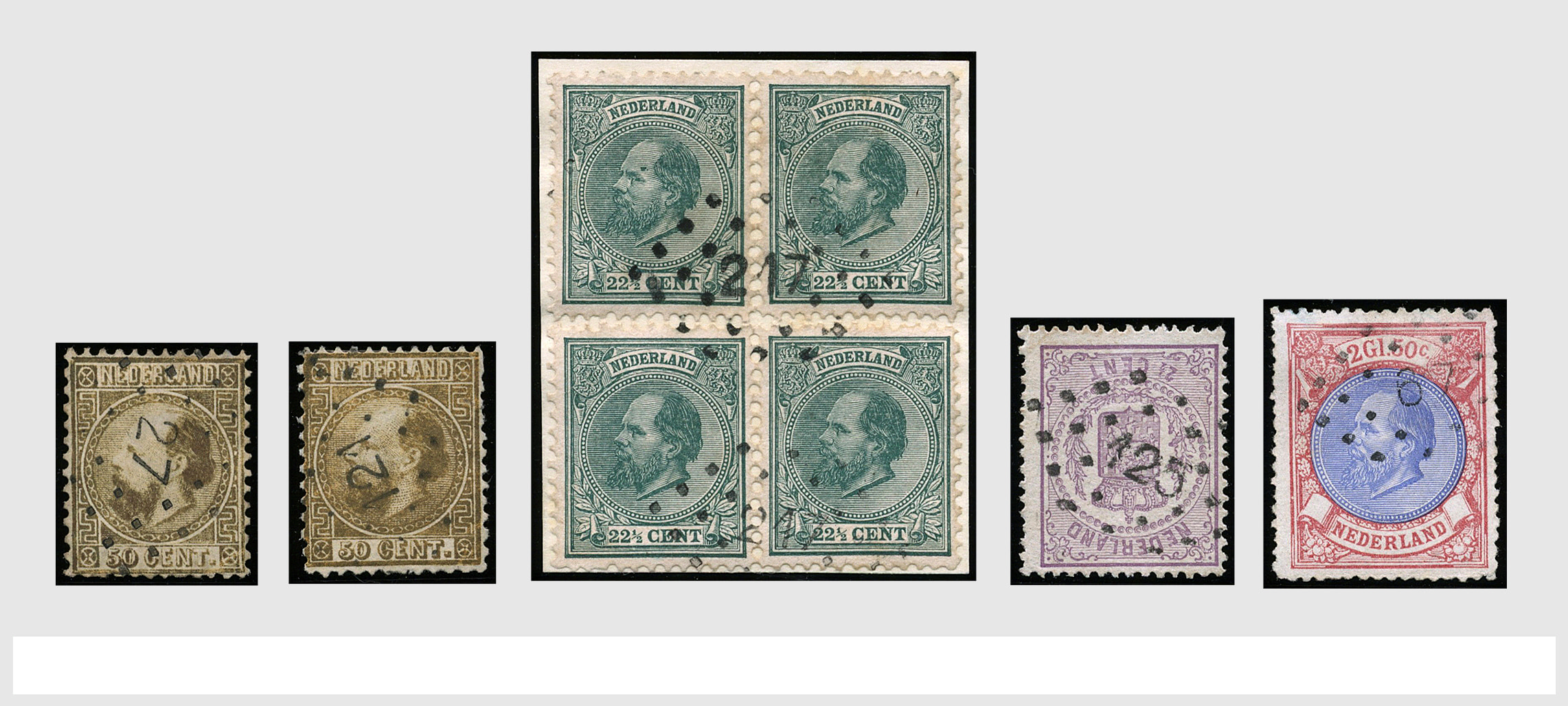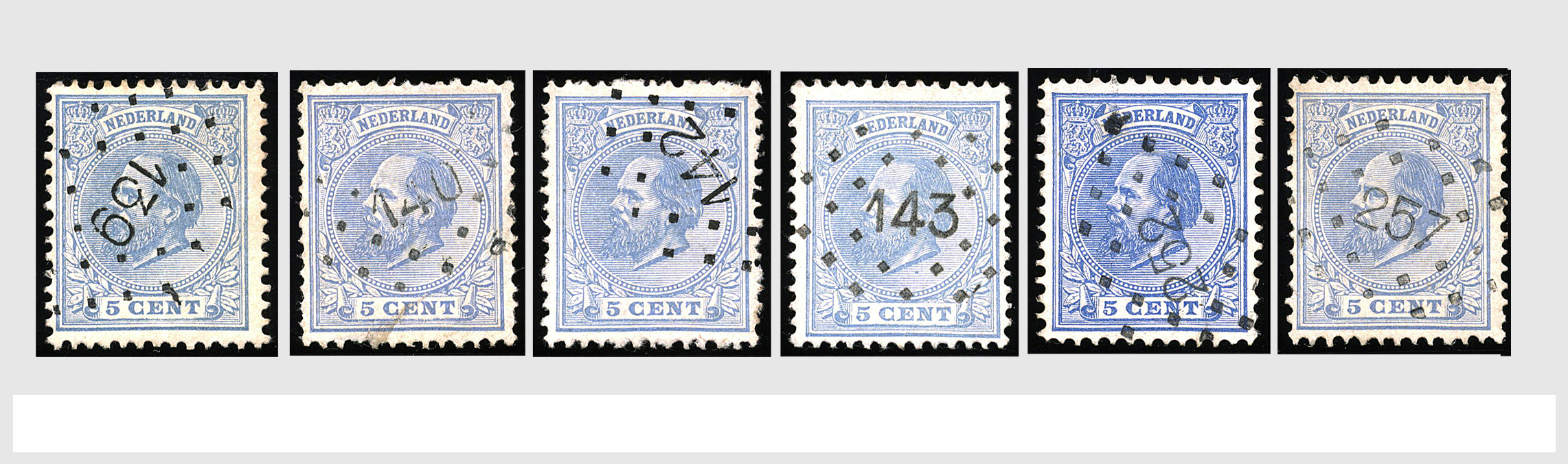 1801 imagePUNTSTEMPELS, 80 stuks, meest mooie afdrukken op emissies 1867 en 1872 en iets overig, waarbij diverse betere ex! (Image) (Image2) (Image3) (Image4) (Image5)