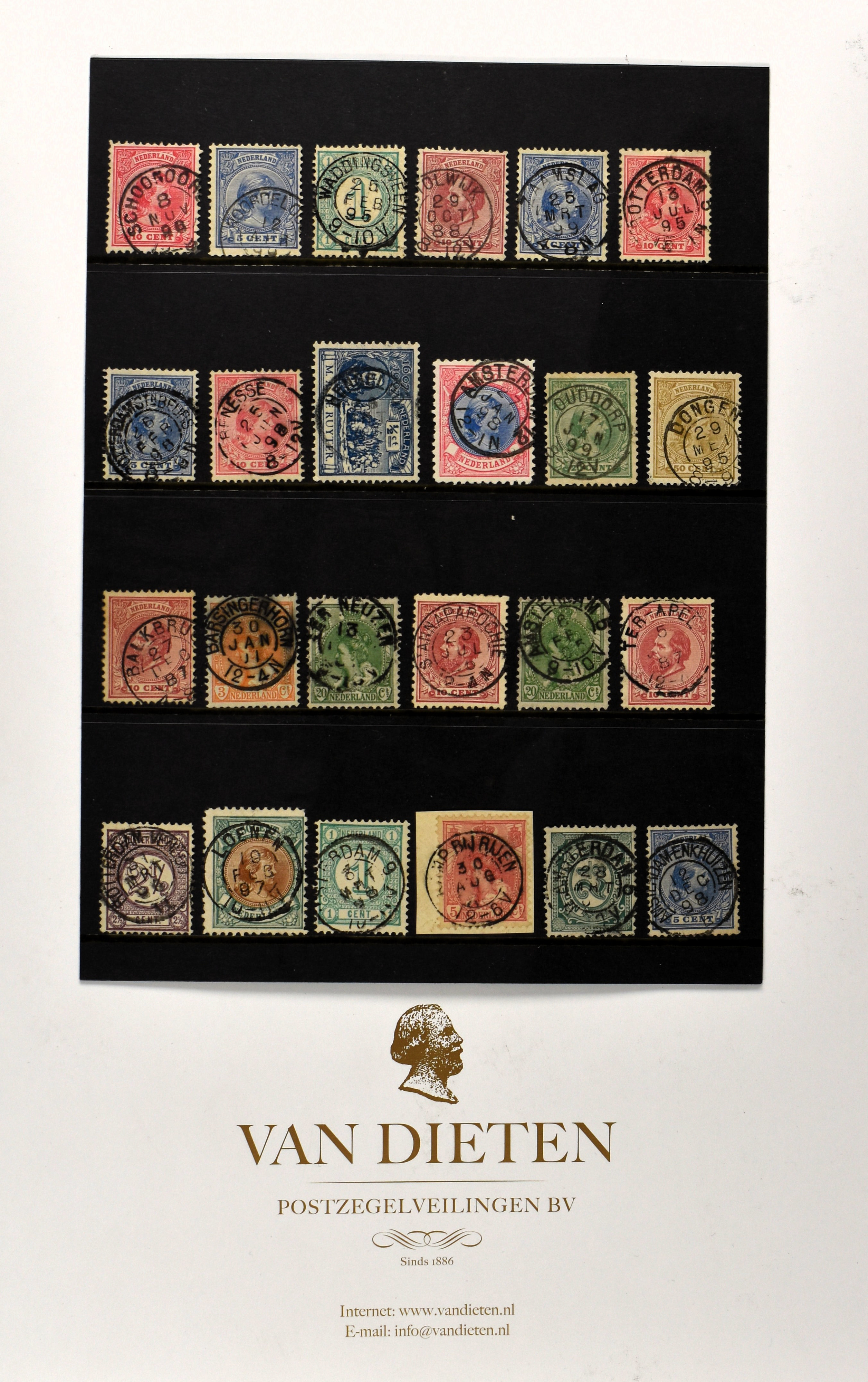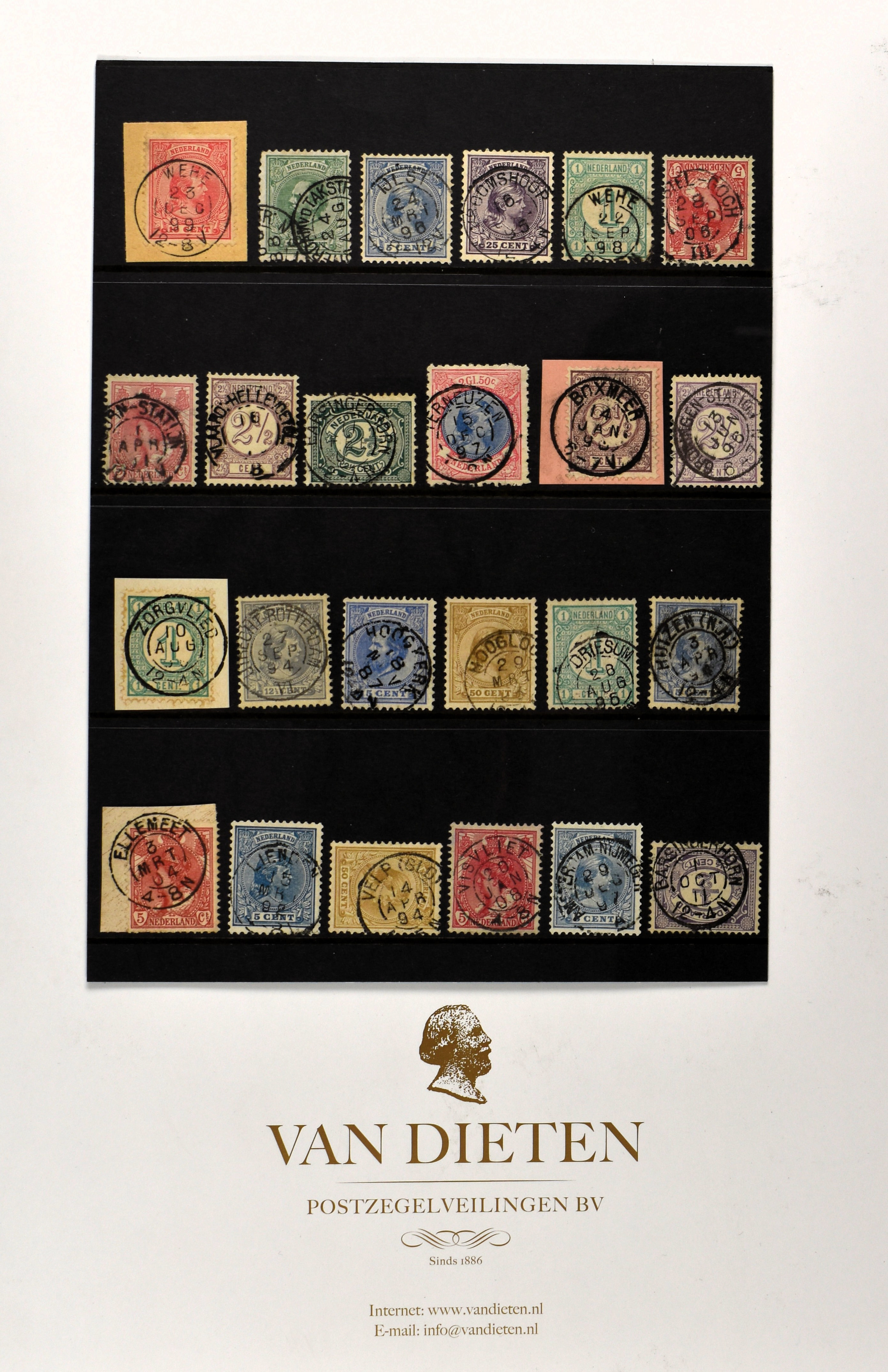 1802 imageSTEMPELS op diverse losse zegels voornamelijk emissies 1867-1891 w.o. naamstempel Bennebroek op 2x nr. 8 tot paar samengevoegd, kleinrond Rotterd:-Vlissingen op 2 cent, etc. en tevens nr. 121H met velrand waarin dubbele perforatie (Image)