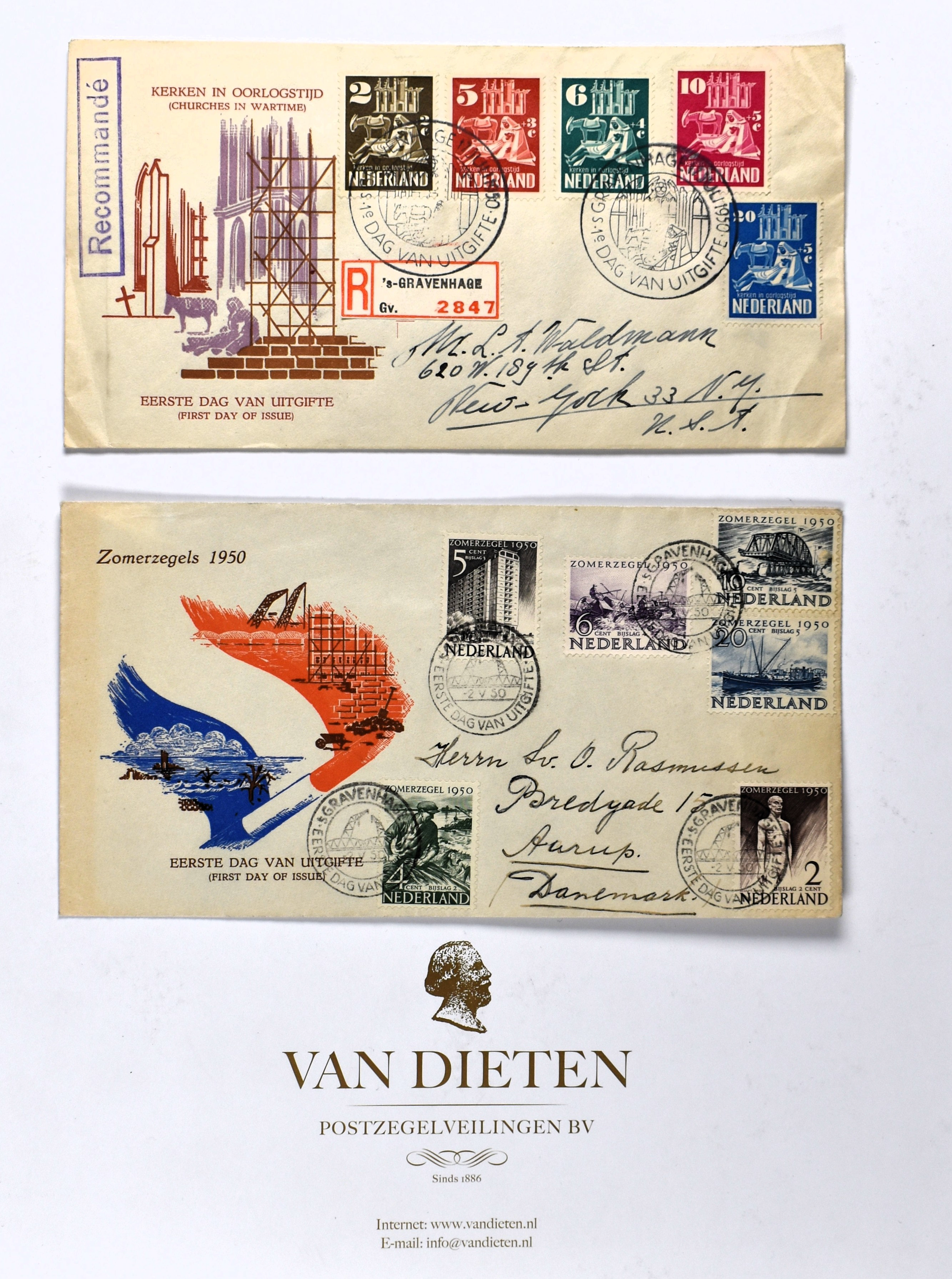 1852 imageFDCs E1, Zomer 1950, netjes beschreven en met gesloten klep, E2, Kerken in oorlogstijd, netjes beschreven en met open klep, en de nrs. E3, E4 en E5 met getypte adressen en alle met open klep. € 3600 (Image) (Image2) (Image3)