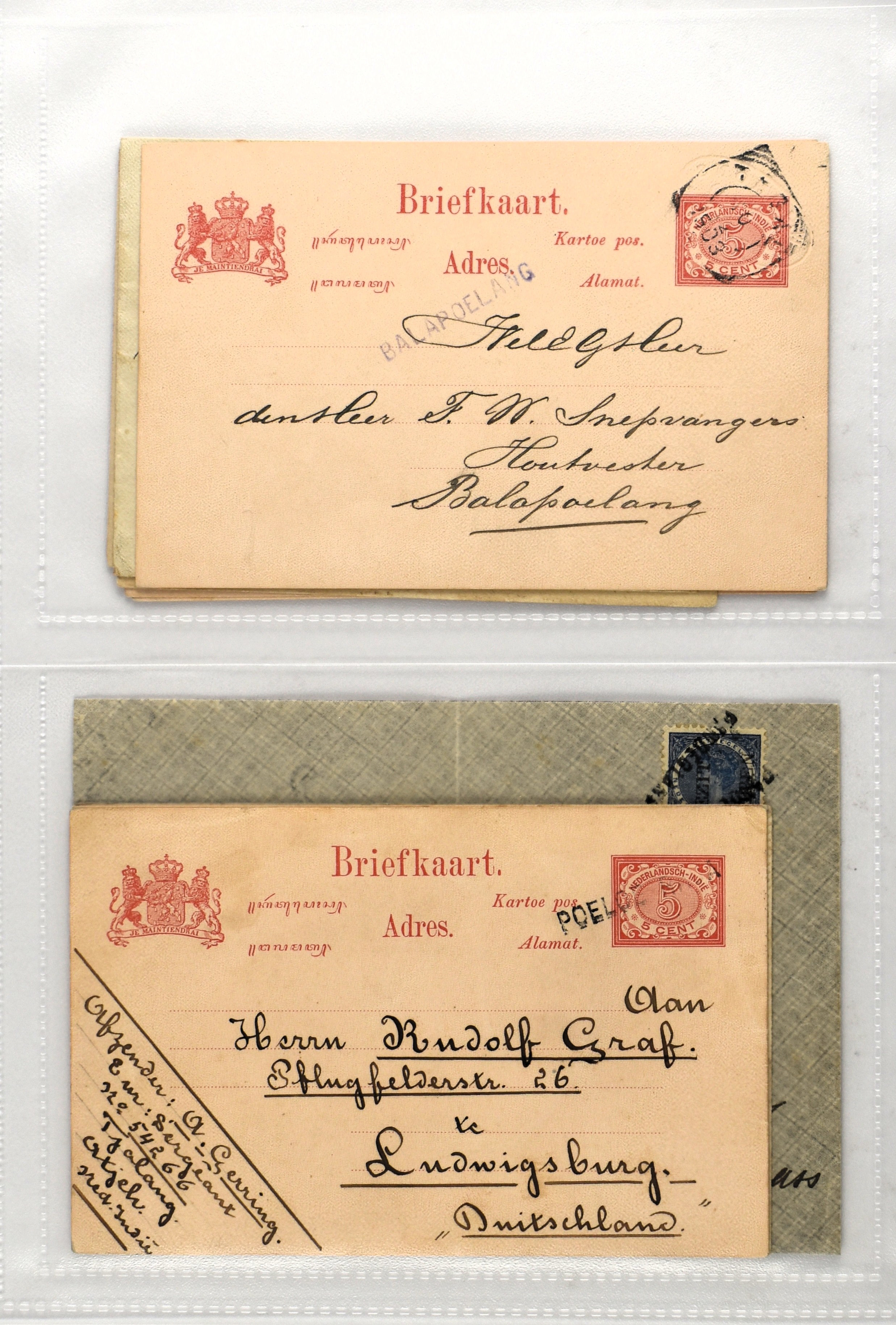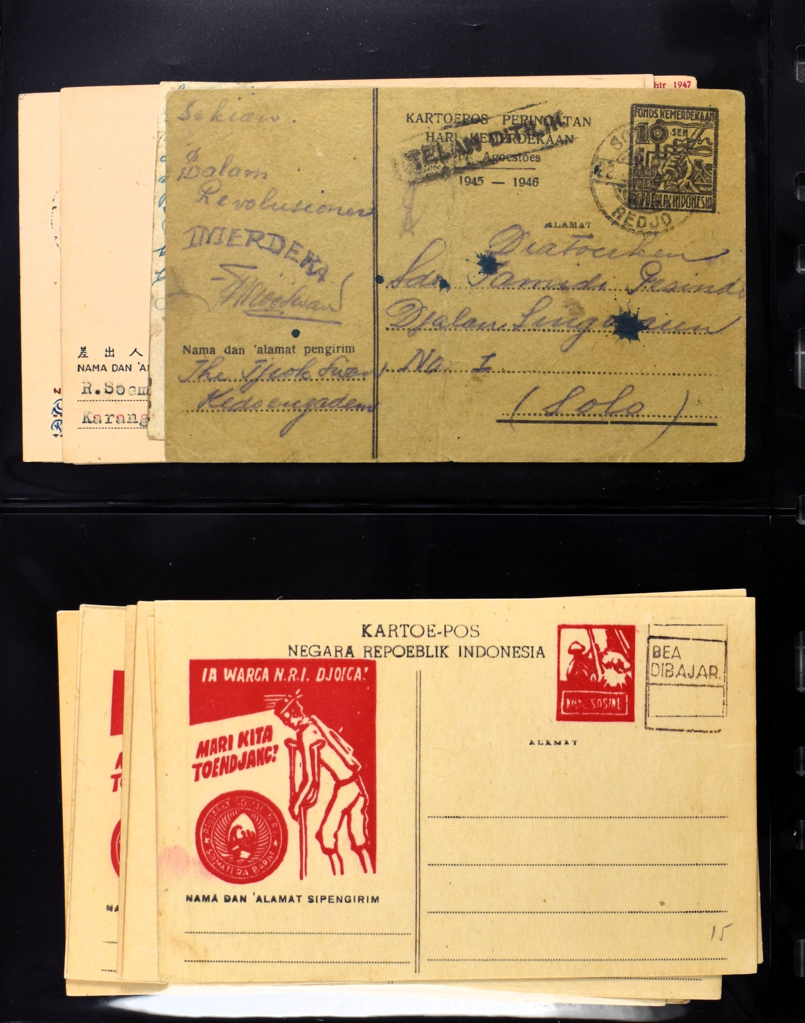 1864 imageINDONESIA REVOLUTION PERIOD, more than 75 unused and sent postcards, both from Java and Sumatra, including duplicates, some showing propaganda cachets (several types of 'Batoe Toedjoean Merdeka' and 'Bantoelah Pindjaman Nasional 1946', postage due T-marks (Sumatra), several open date bar cancellations, some nice postmarks such as Tjilatjap-/S6 (rare), censor marks, framed REPOEBLIK INDONESIA P.T.T. in red or back on 3 postcards, and so on (Image) (Image2) (Image3) (Image4) (Image5)