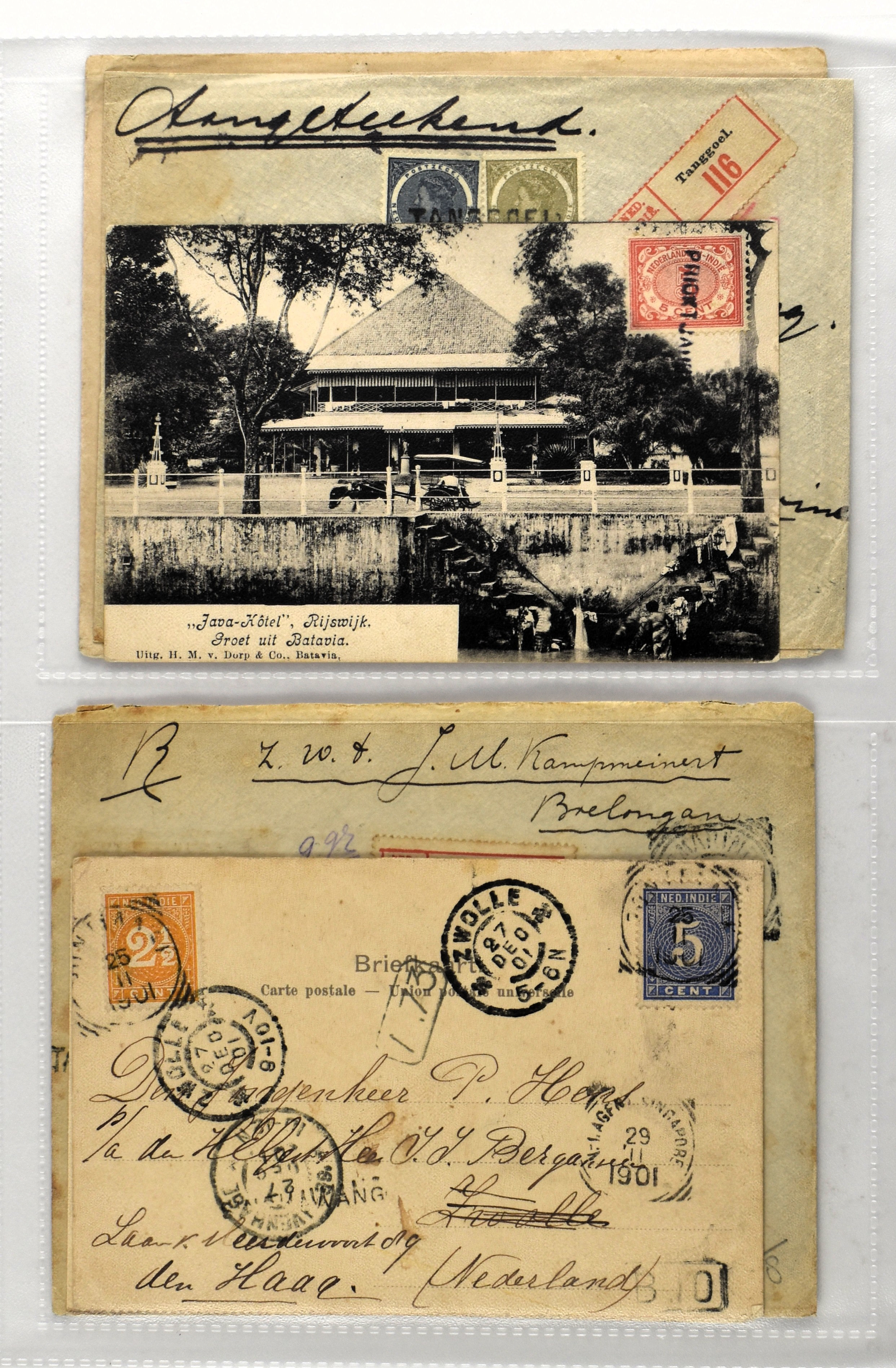 1854 imageNED.- INDIË POSTHISTORIE, 33 poststukken met naamstempels w.o. enige haltestempels, diverse mooie afstempelingen van betere kantoren als Karangsono, Ngebroek, Pelantoengan, Sinabang, Tandjoengselor, Tanggoel (op envelop met R-strookje) en in verschillende kleuren w.o. blauw, violet, rood (Image) (Image2) (Image3)
