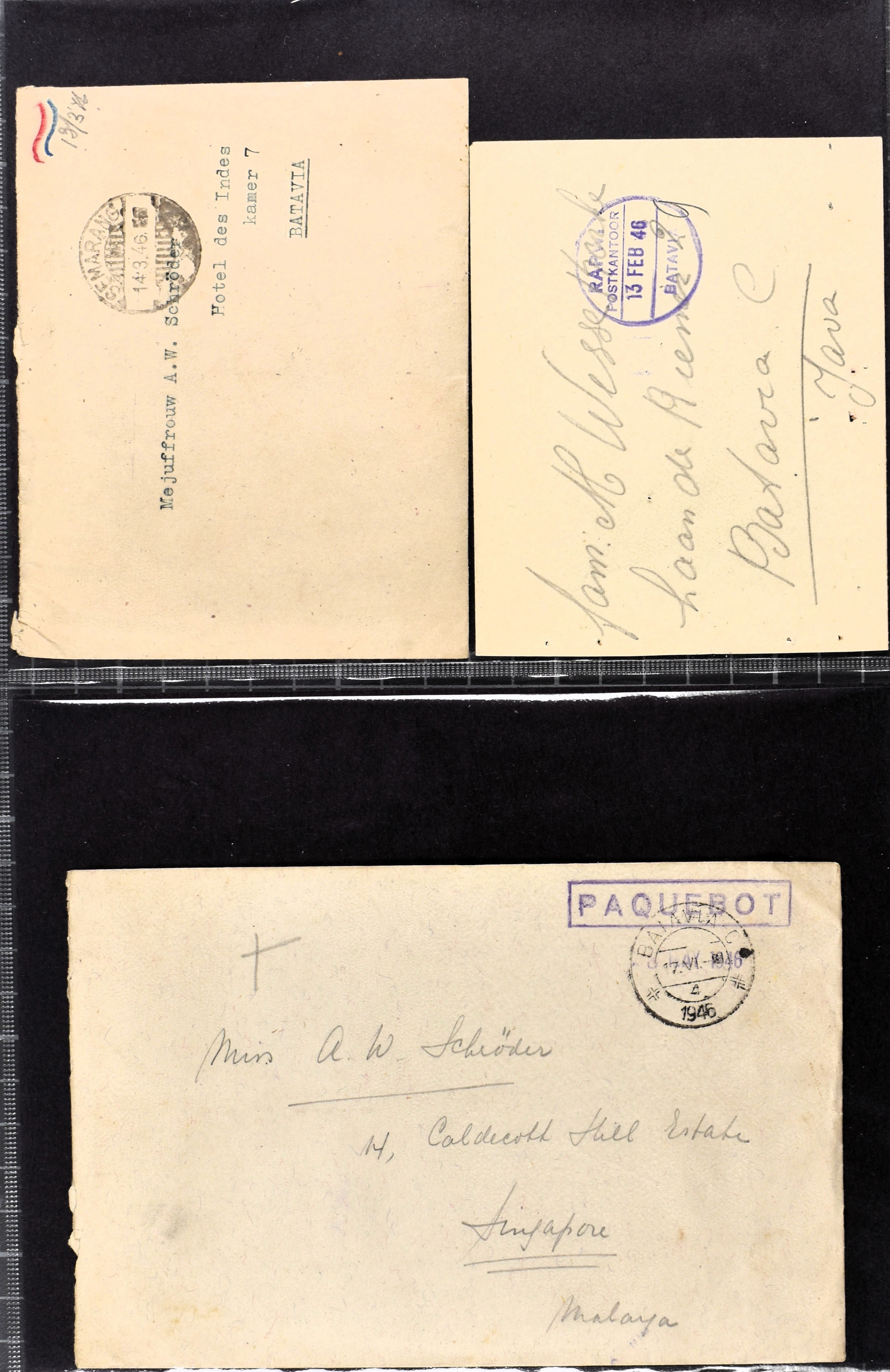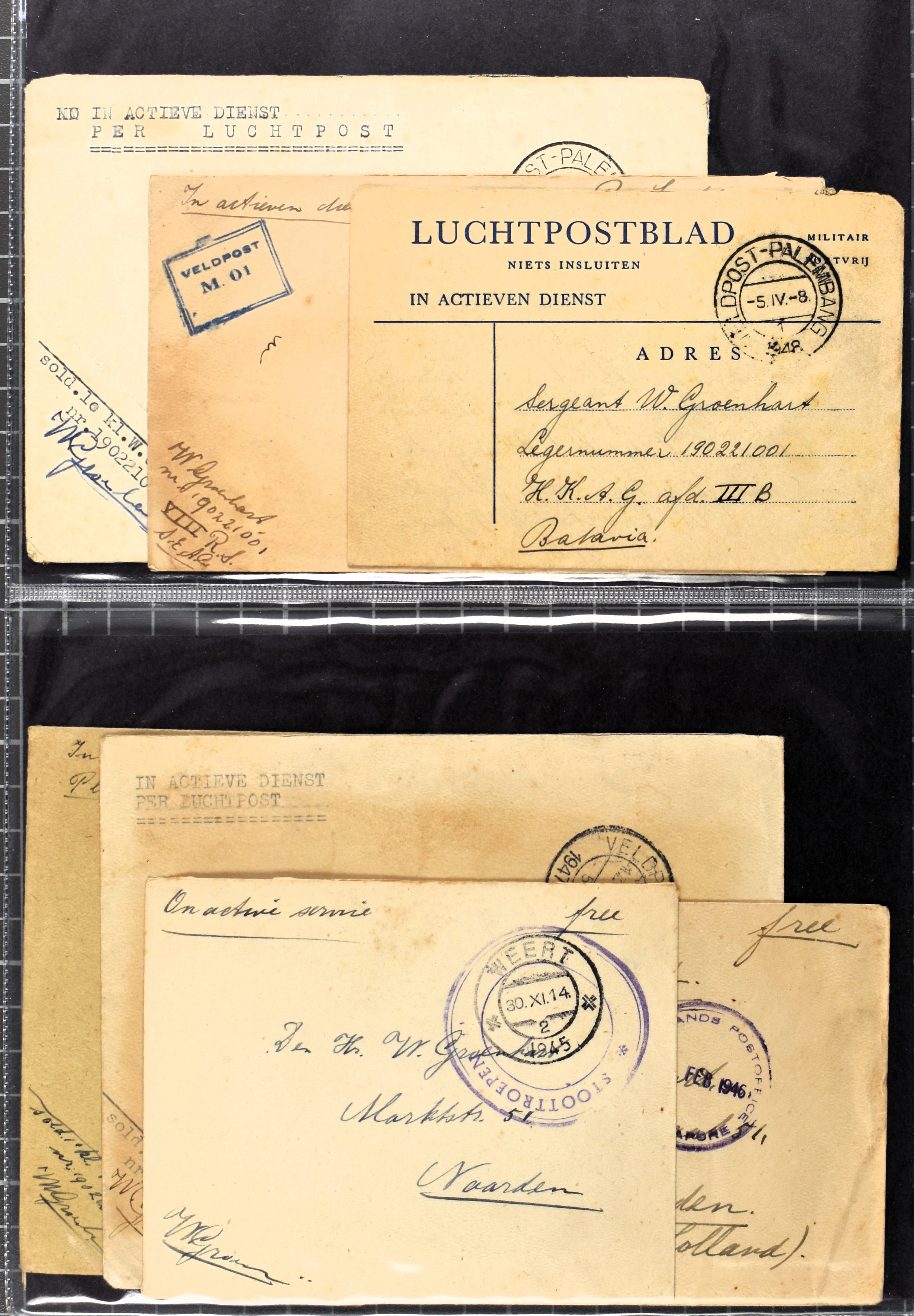 1855 imageNED.- INDIË POSTHISTORIE, 13 veldpoststukken/on active service 1945-48 uit een familiearchief in gevarieerde kwaliteit, w.o. Rode Olifant Y-Brig en Denpasar (Bu. NM 6a, 6b), Veldpost M. 01 (Makasser, Bu. NM 9), Biak in rechthoek (Bu. type Y) en P.O. Singapore (Bu. 6) (Image) (Image2)