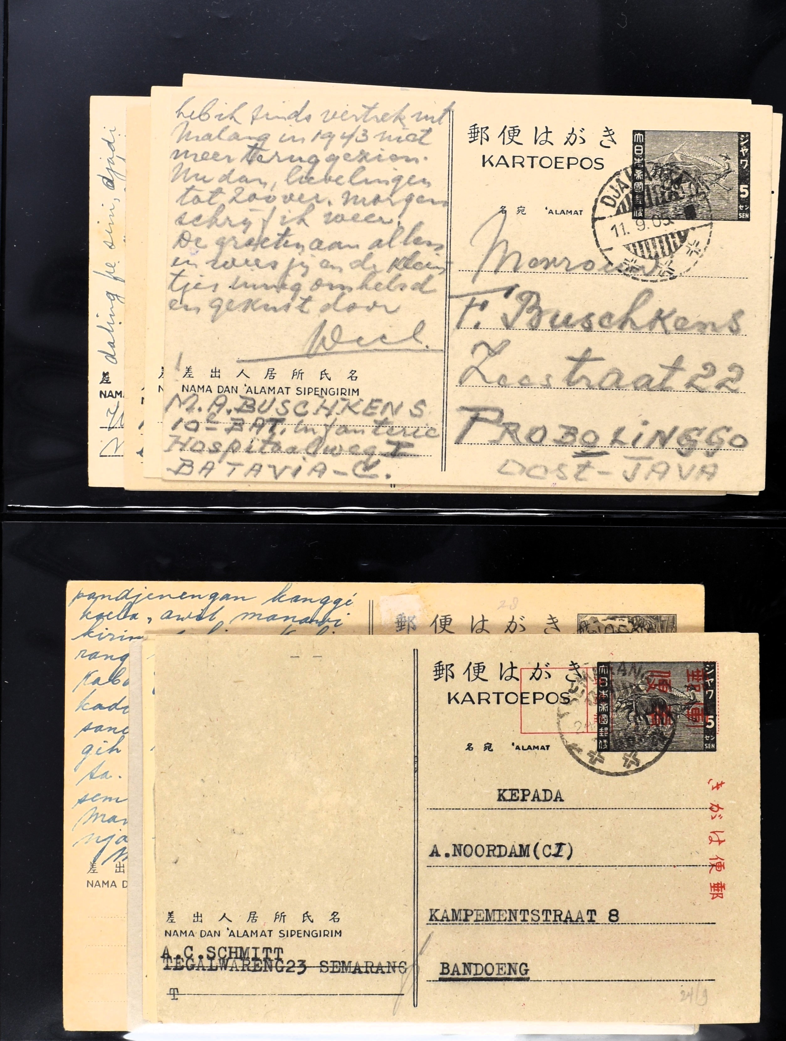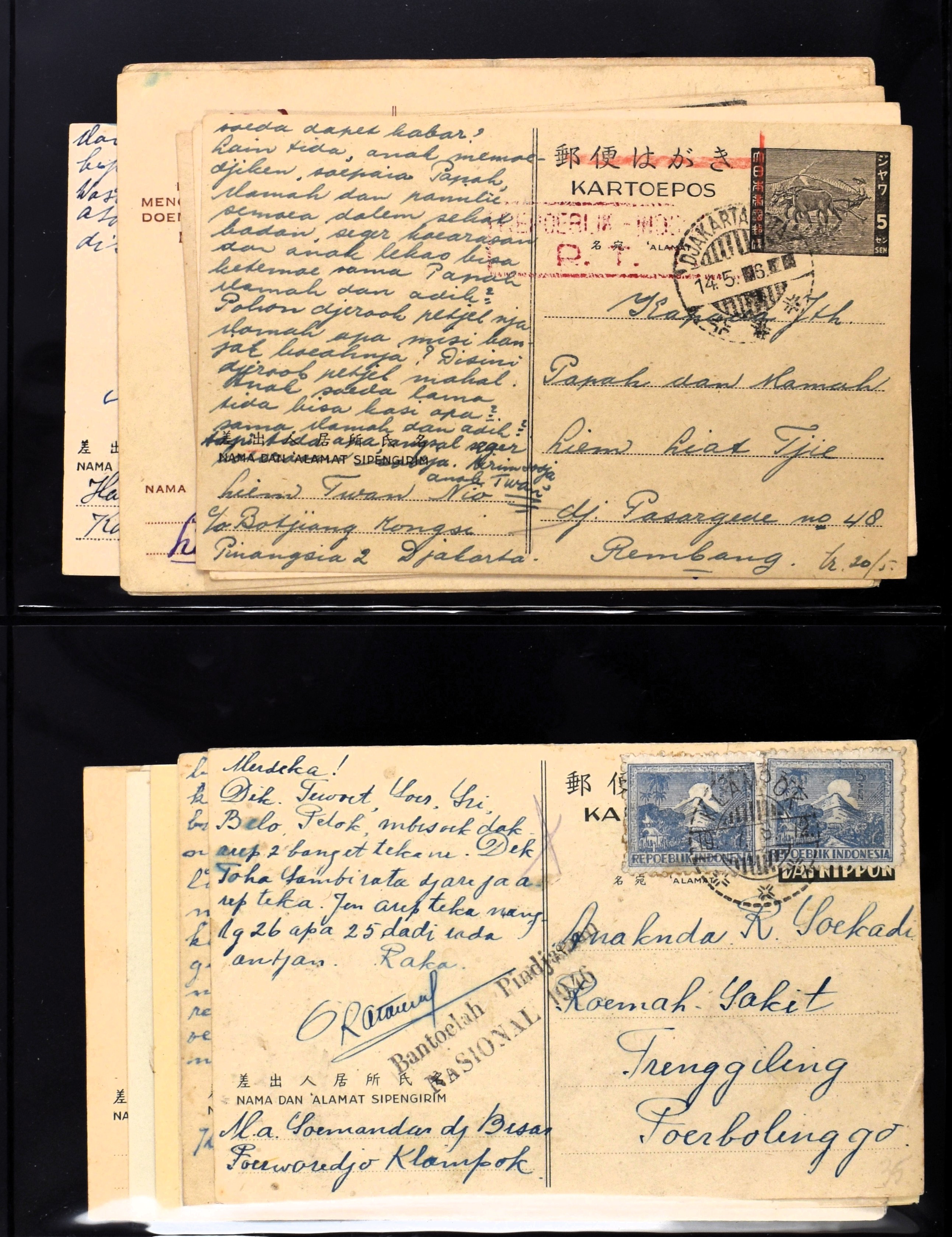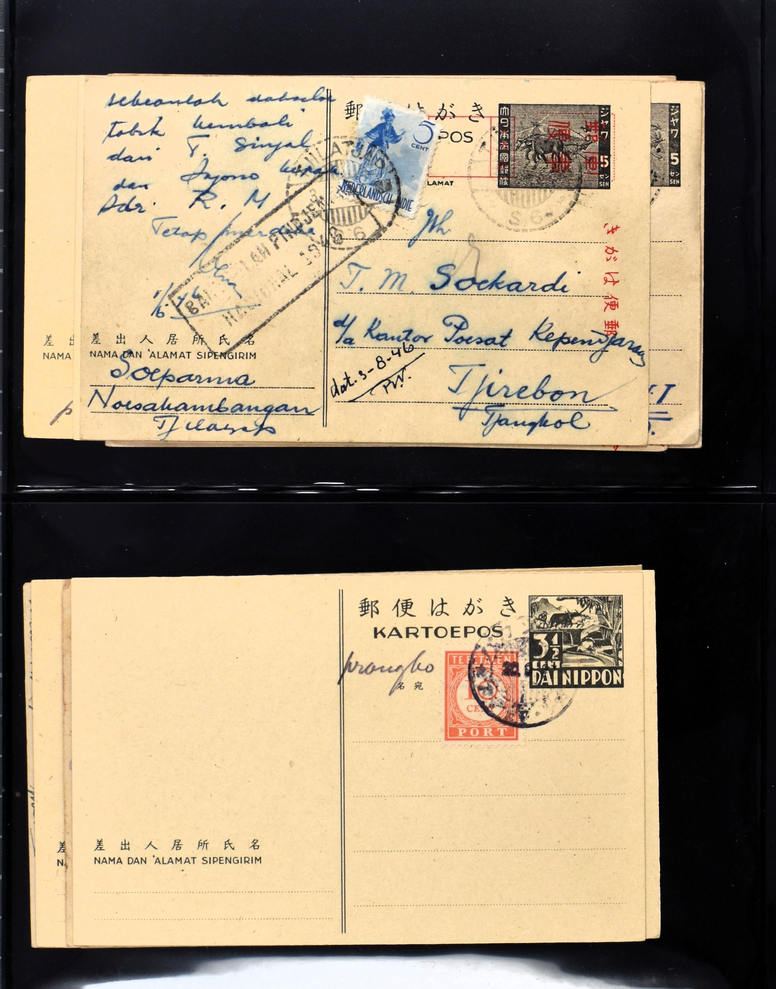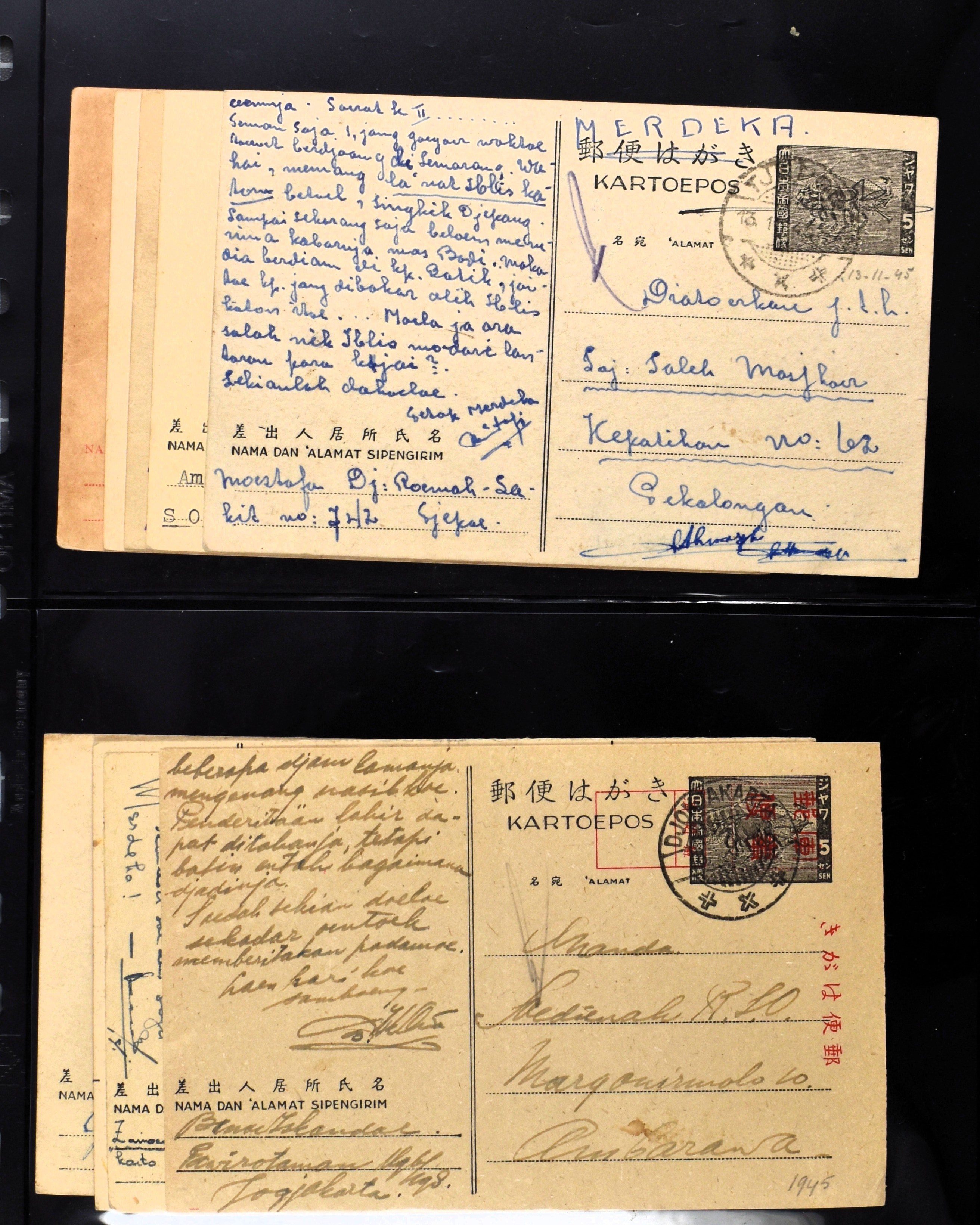 1861 imageJAPANESE OCCUPATION and some Indonesia Revolution Period, circa 55 unused but mainly sent postcards from Java, Sumatra and the Navy area with some nice postmarks, censors, cards written to internees, framed REPOEBLIK INDONESIA P.T.T. in red or back on 3 postcards, etc. (Image) (Image2) (Image3) (Image4)