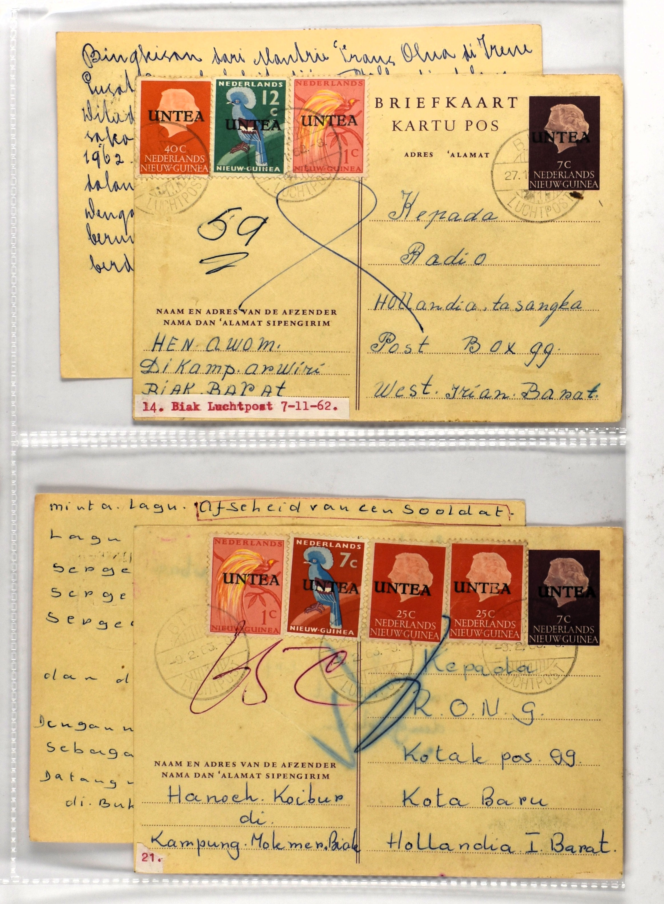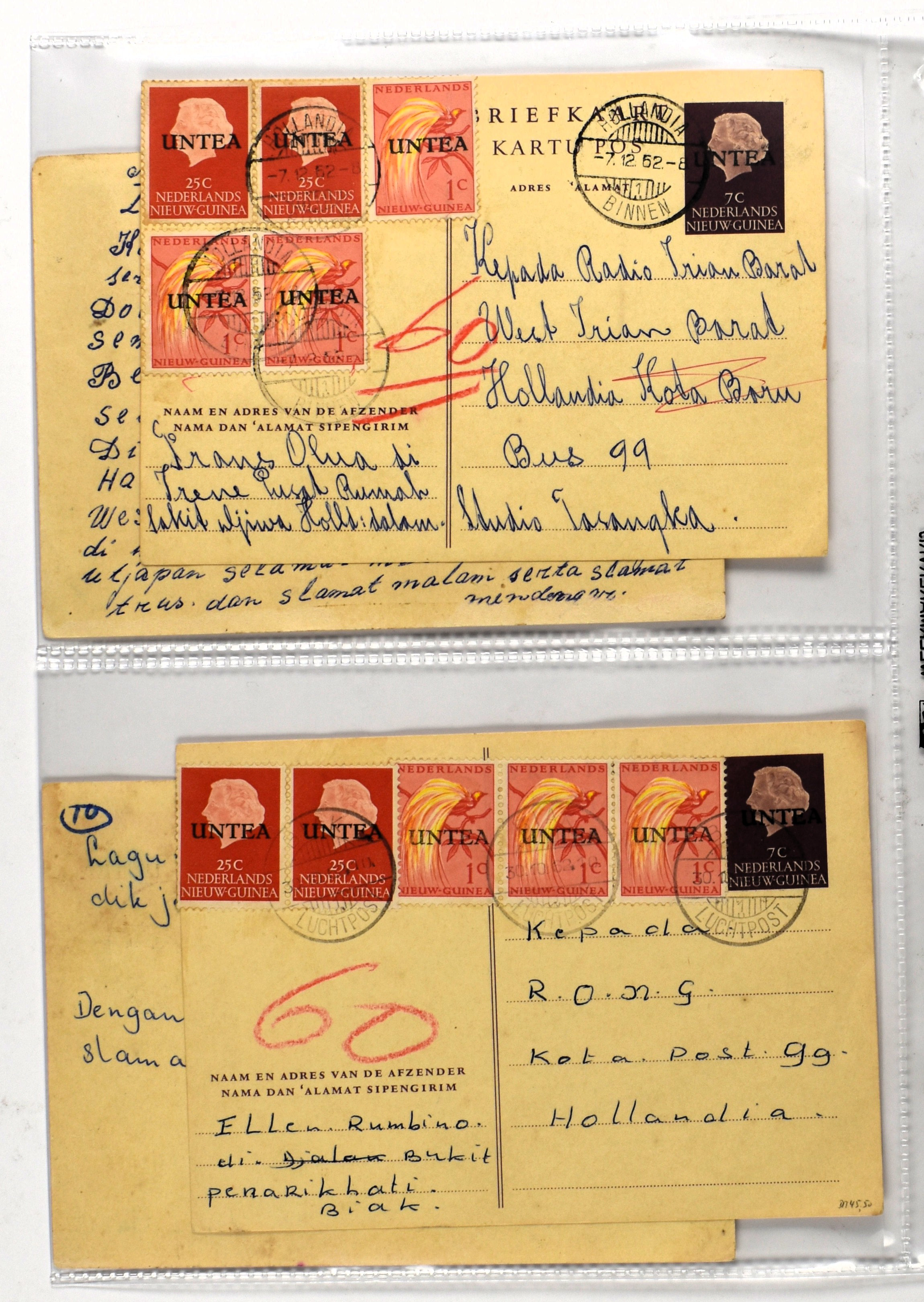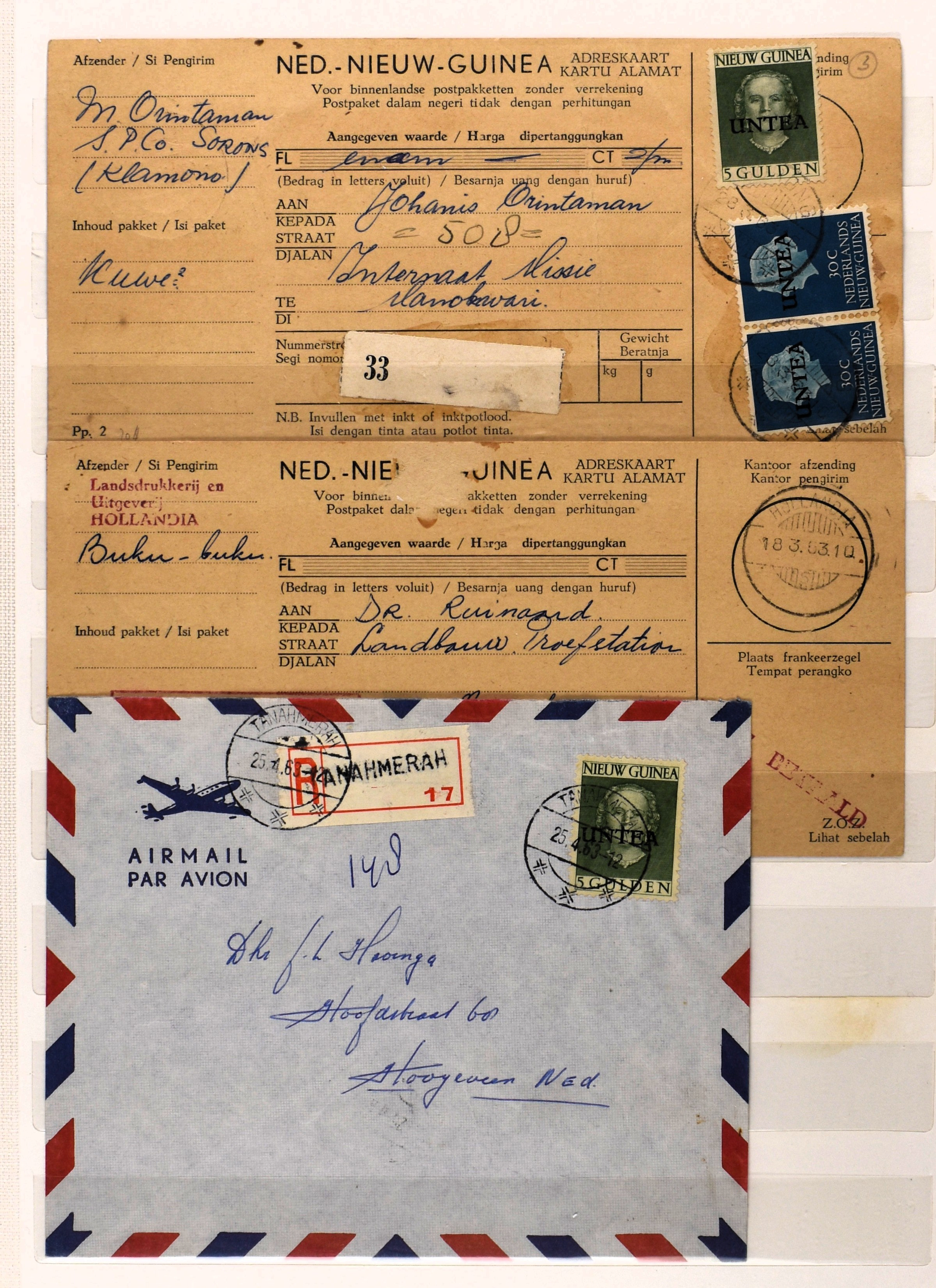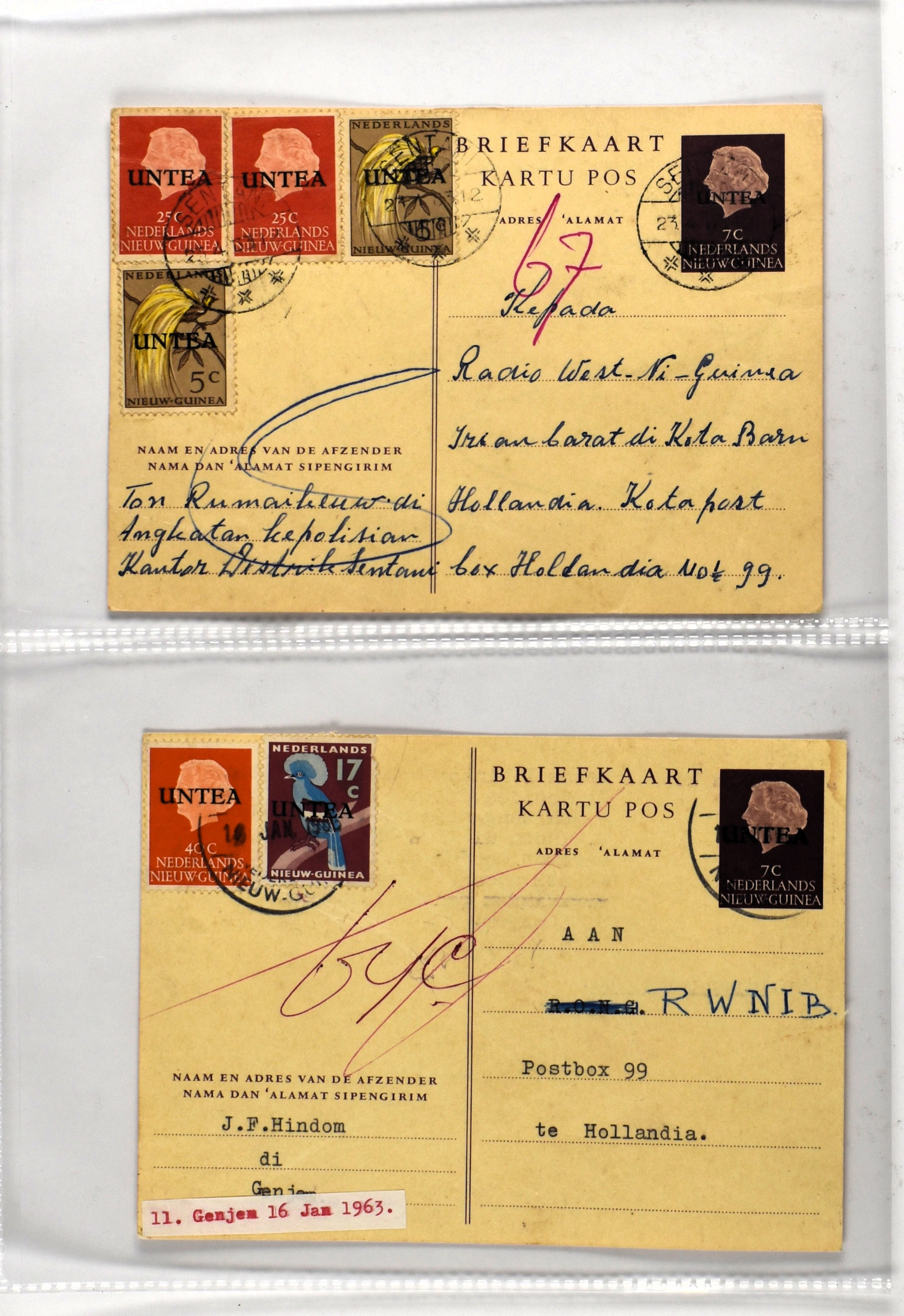 1865 imageUNTEA, 6 RONG-kaarten van 7 cent w.o. 1 ex. met kleine opdruk uit Sentani 23-4-1963, alle met bijfrankeringen (Image) (Image2) (Image3)