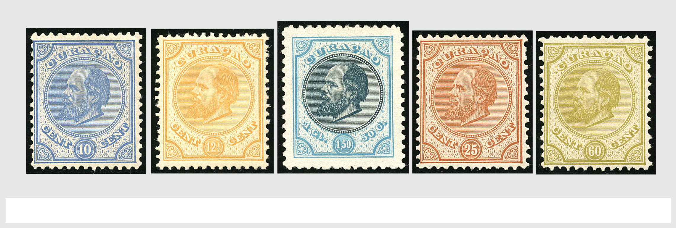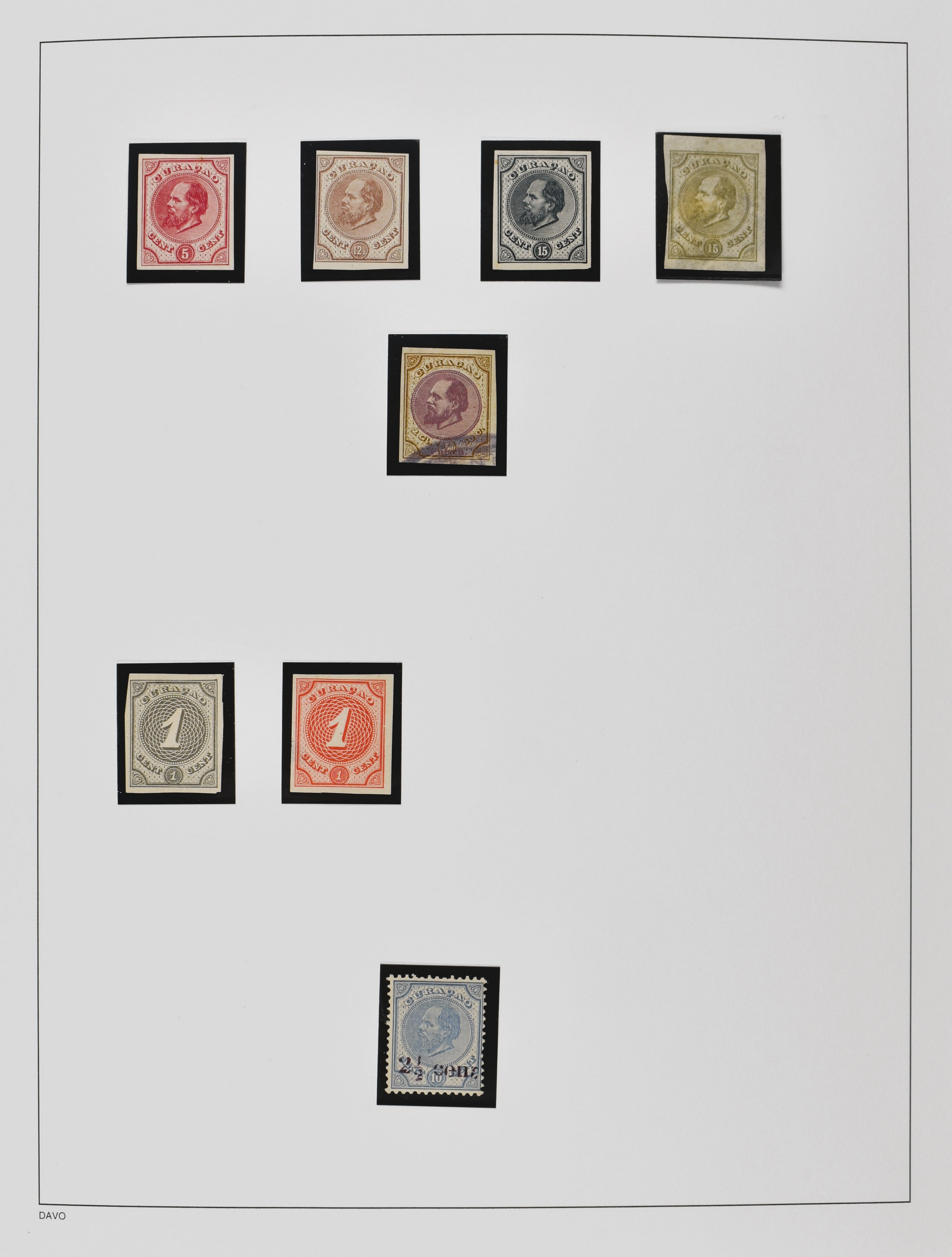 1868 imageCURAÇAO, 1½ gulden nr. 11 met handstempelopdruk 'Specimen' en 4 oude zegels met betere stempels (Image)