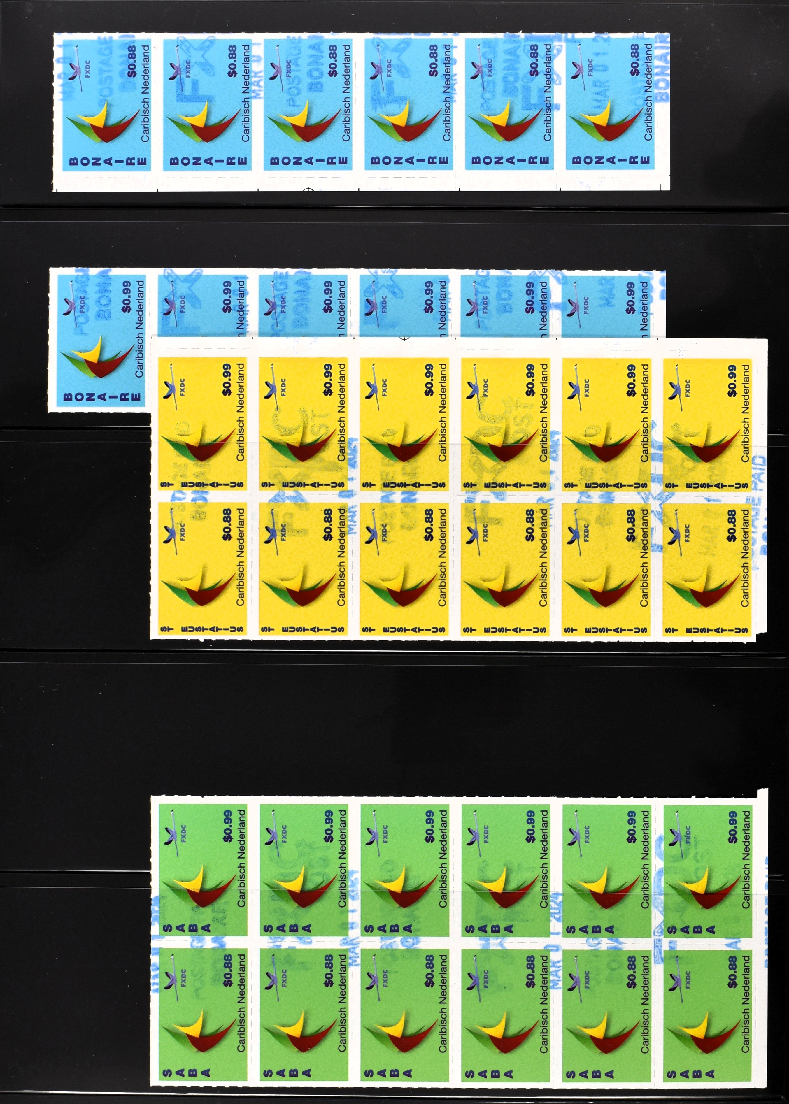 1873 imageCARIBISCH NEDERLAND, Flamingo Communication 2014 nrs. 39/44 in 6 stroken van 6, afgestempeld met FDC-stempels in blauw (Image)