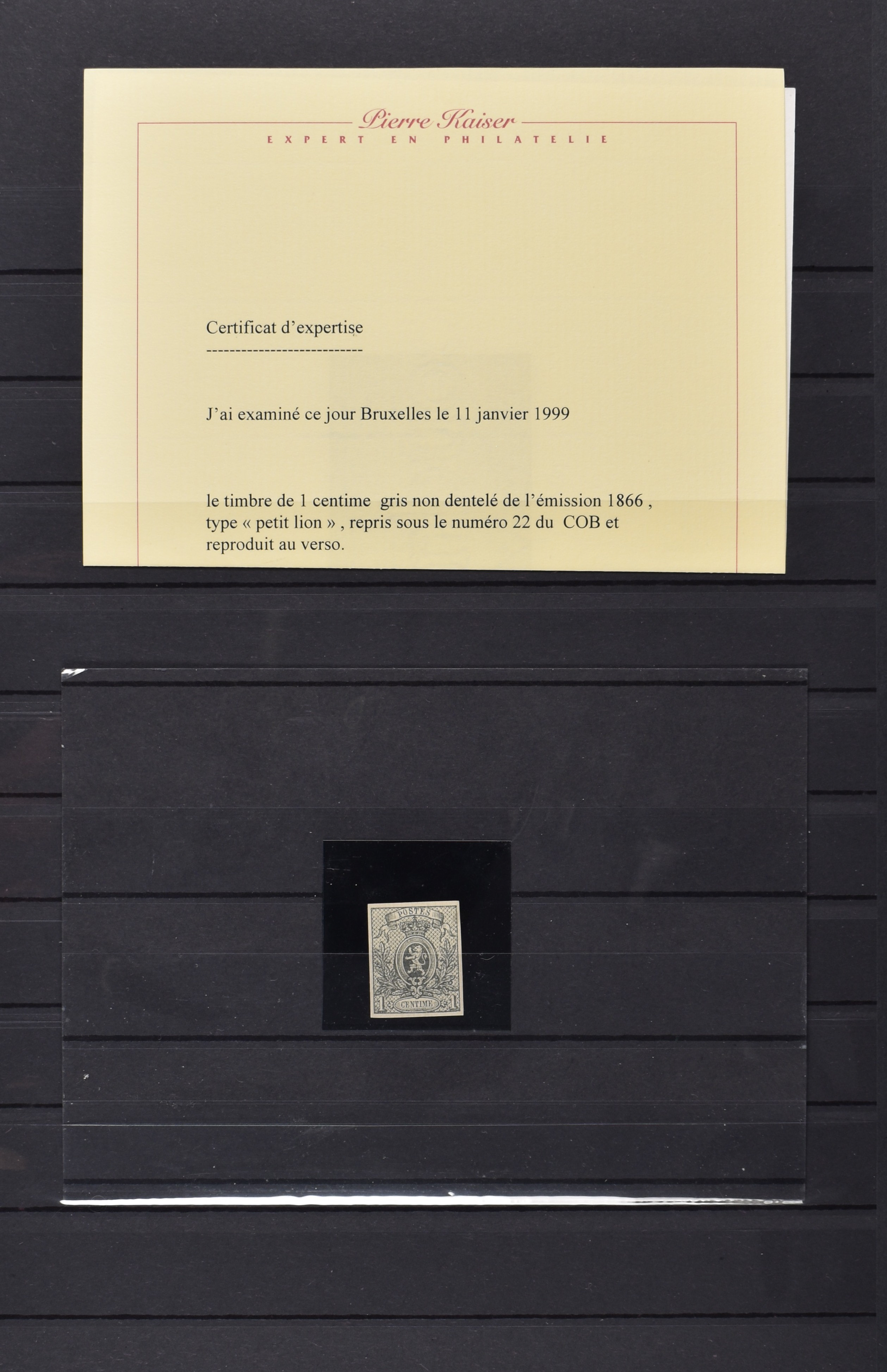 1883 imageBELGIË 1866, OBP 22, 1 cent grijs, postfris Pracht ex. met certificaat P. Kaiser, Luxe! € 1200 (Image) (Image2) (Image3)