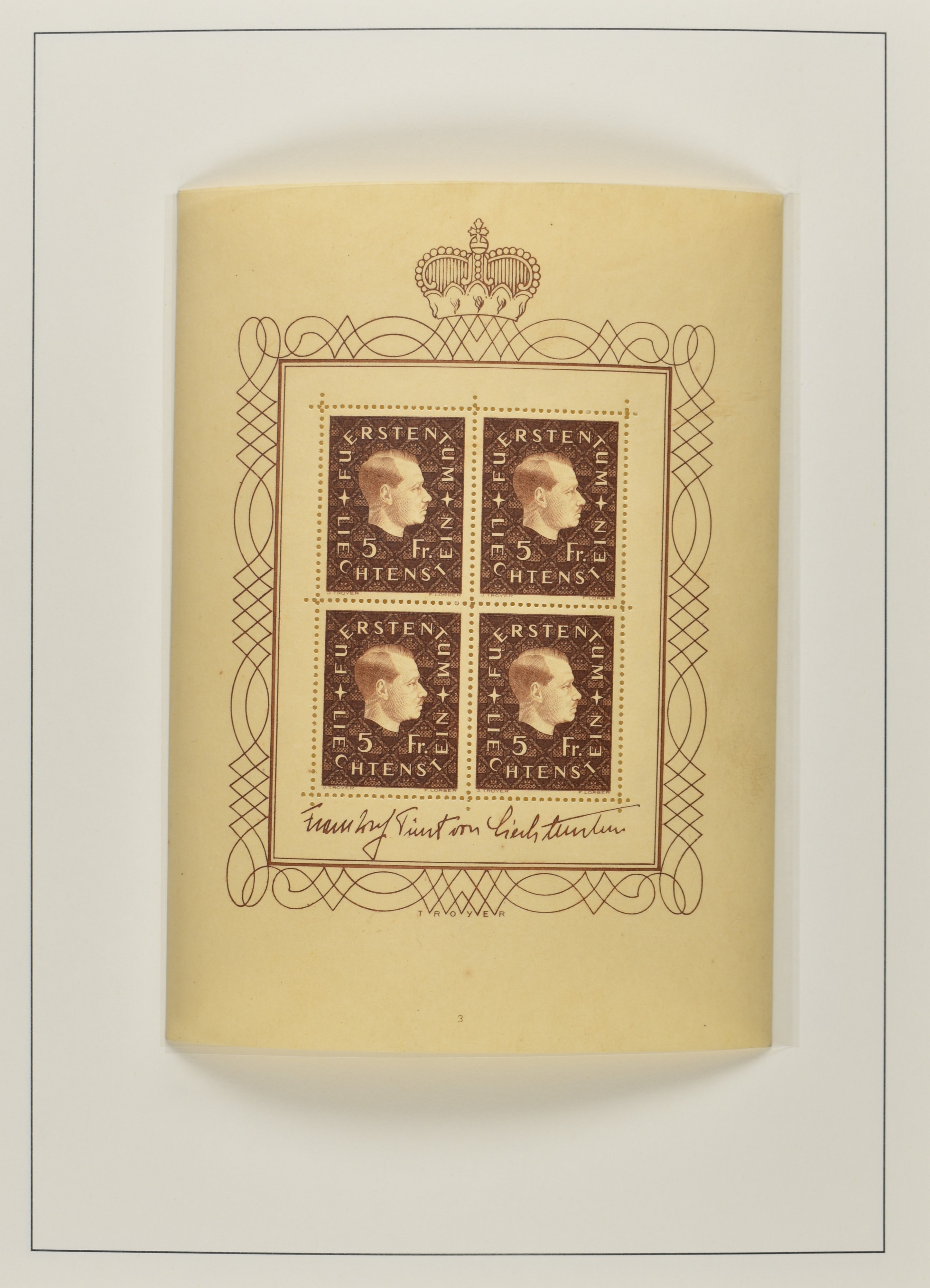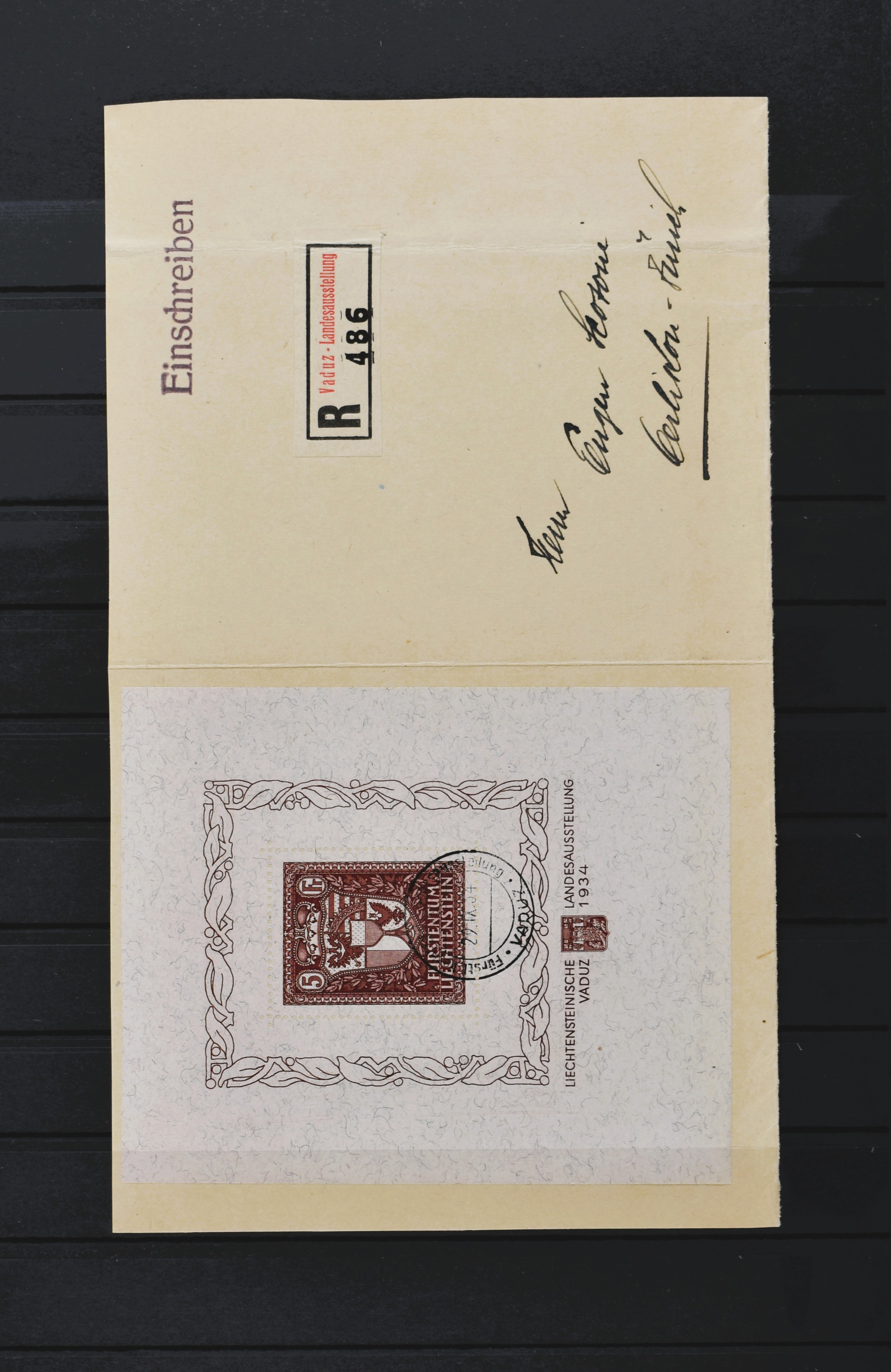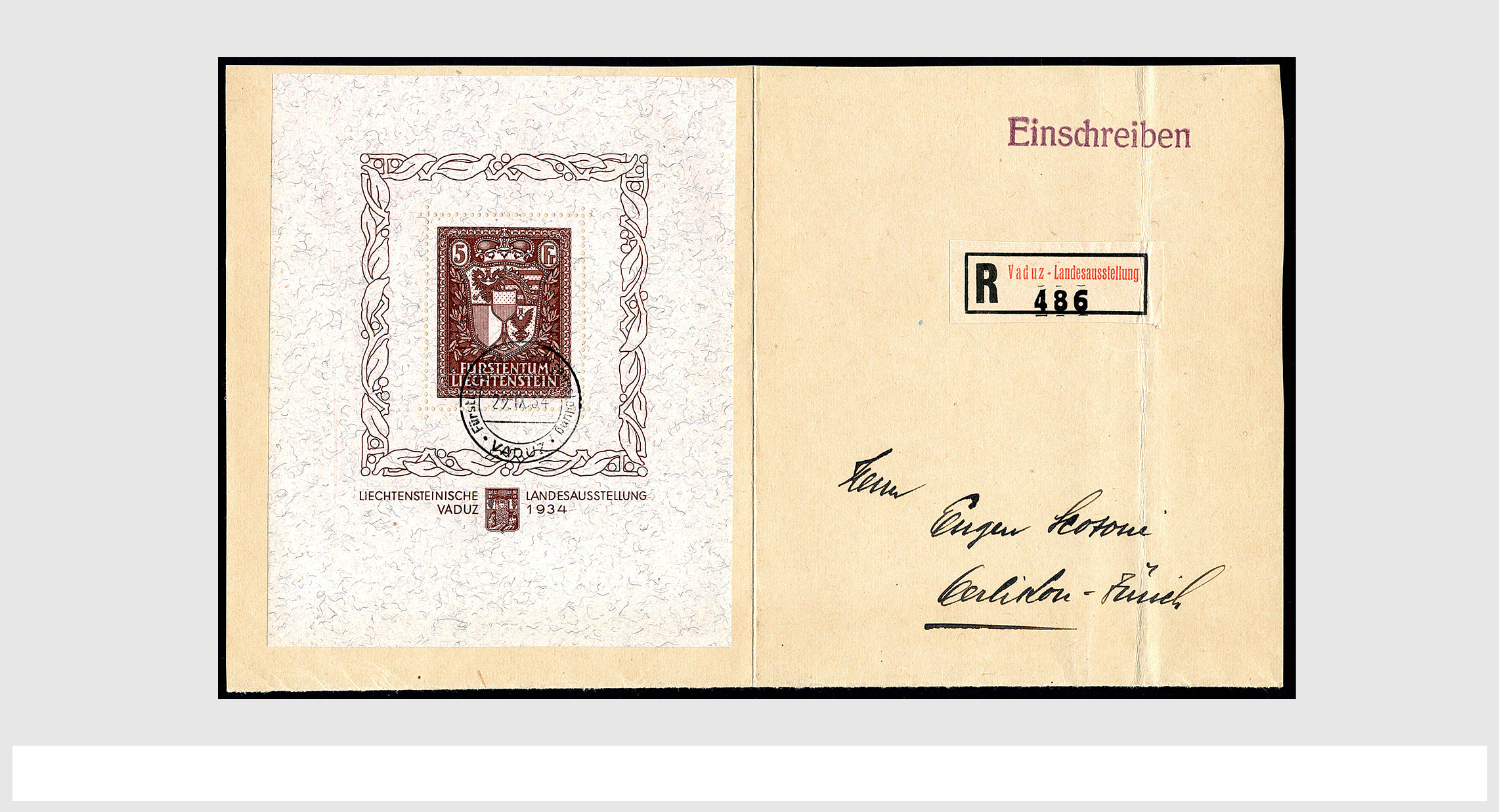 LIECHTENSTEIN 1934, Mi. block 1 'Vaduz 1934' used on a card, € 3000 (Image) (Image2)