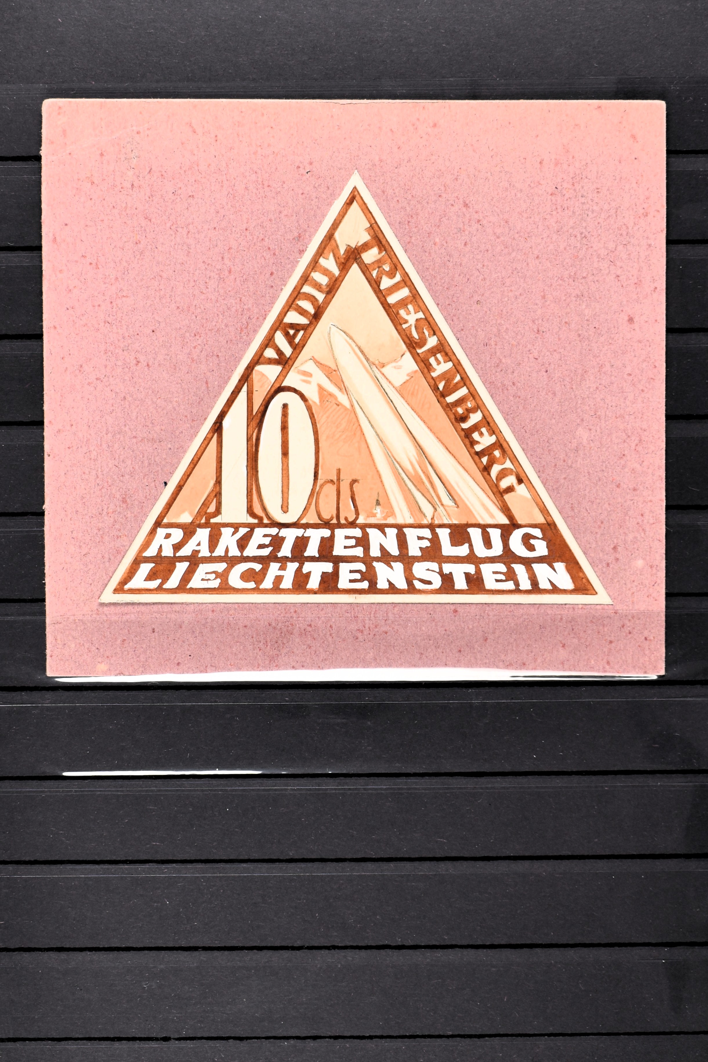 LIECHTENSTEIN, 1935, 10 cents Rocket-flight Liechtenstein "Vaduz-Triesenberg", hand-painted original design of a never issued rocket-flight stamp on cardboard template, format 15,5x14,3cm. This flight was planned in 1935 but was never