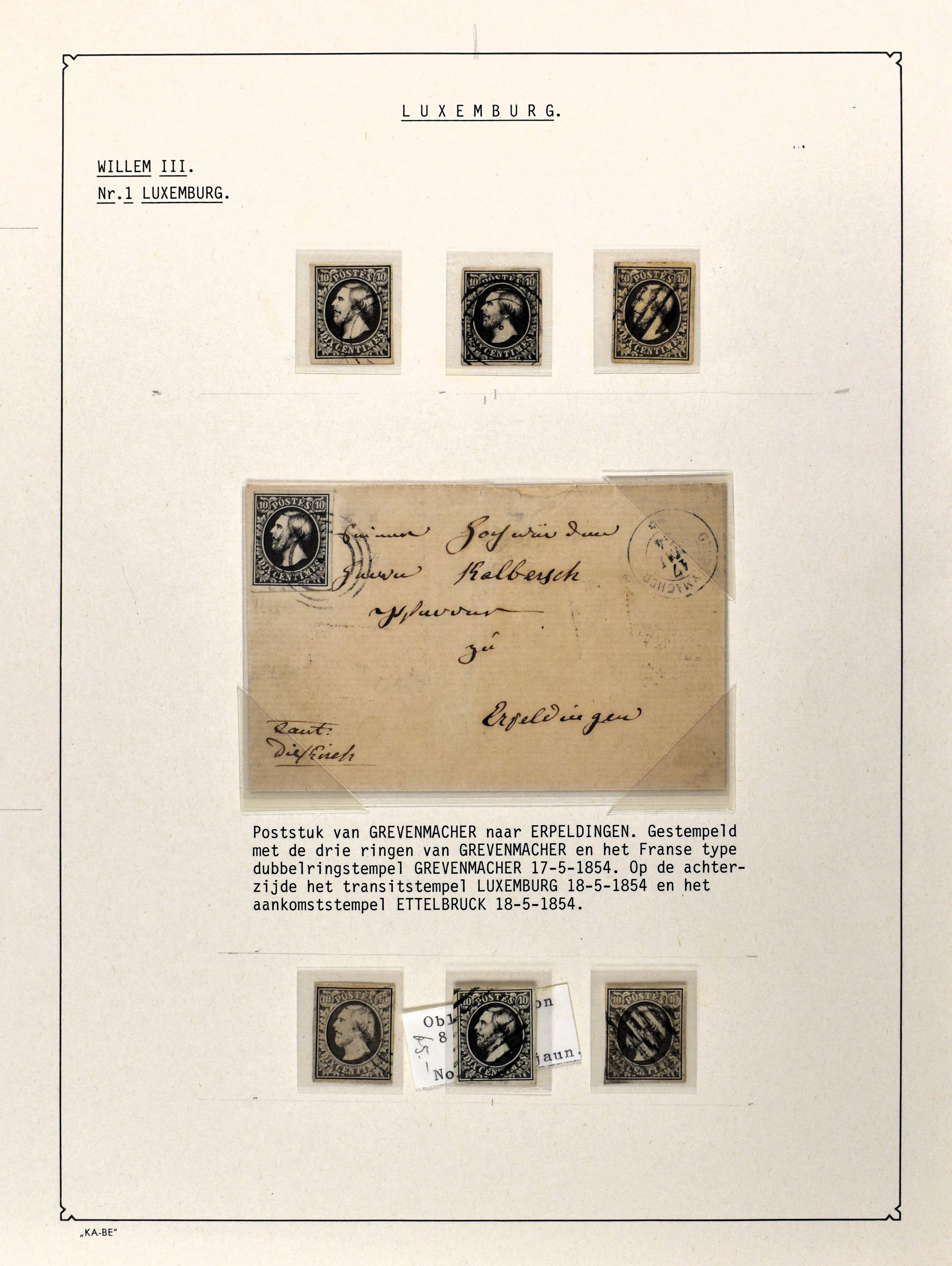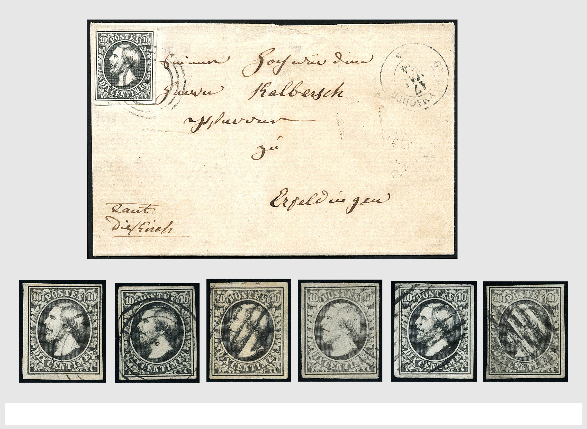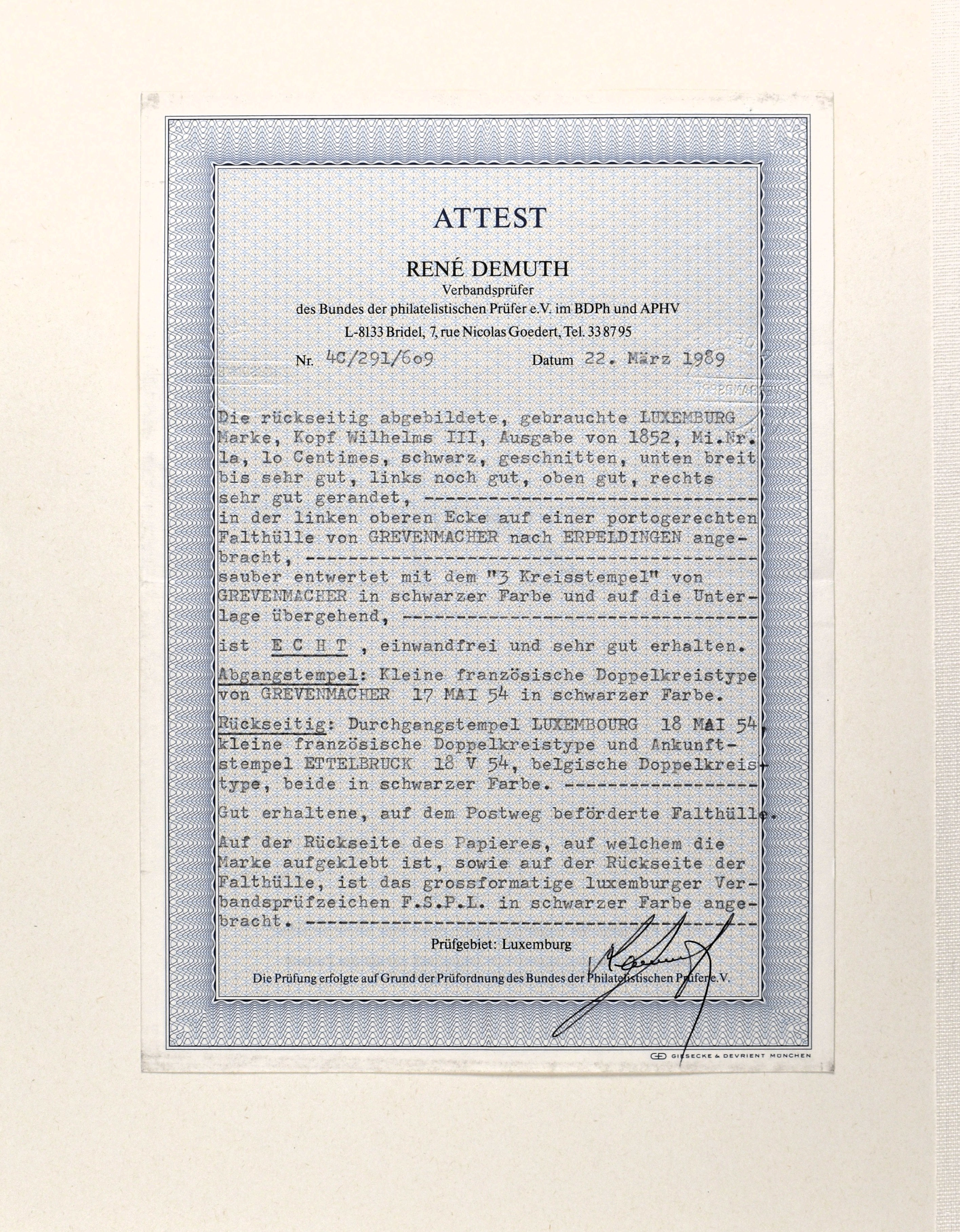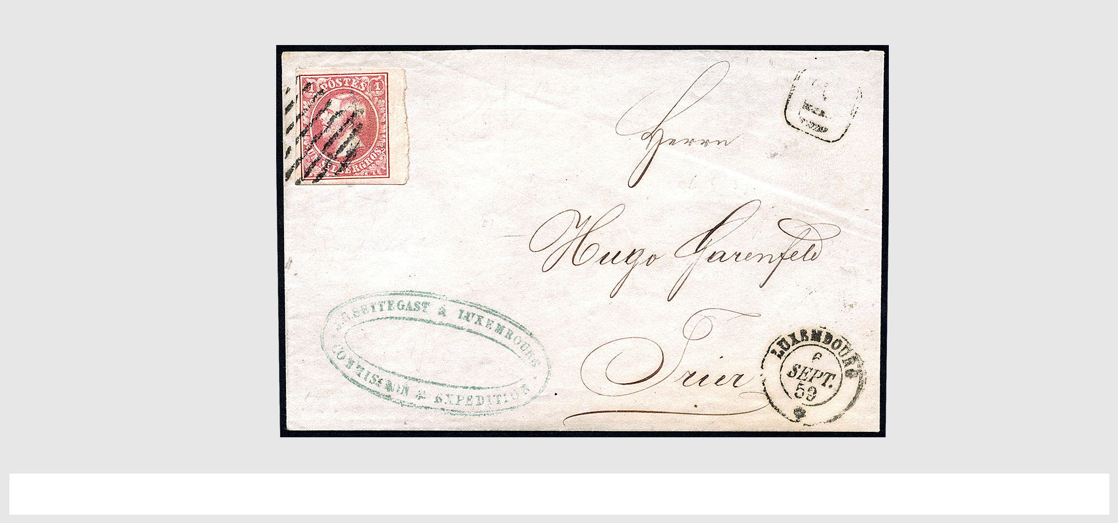 LUXEMBOURG. 10 Centimes Mi. No. 1a very fine copy with good/wide margins) on fresh letter-wrapper from Grevenmacher 17 May 1854 via Luxembourg 18 May and Ettelbrück 18 May to Erpeldingen. It could be that the stamp has been removed for