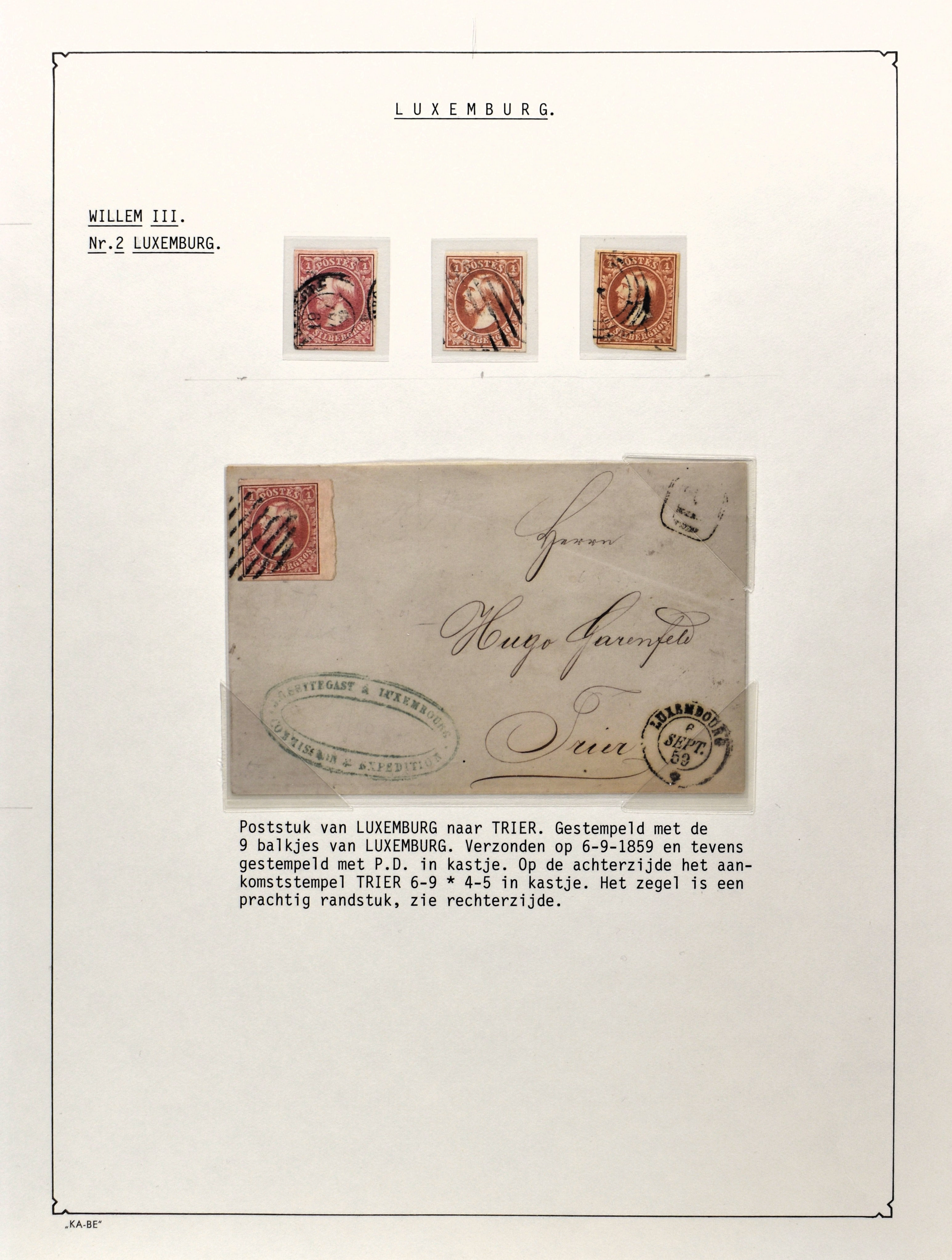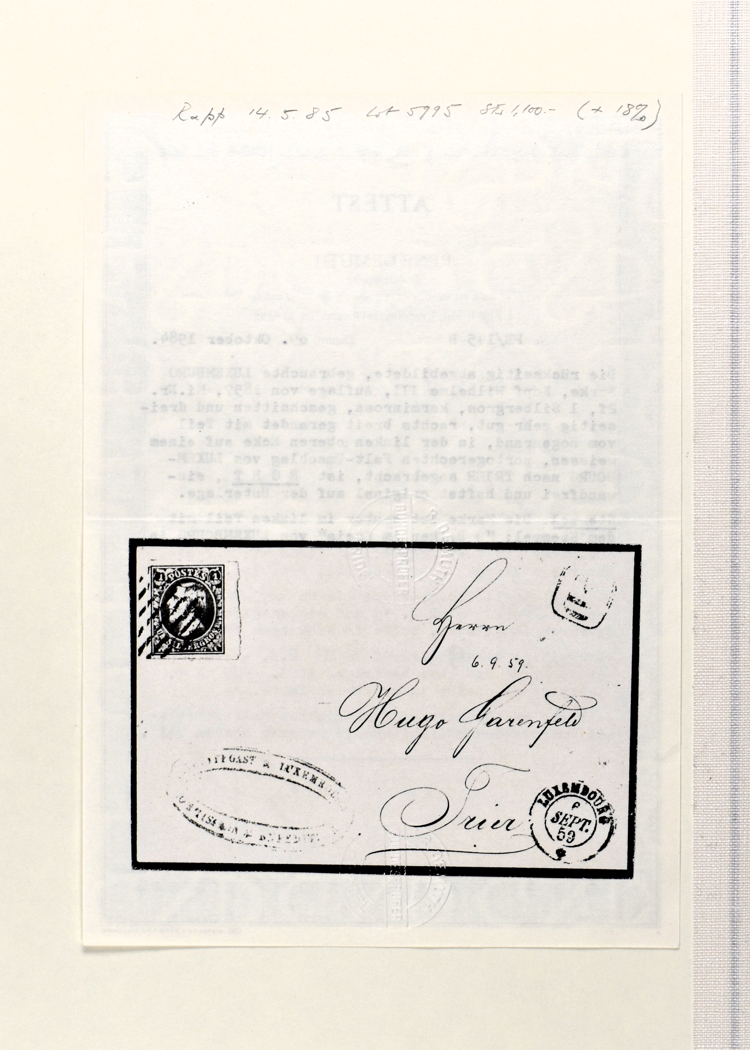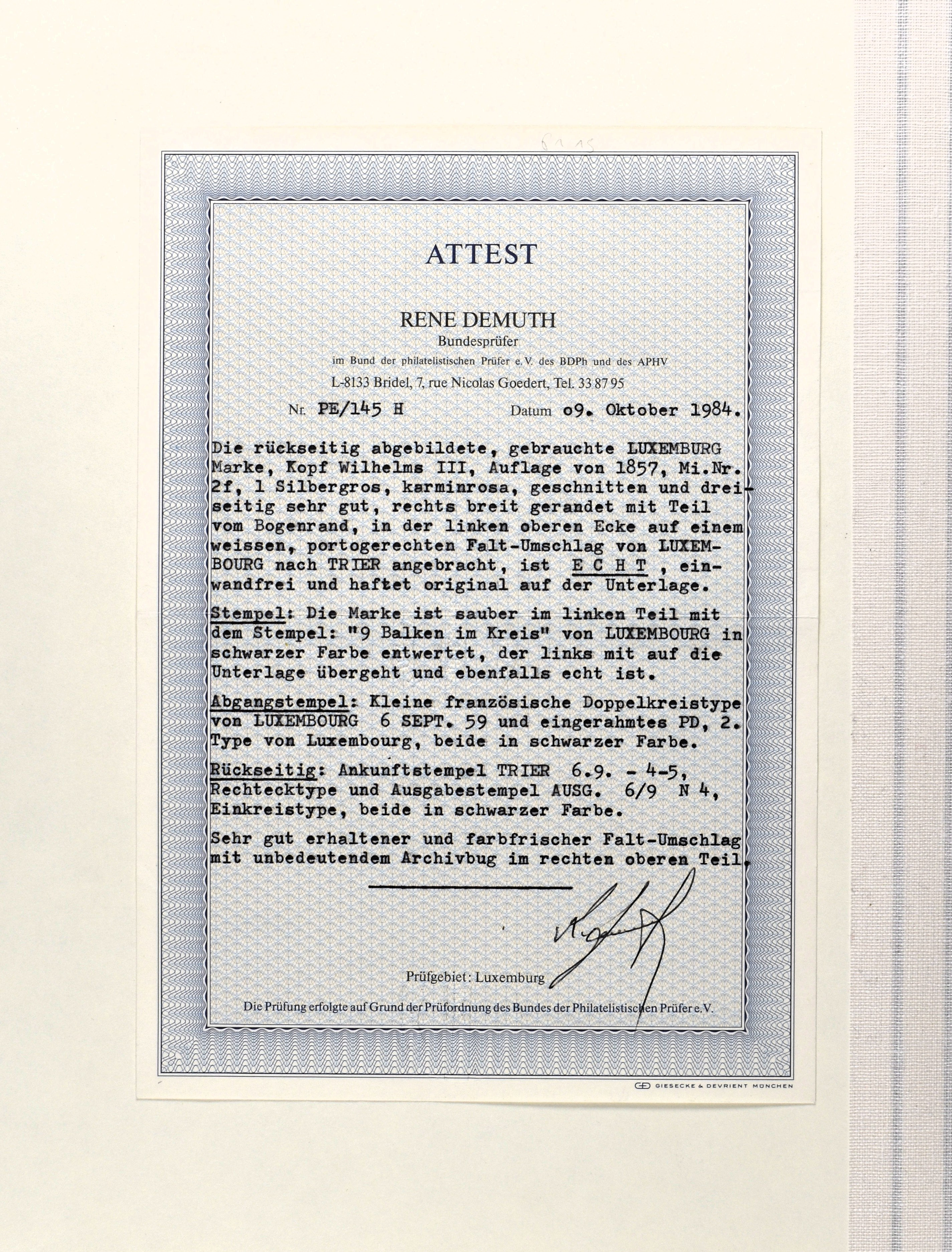 LUXEMBOURG. 1 Silbergroschen Mi. No. 2f wonderful copy, the right side with part of sheet margin) on fresh letter-wrapper from Luxembourg 6 September 1859 to Trier 6 Sep, showing on the front P.D. in frame. Informative certificate René