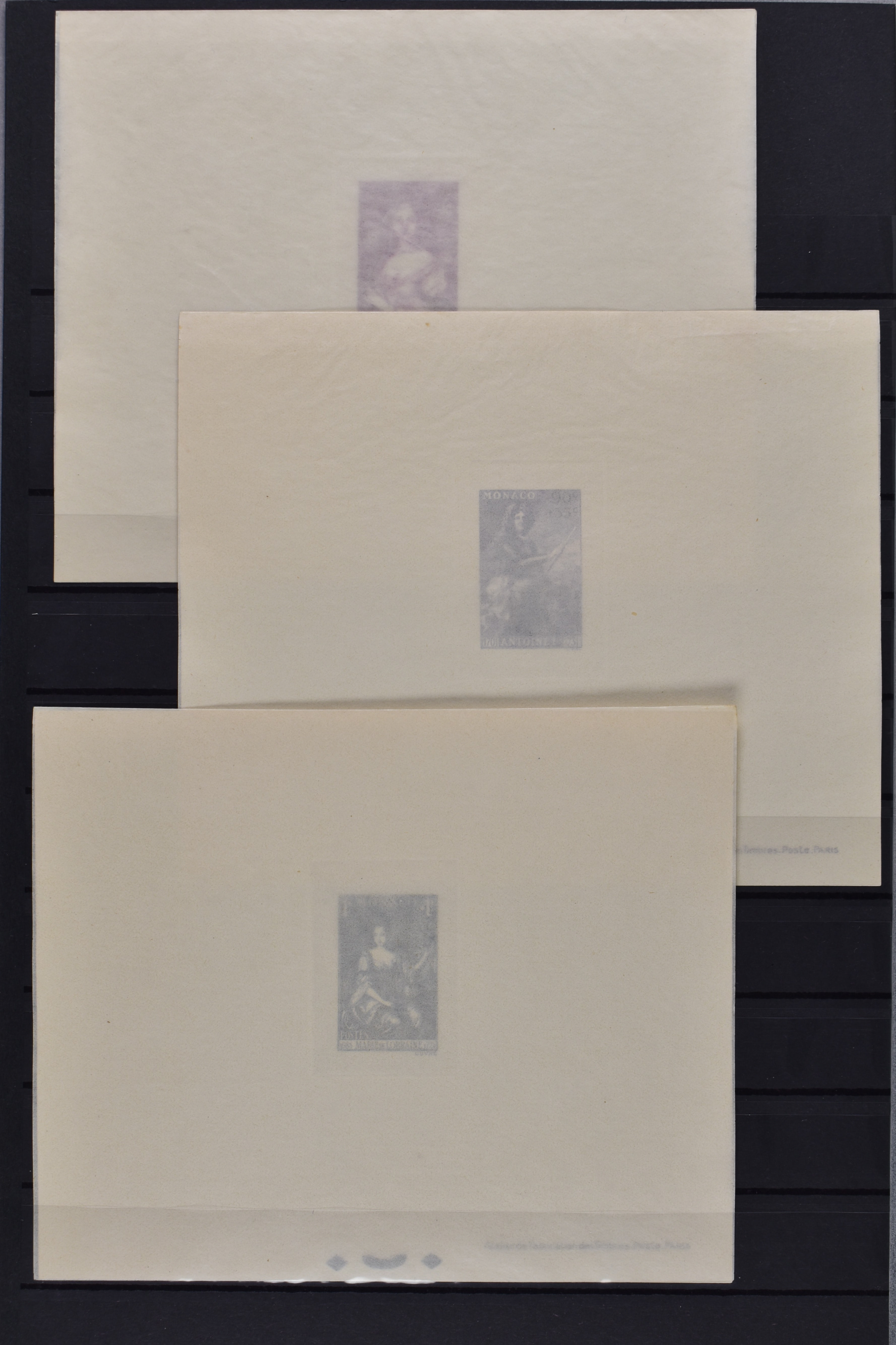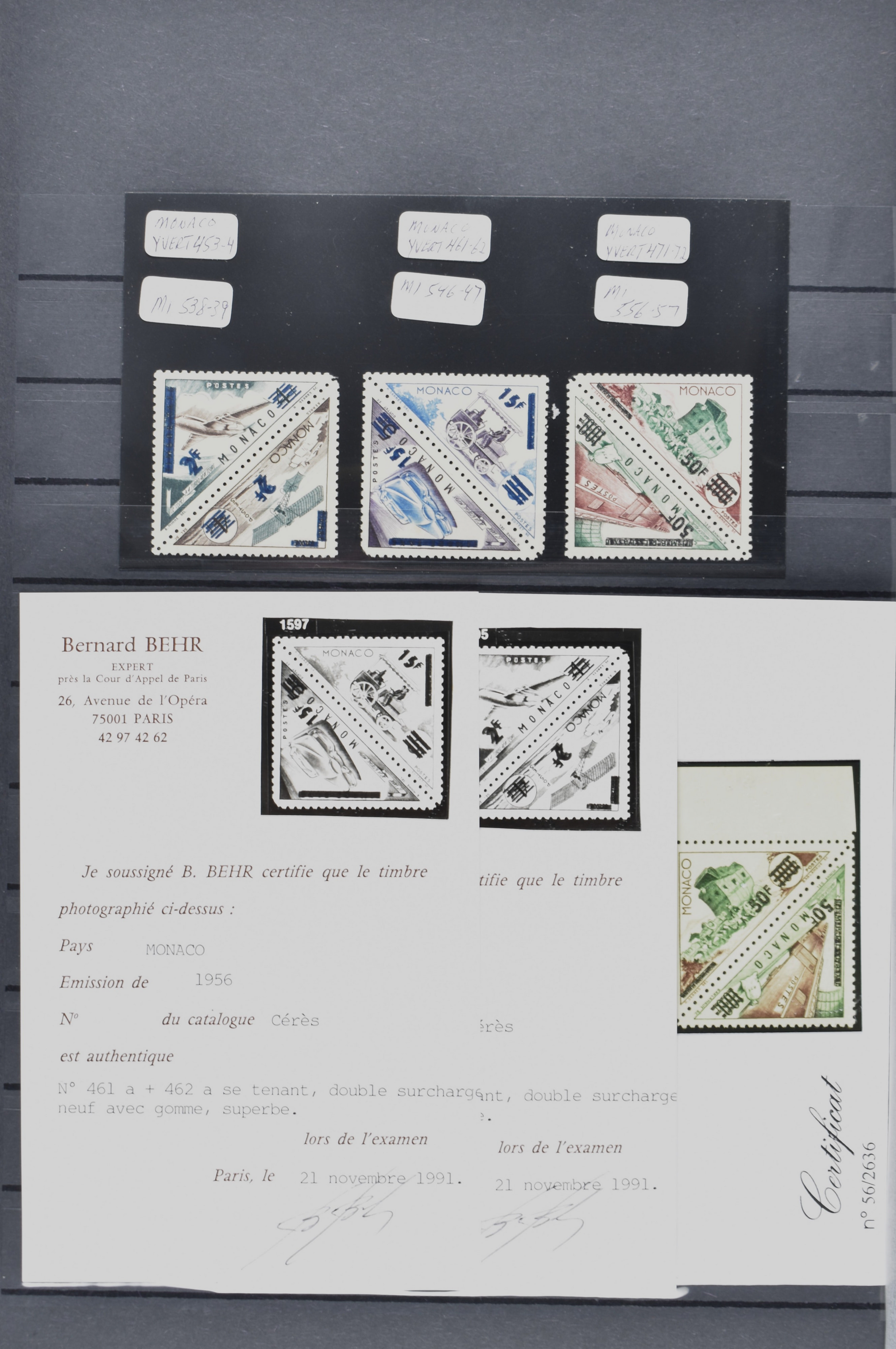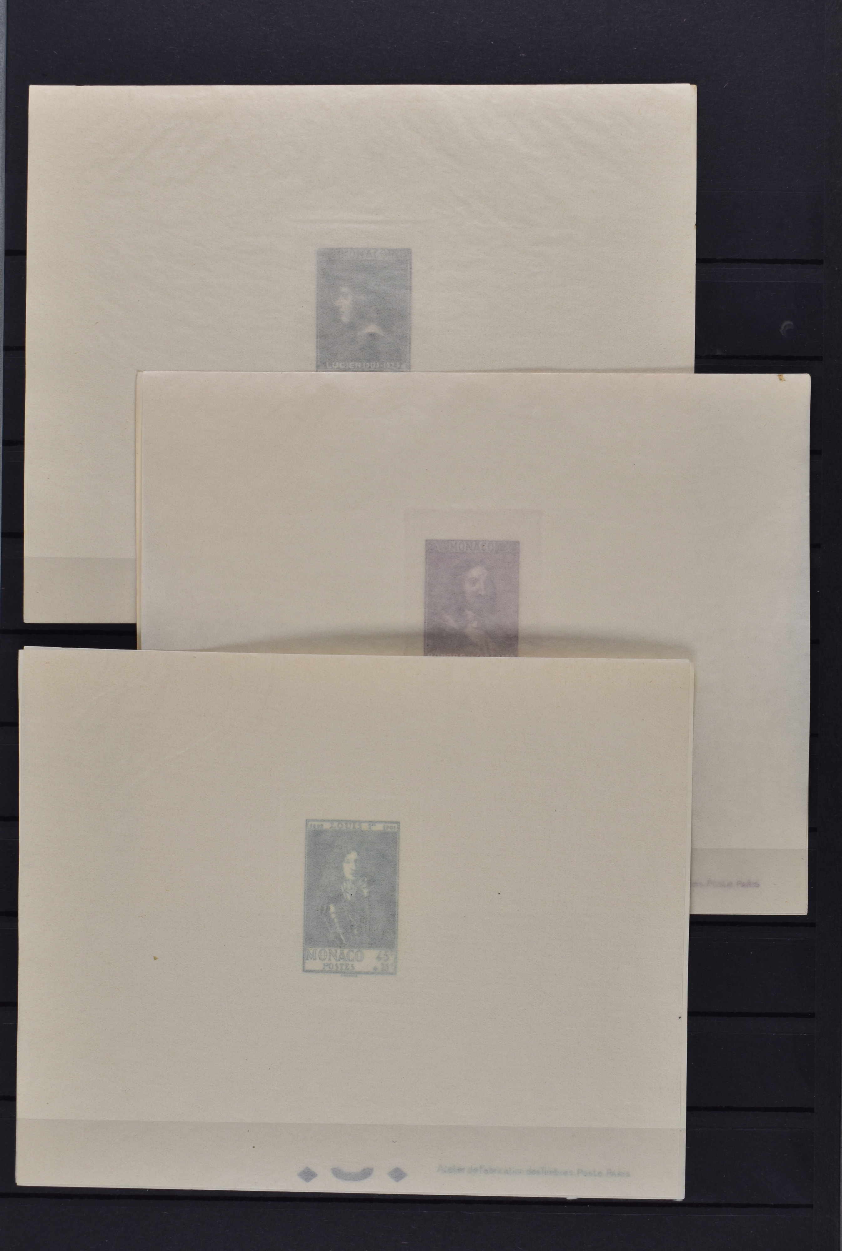 MONACO, nice lot with Epreuves Yv. 185/194 and several varieties with f.i.: Yv. 208a, 453/54a, 461/62a, 471/72a, 471/72d, several with certificates 'Behr'