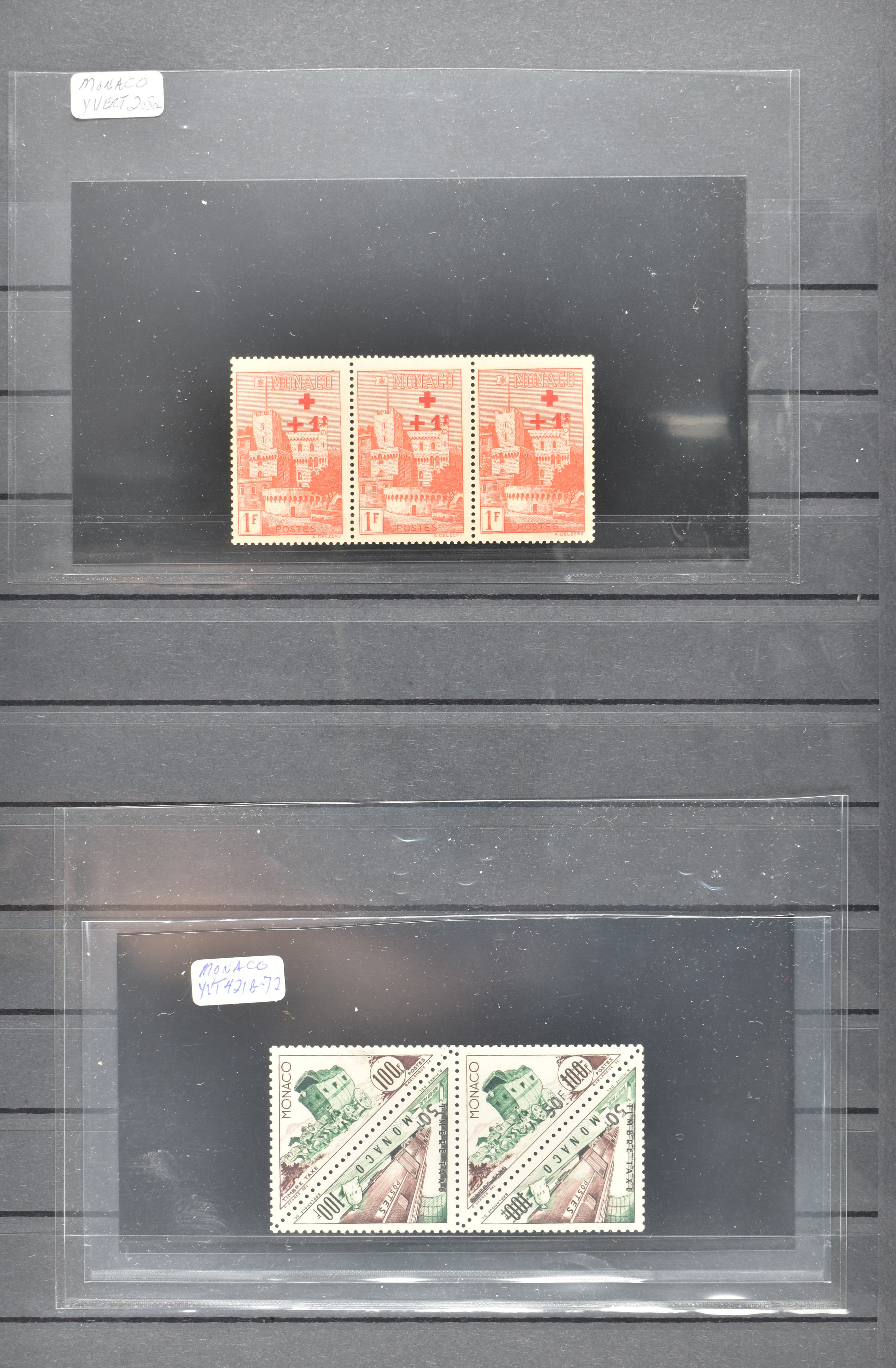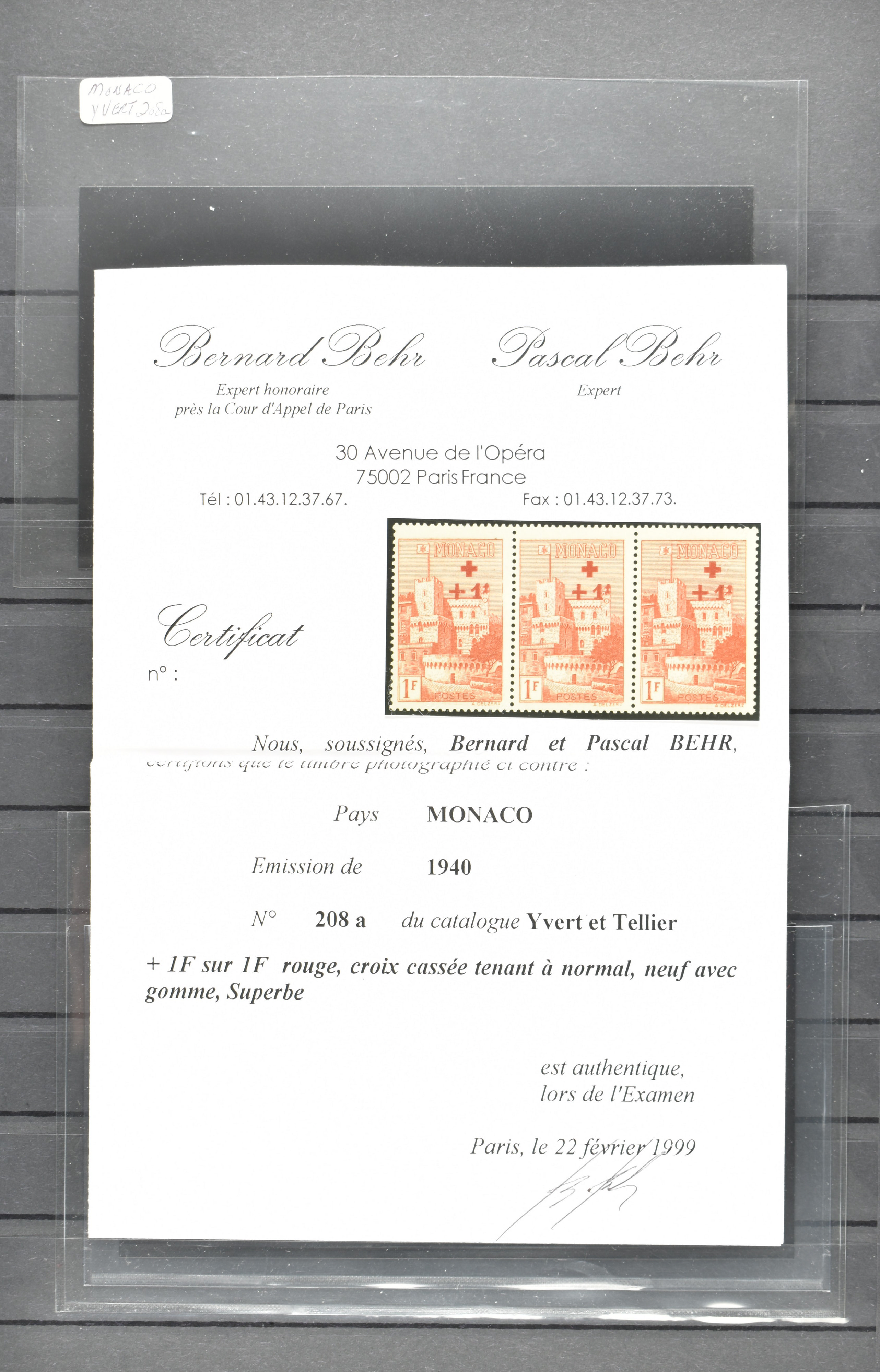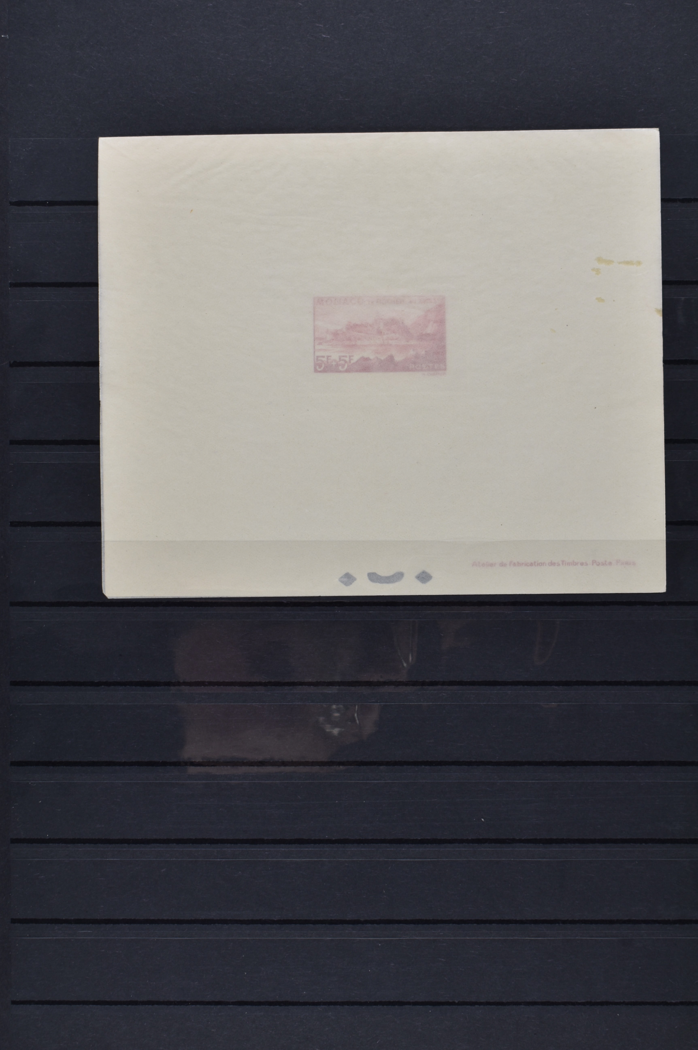 MONACO, nice lot with Epreuves Yv. 185/194 and several varieties with f.i.: Yv. 208a, 453/54a, 461/62a, 471/72a, 471/72d, several with certificates 'Behr'
