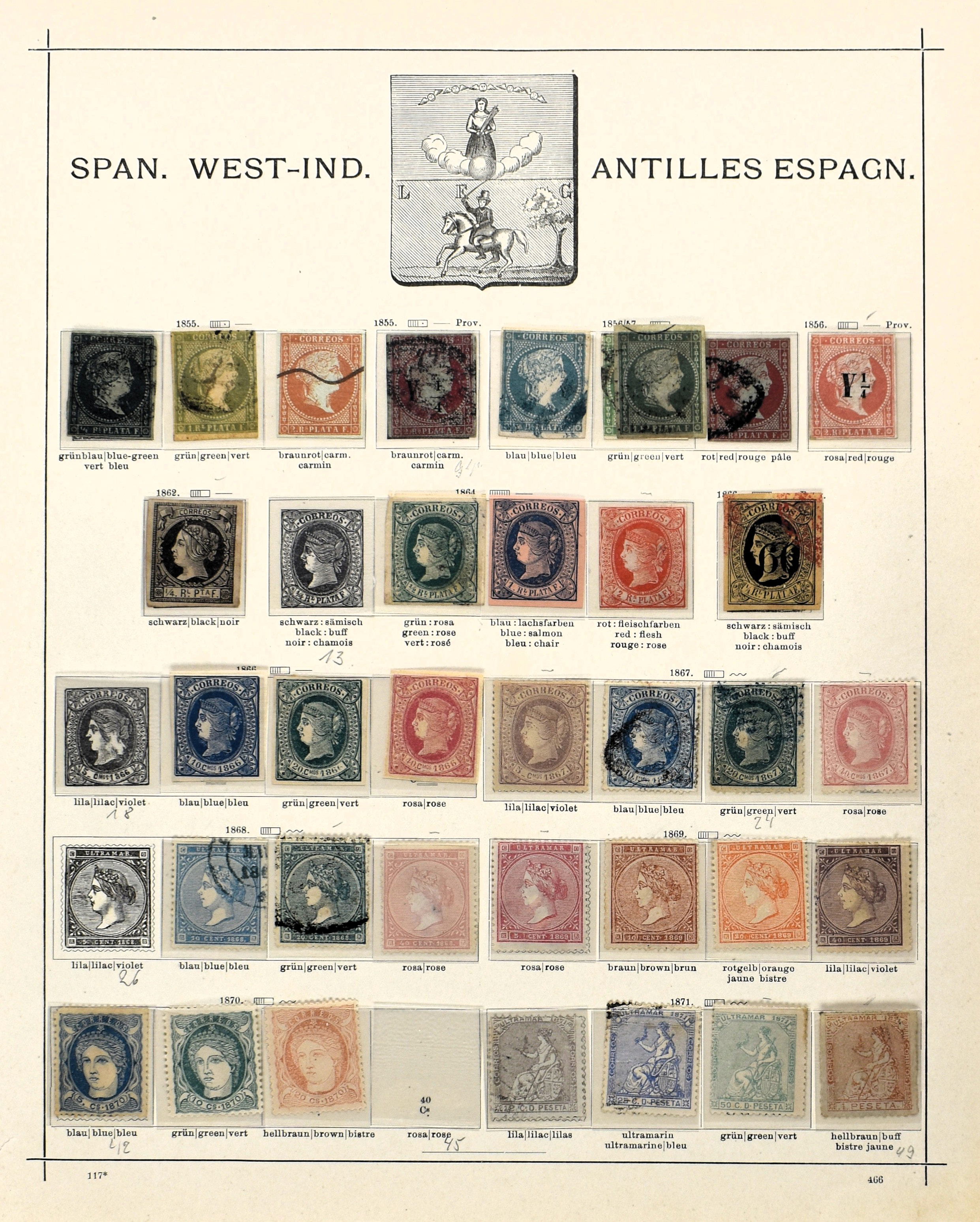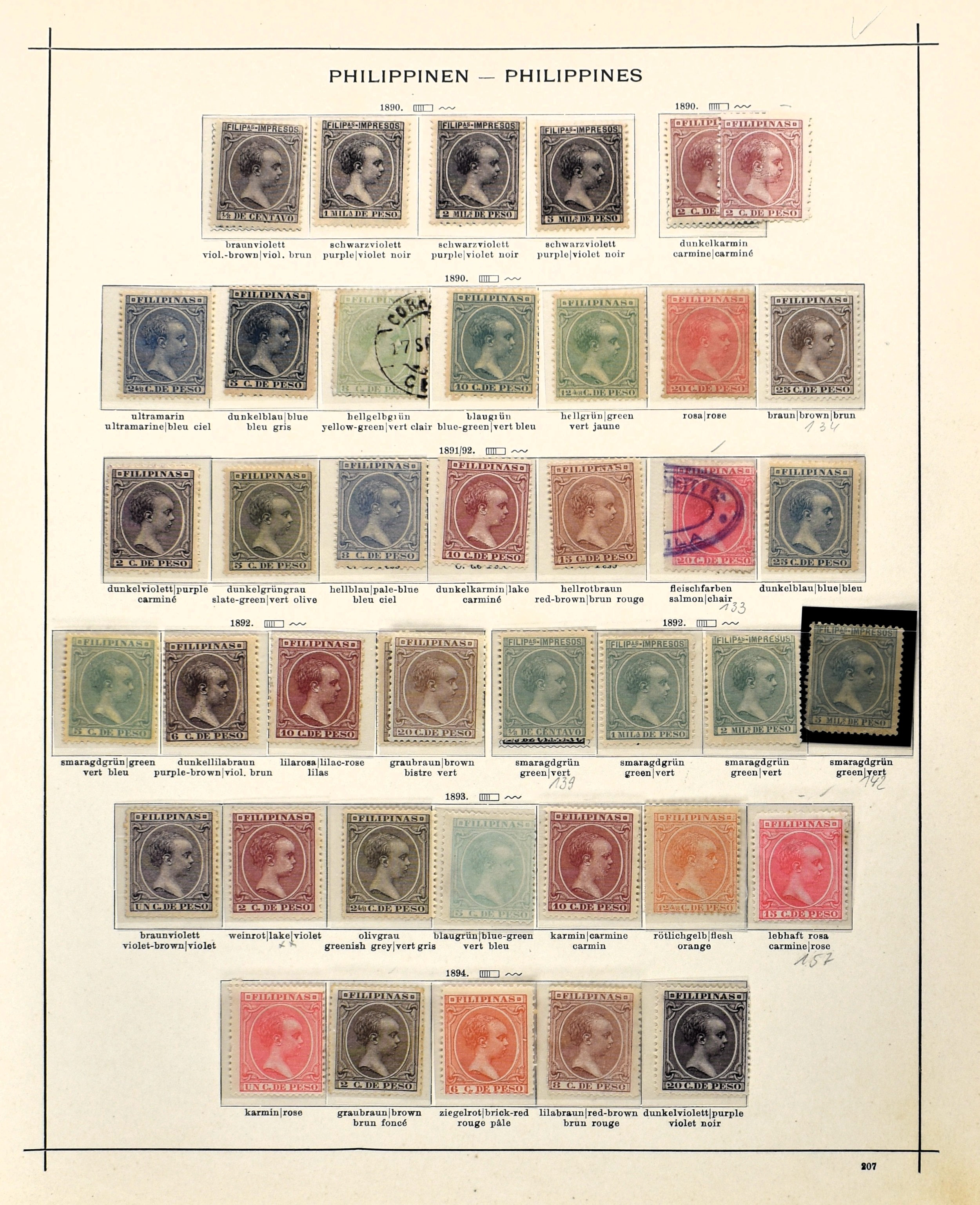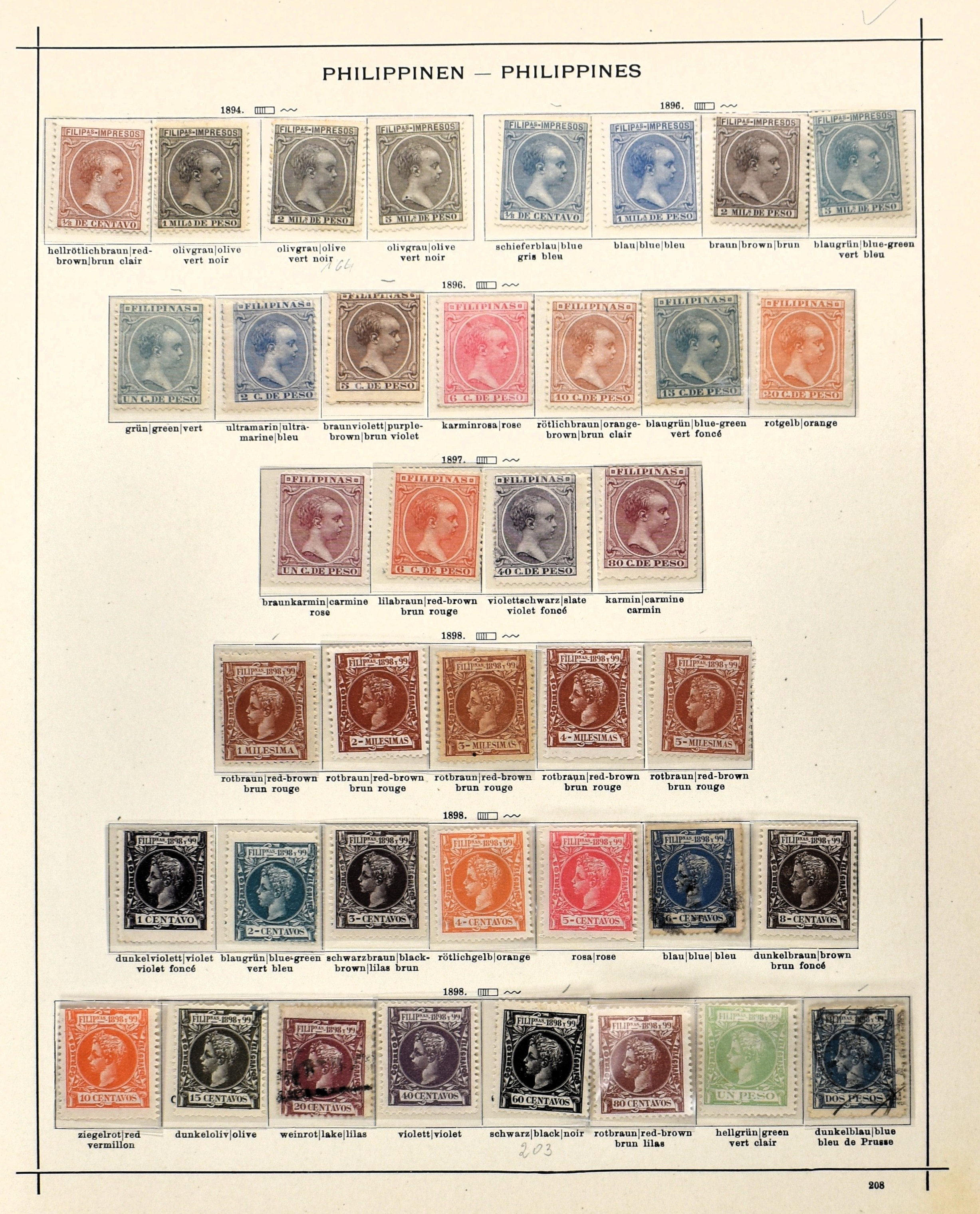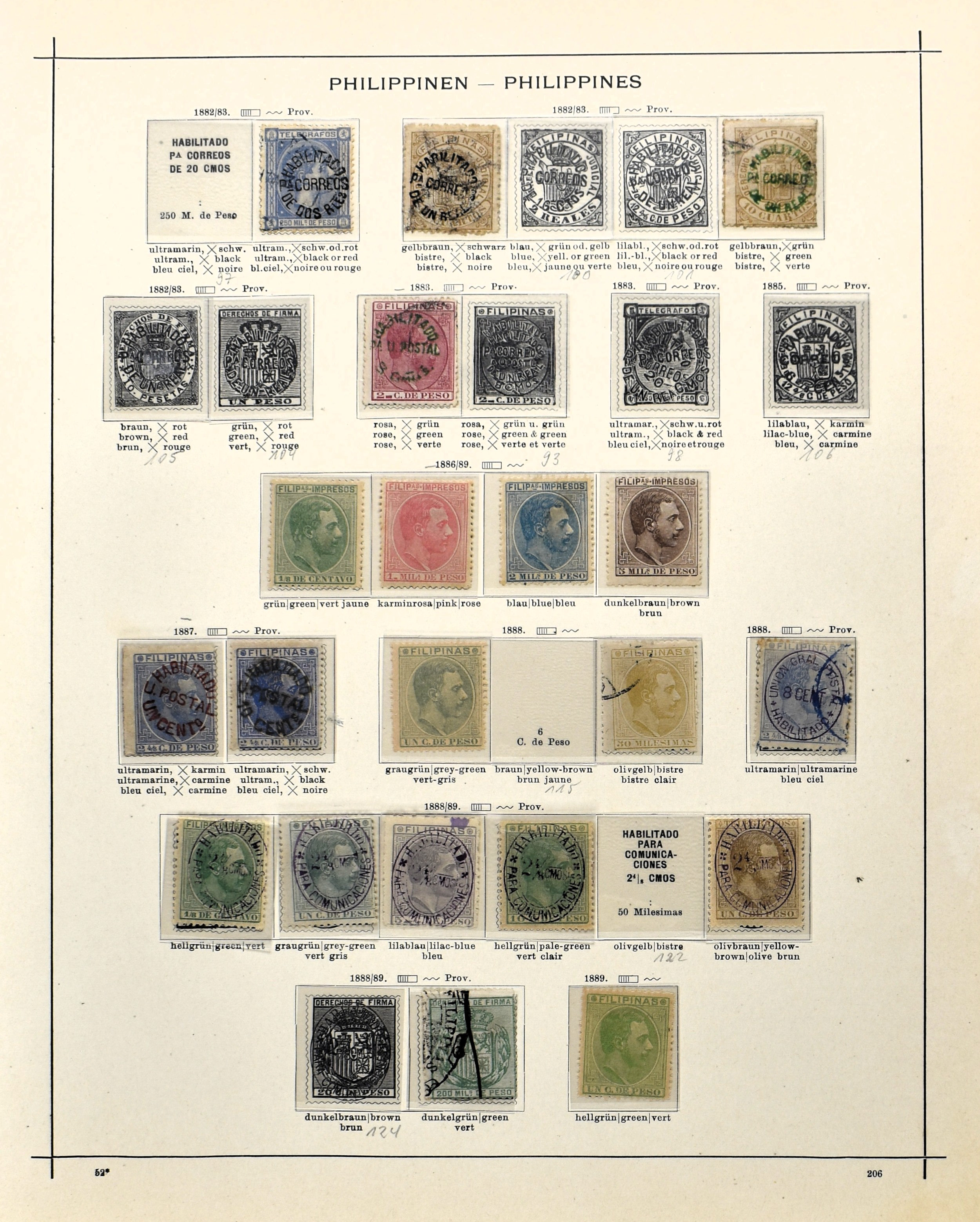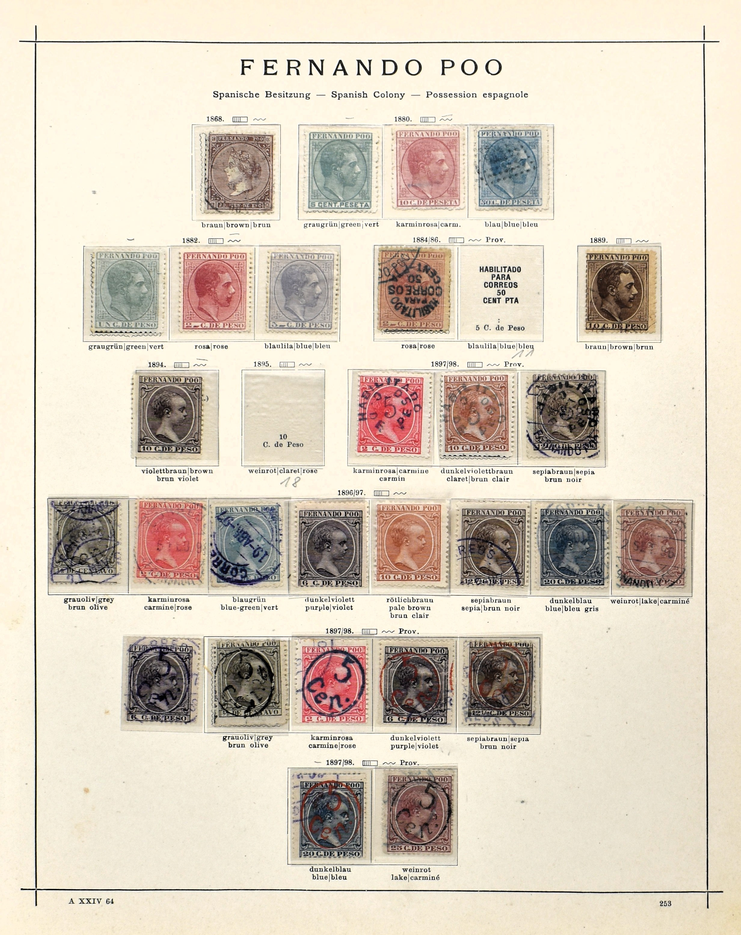 SPANISH COLONIES 1855-1900, o/(*)/* on album pages in mixed quality but still with with better material f.i.: Antilles Mi. 42(*), Cuba 8(*), Fernando Poo 1, 41, 61/62, 86, 104, Philippines 15/16, 40/44, 142*, 217* and postage due 1/7. (Image) (Image2)