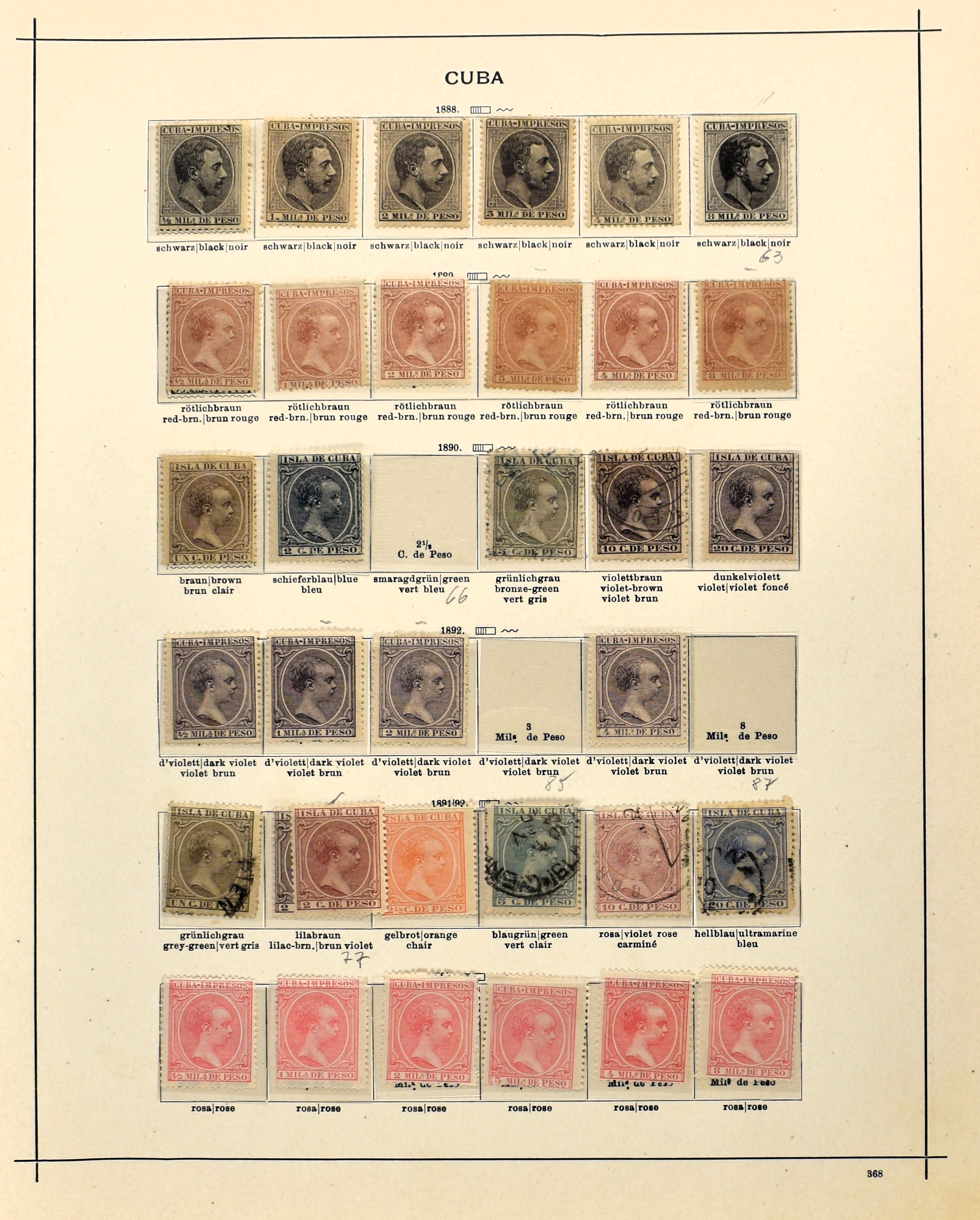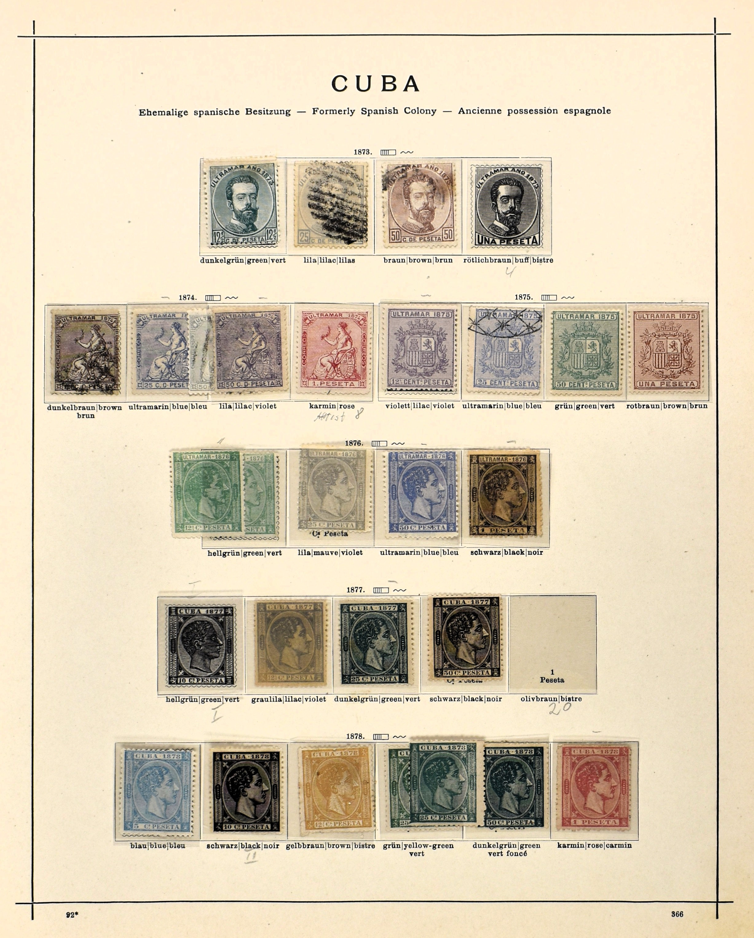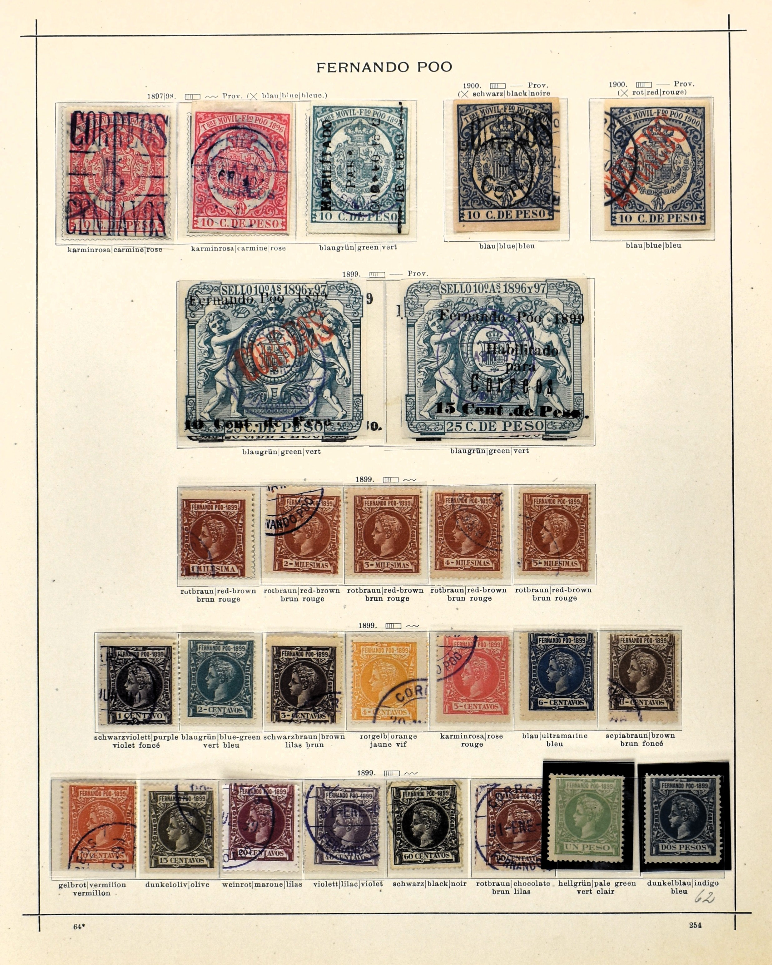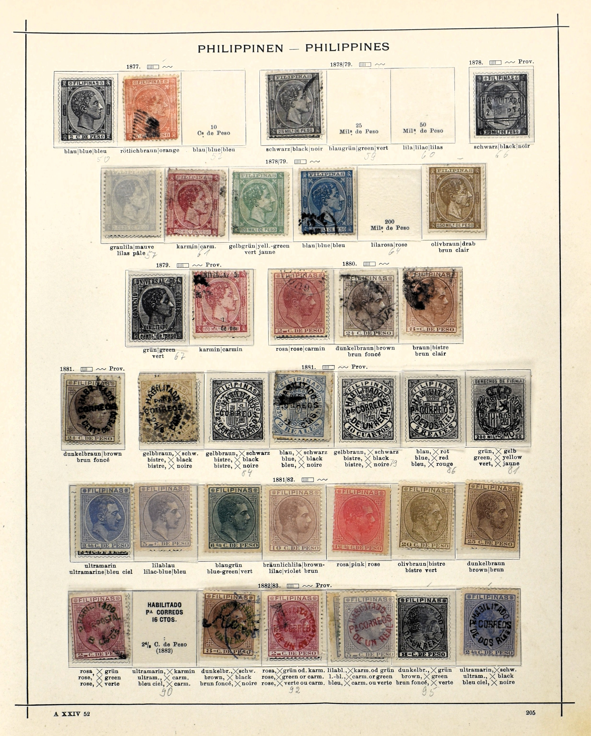 SPANISH COLONIES 1855-1900, o/(*)/* on album pages in mixed quality but still with with better material f.i.: Antilles Mi. 42(*), Cuba 8(*), Fernando Poo 1, 41, 61/62, 86, 104, Philippines 15/16, 40/44, 142*, 217* and postage due 1/7. (Image) (Image2)