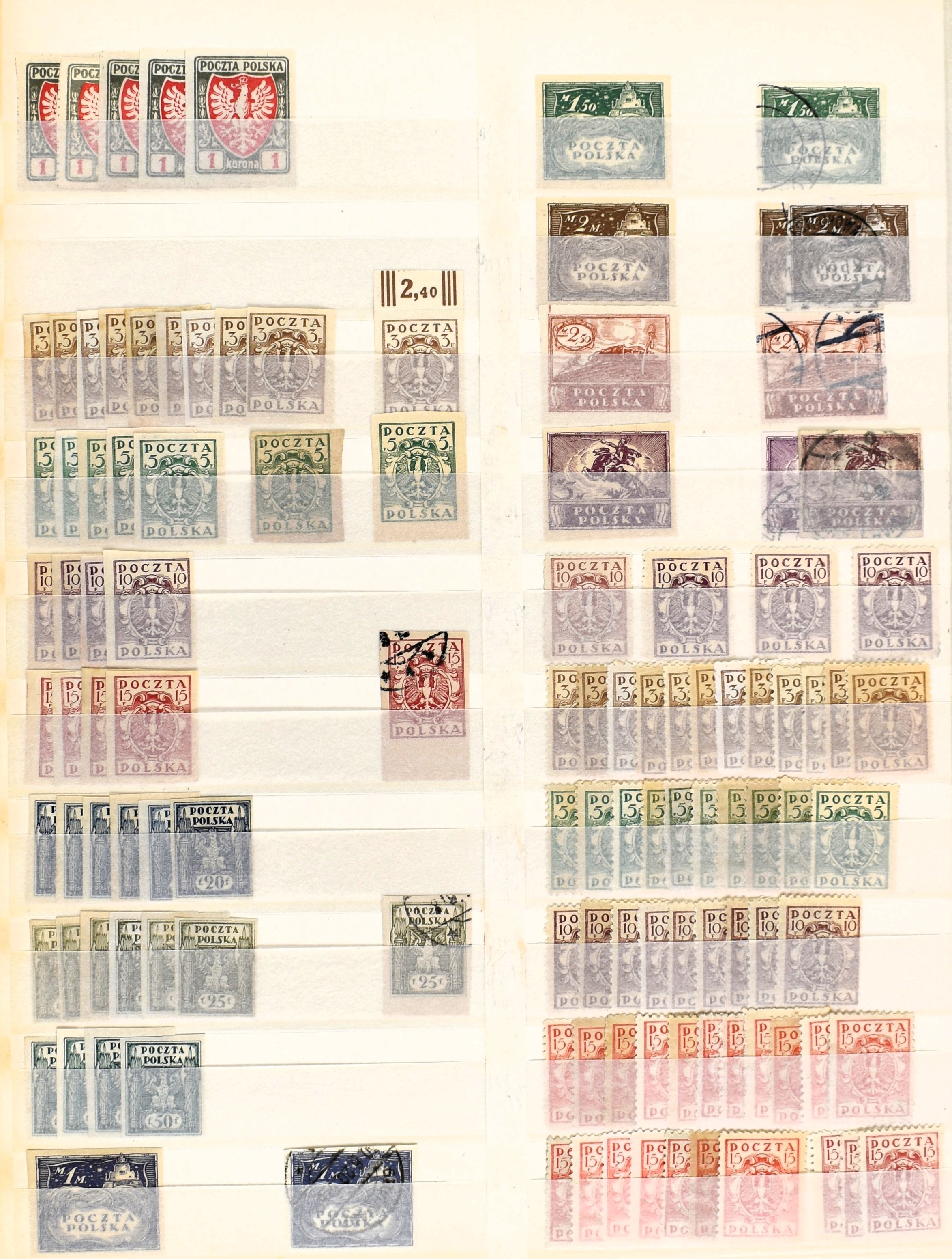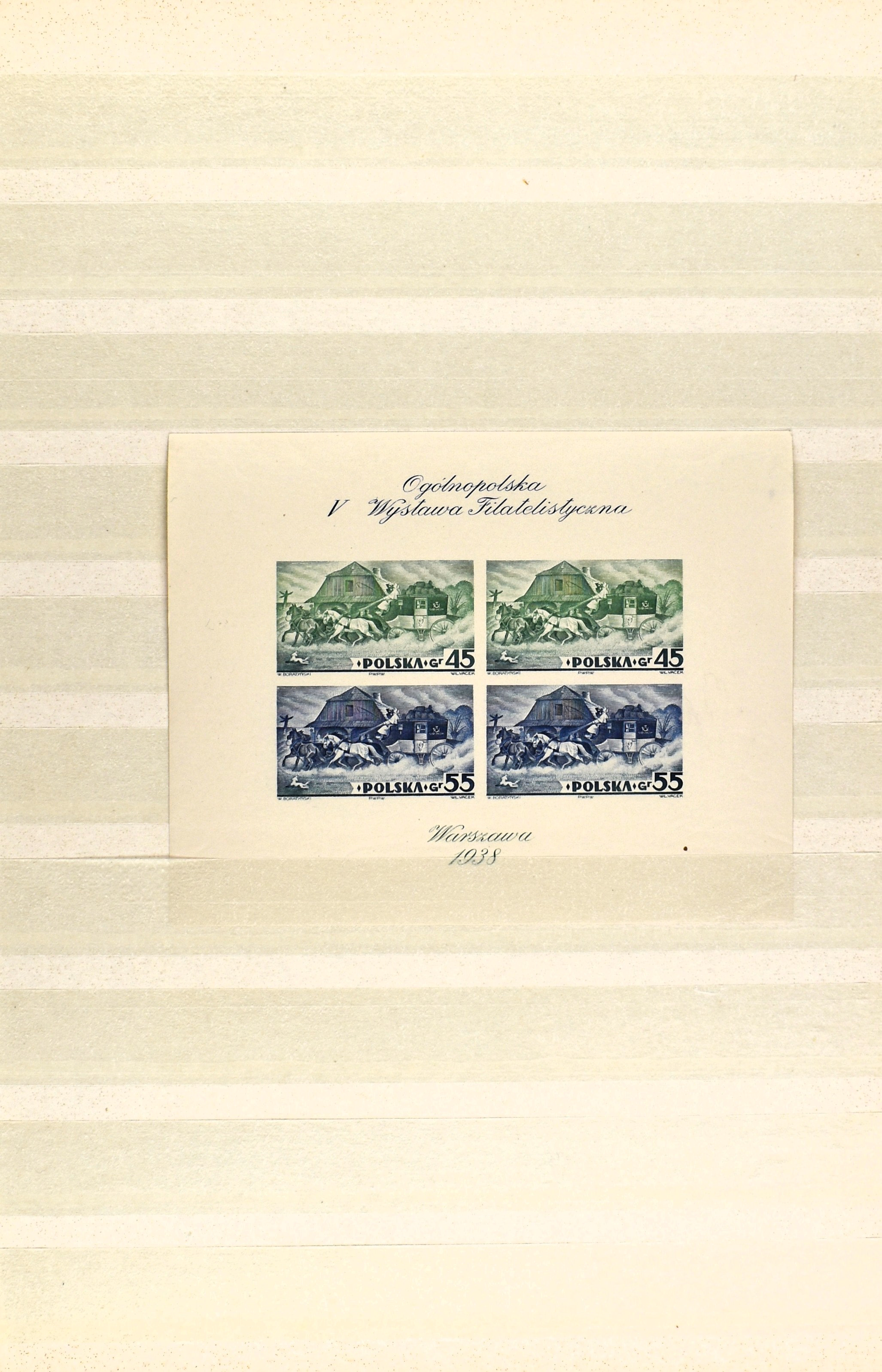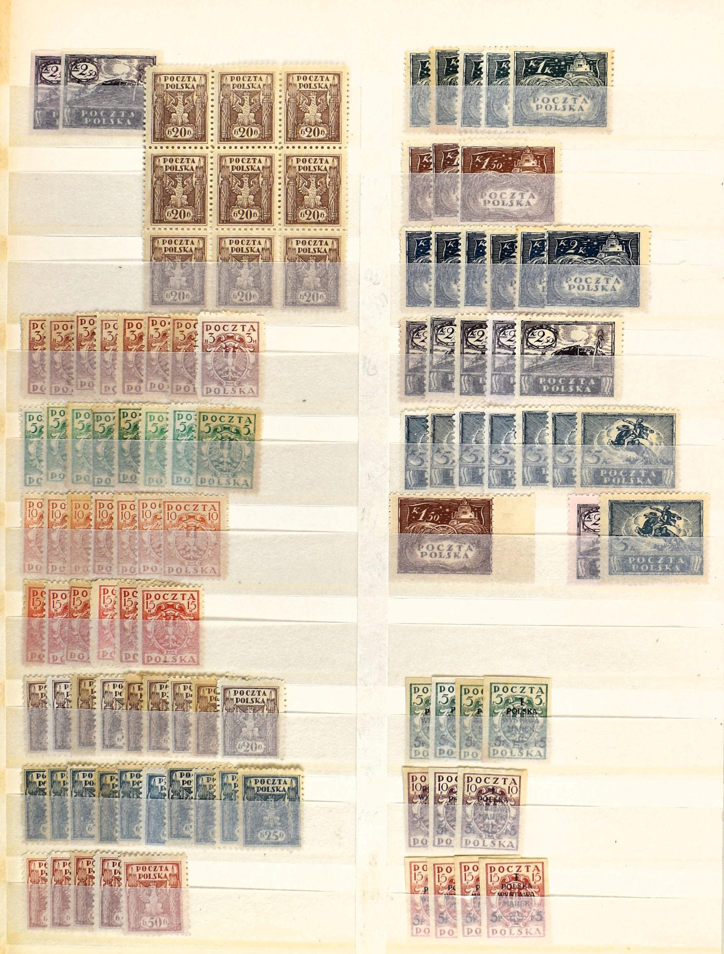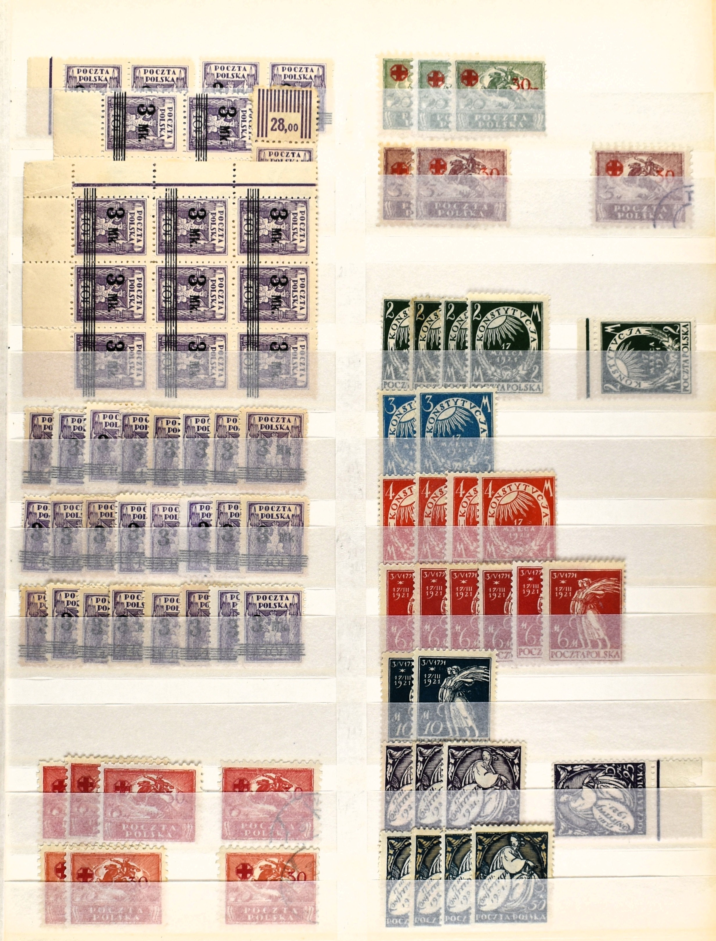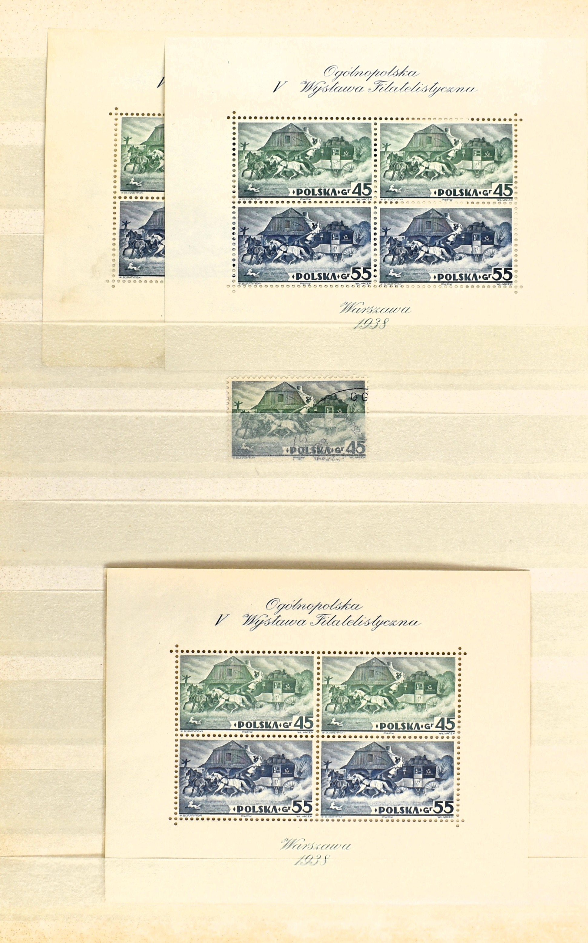 POLAND 1918-1976, o/*/** extensive stock in 4 books and 2 albums with good material a.o.: Mi.1, 154/7(3), 201/11, 445/47(4), Block 1, 5A+B, 6, (4), I/II(2)* and (*), miniature sheet etc. Beautifull lot at a very modest starting price,