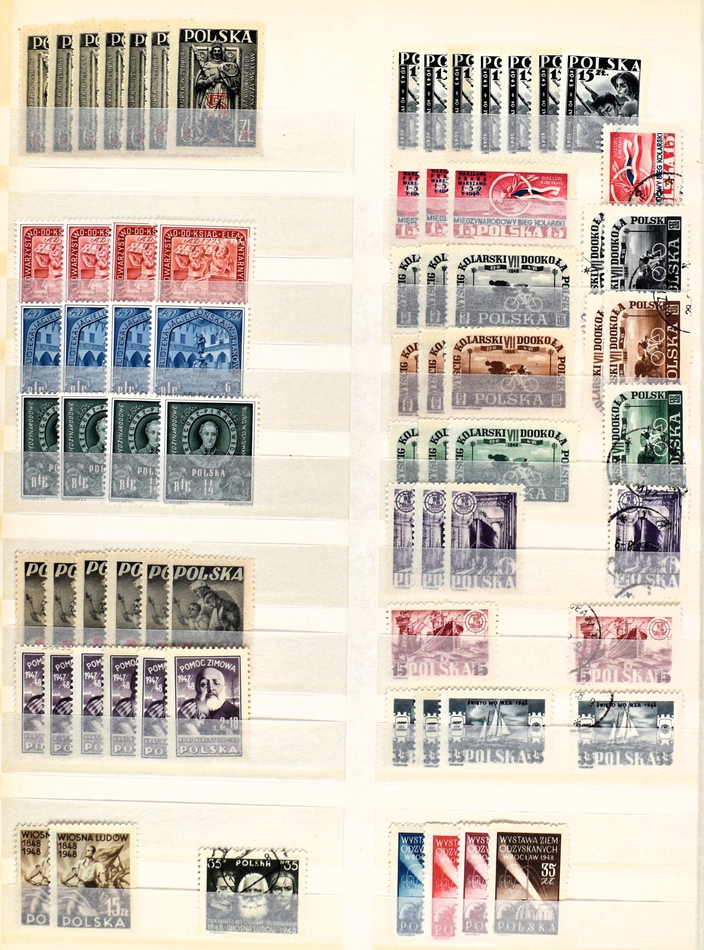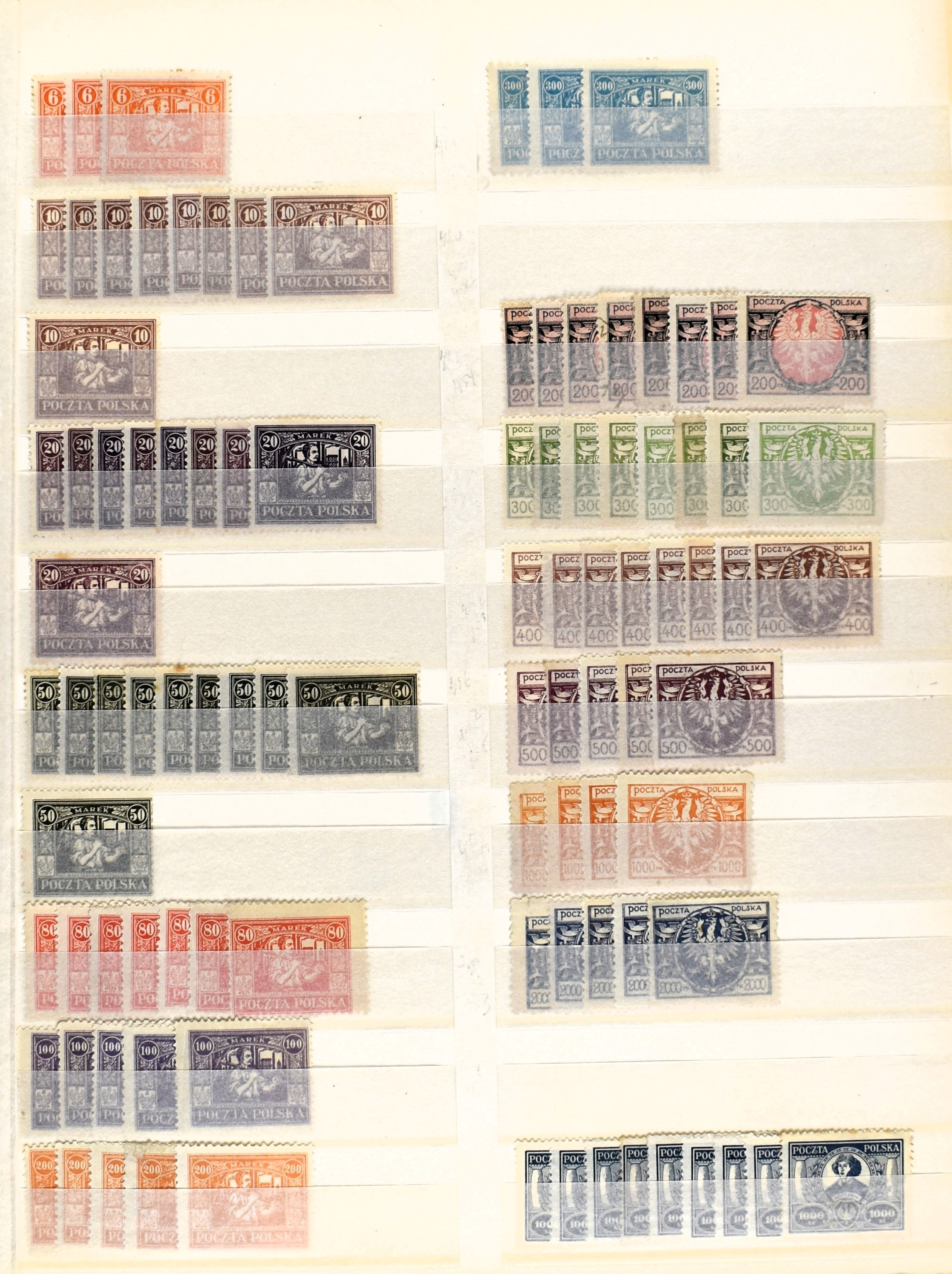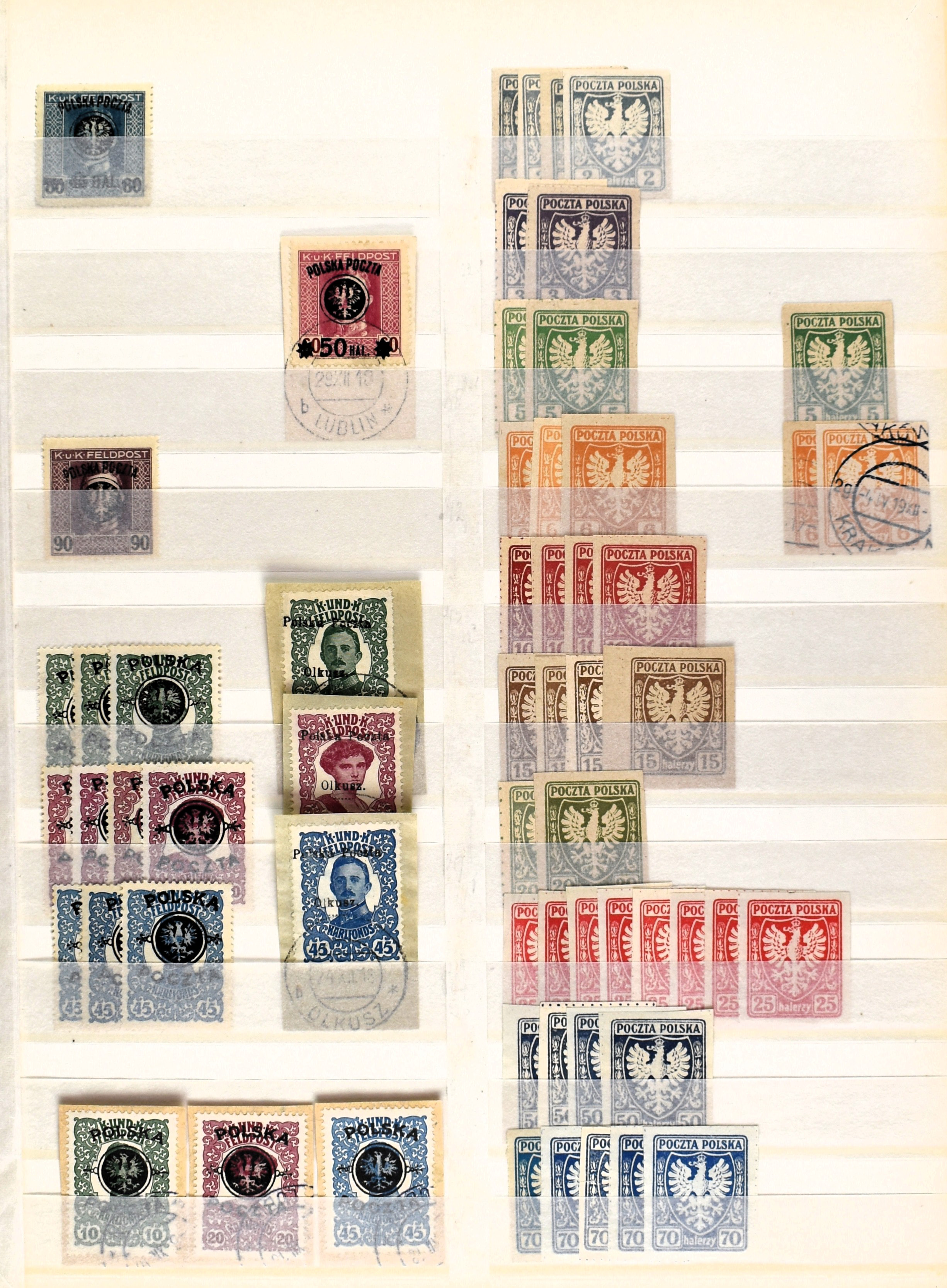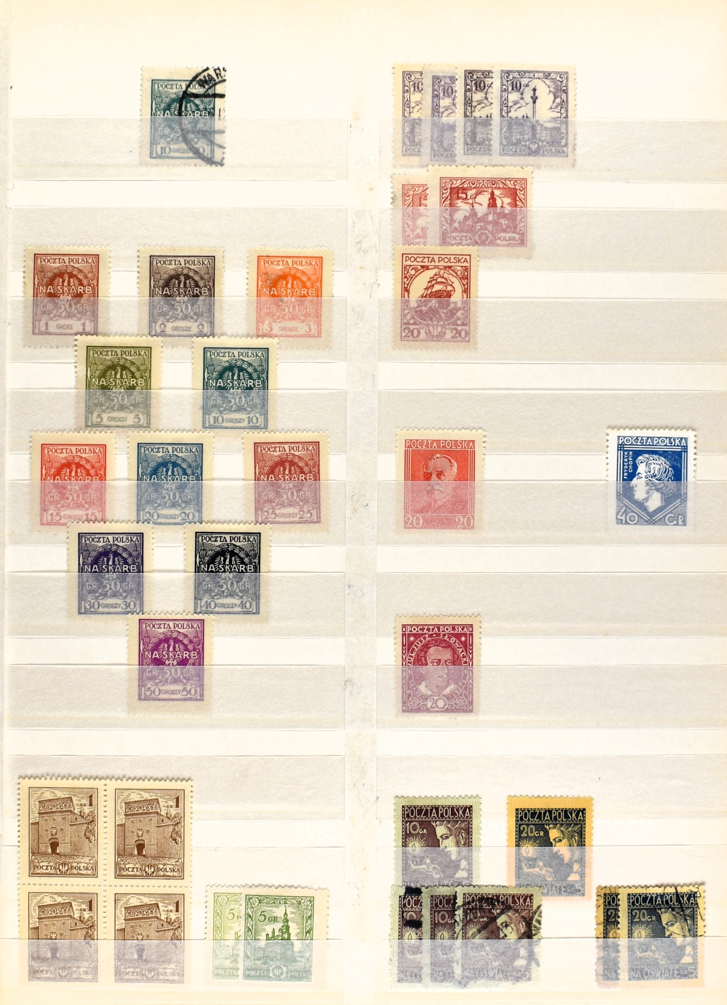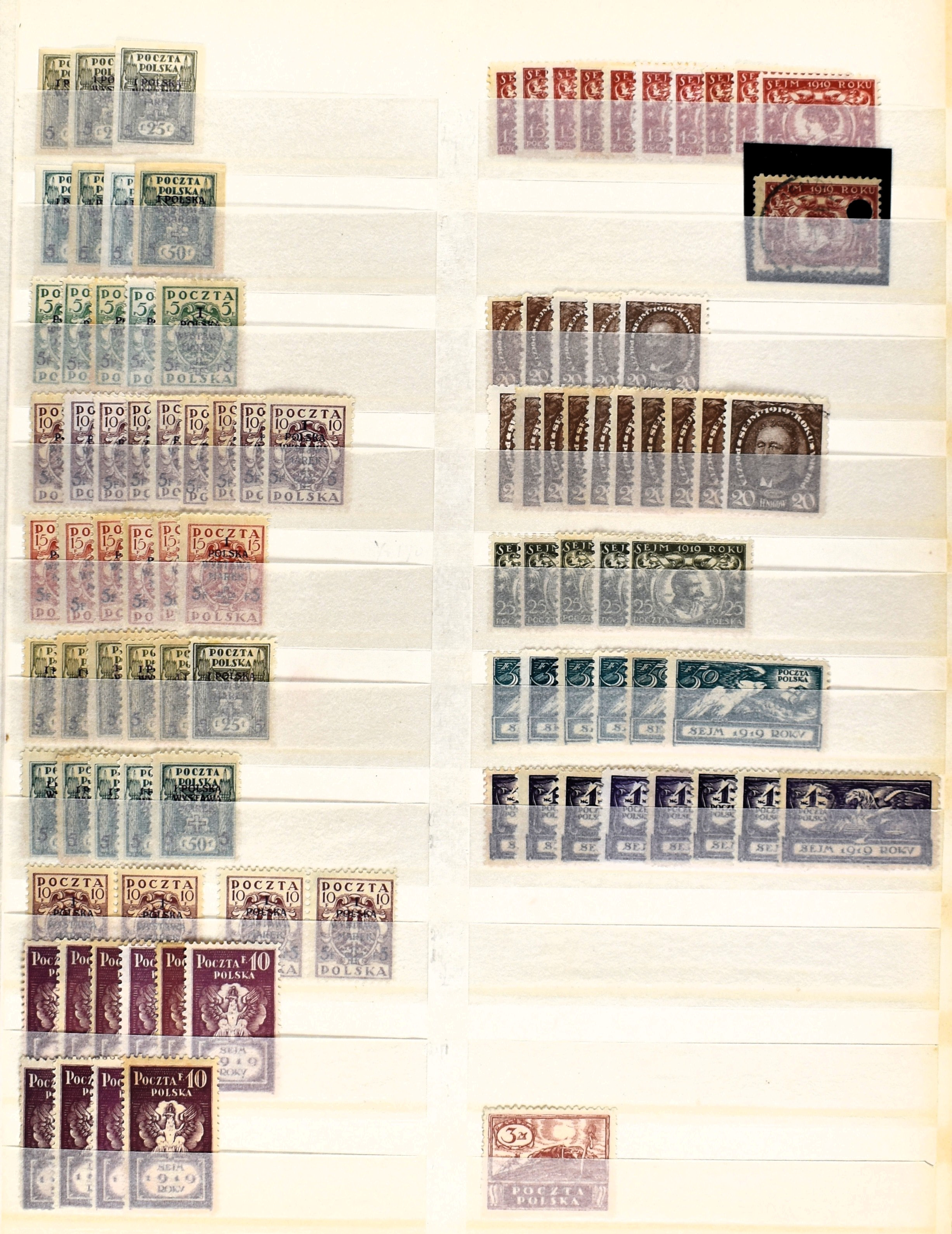 POLAND 1918-1976, o/*/** extensive stock in 4 books and 2 albums with good material a.o.: Mi.1, 154/7(3), 201/11, 445/47(4), Block 1, 5A+B, 6, (4), I/II(2)* and (*), miniature sheet etc. Beautifull lot at a very modest starting price,