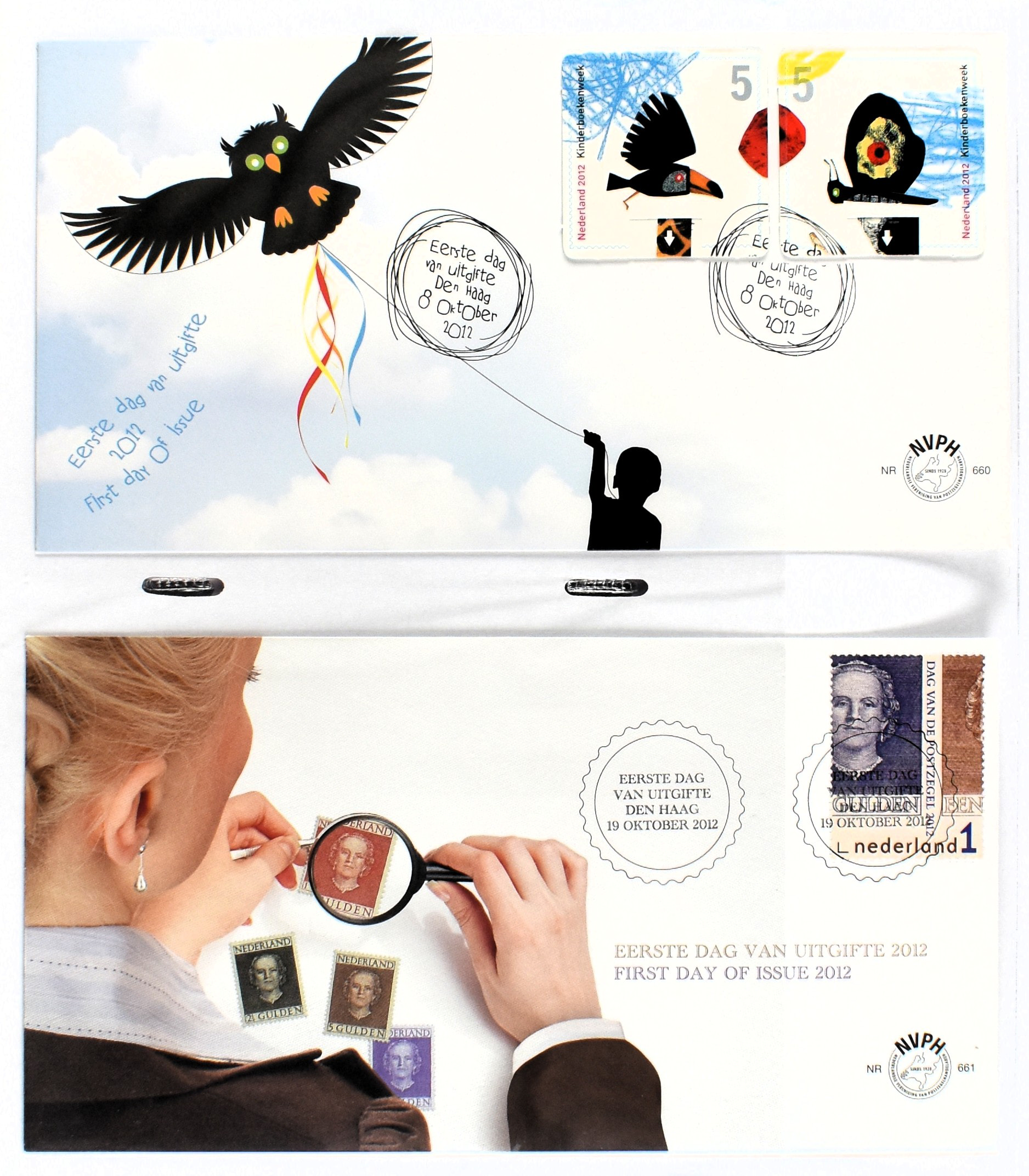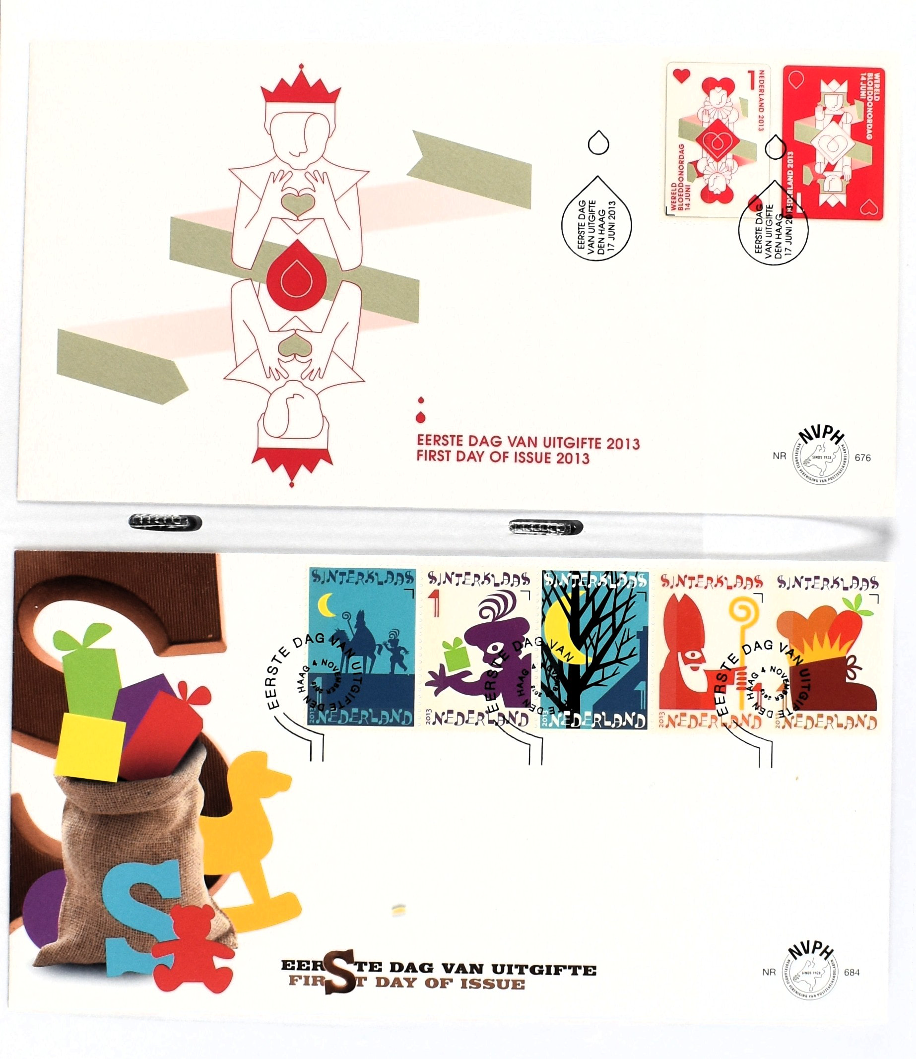 NEDERLAND, verzameling FDCs tussen E4-E689 in het begin met beschreven adres, en ook speciaal-enveloppen, Eerstedag-bladen, Eerstedag-kaartjes en iets divers. Totaal opgeborgen in 21 mappen en 2 doosjes. In 2 verhuisdozen (Image) (Image2)
