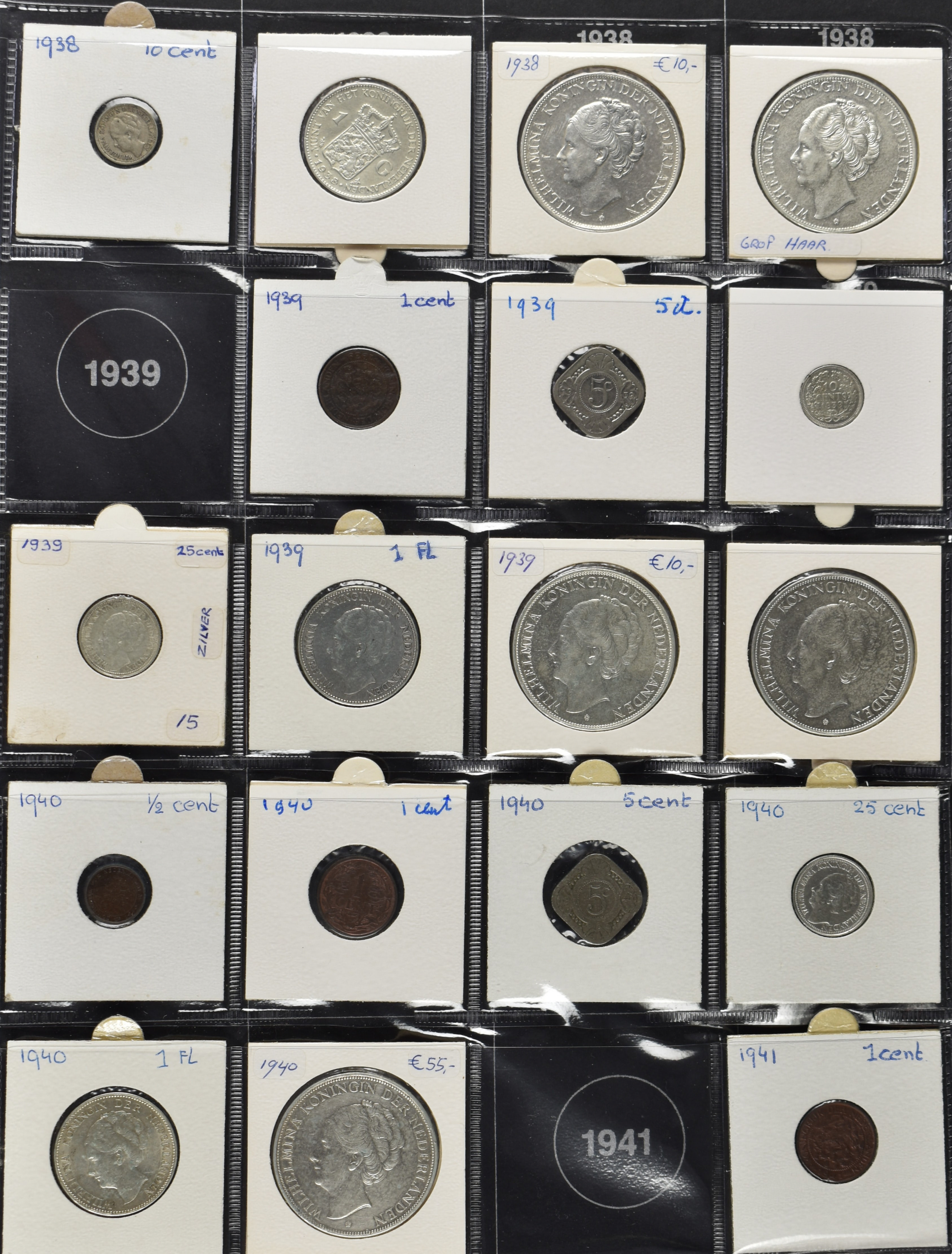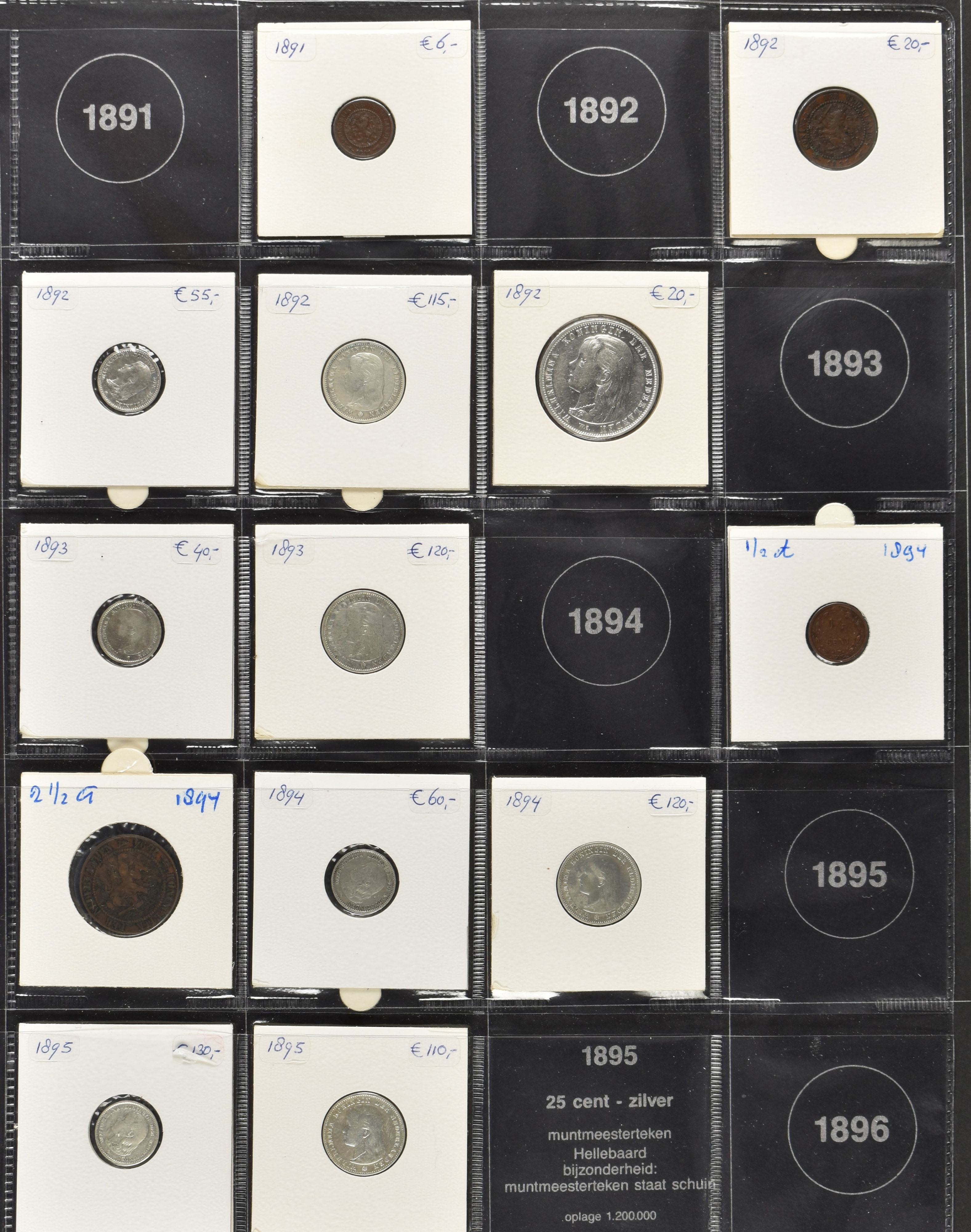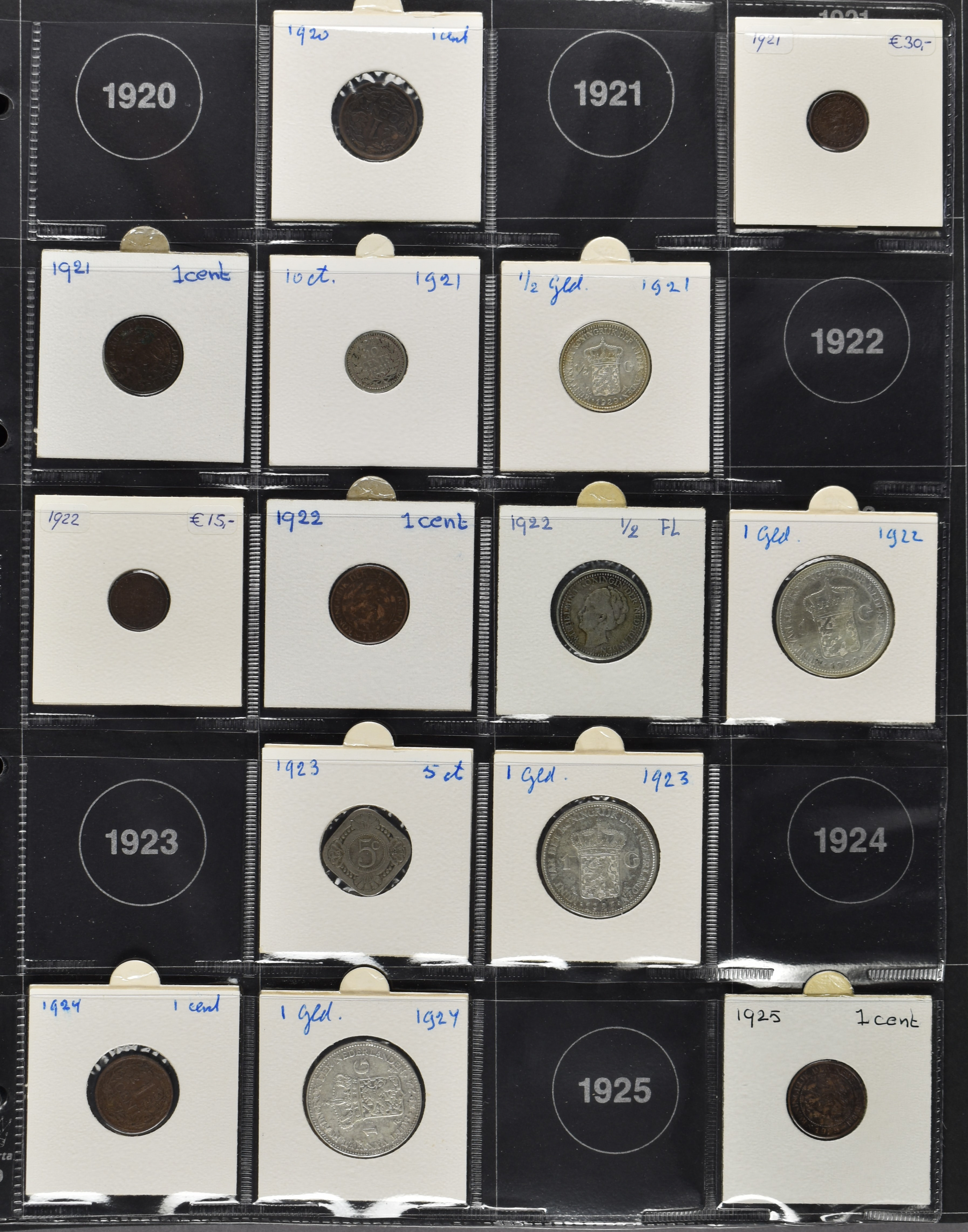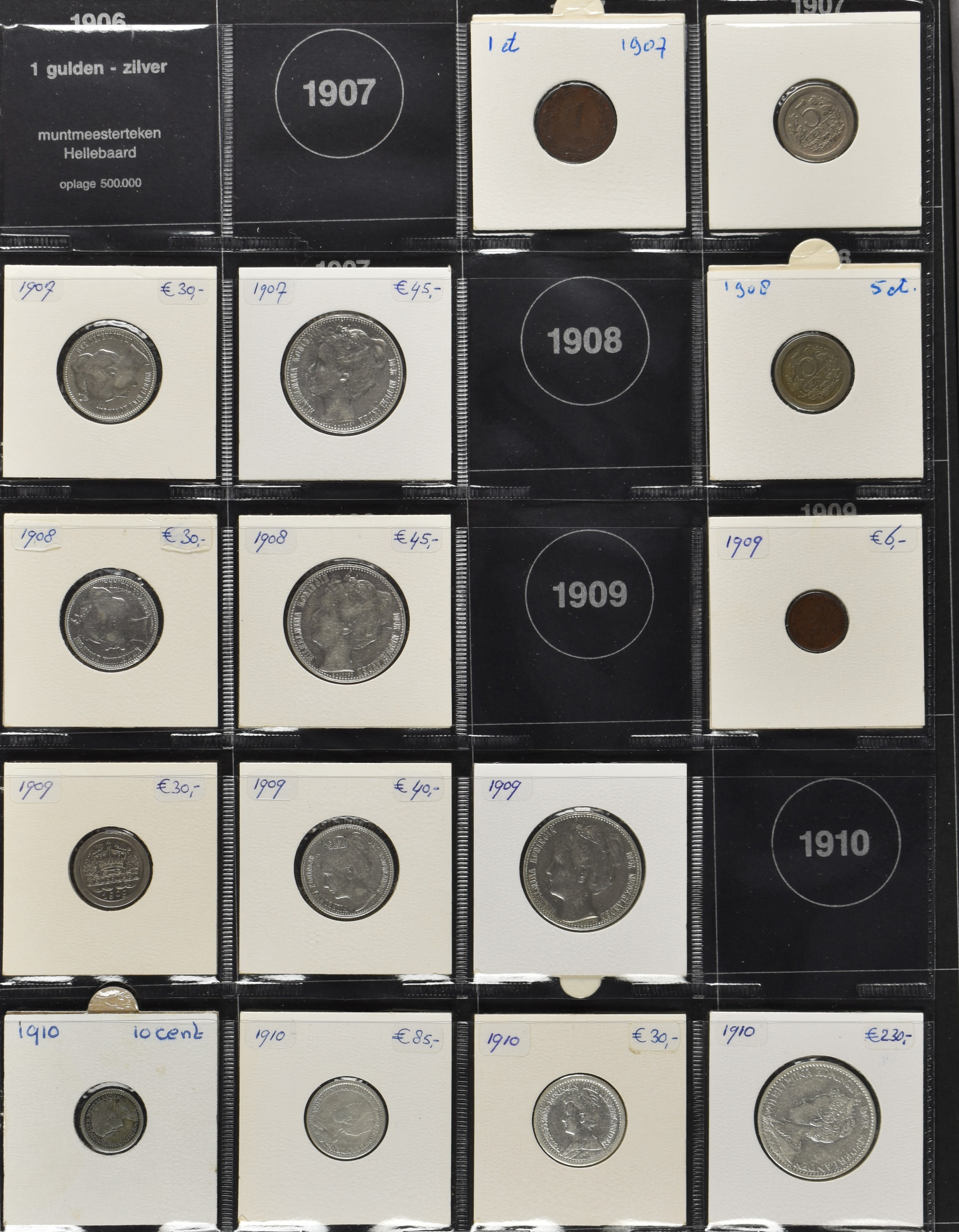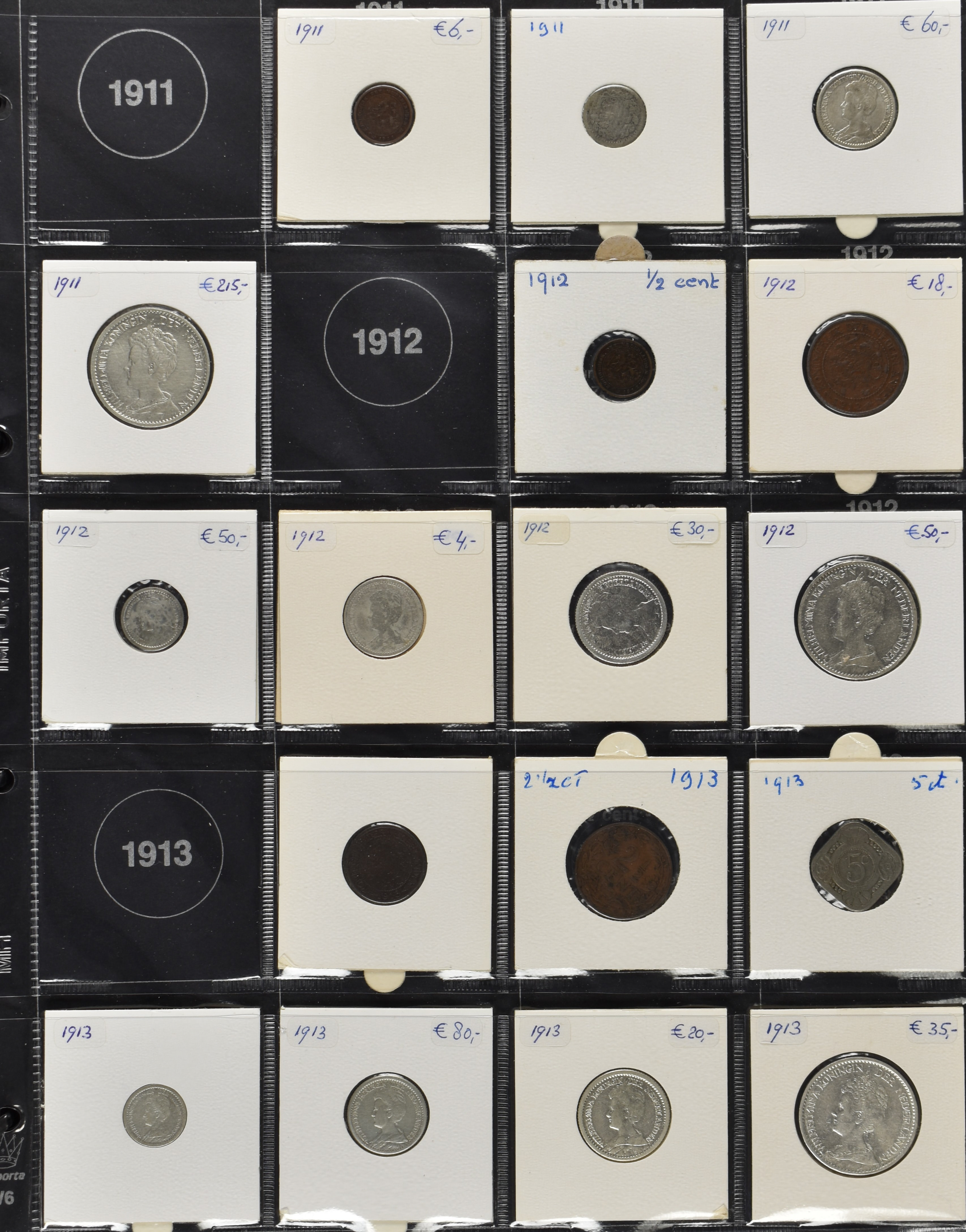 NEDERLAND, jaartalverzameling koningin Wilhelmina ½ cent t/m 2½ gulden in 2 albums waarbij diverse betere jaren met o.a.: 25 cent 1896, 1 gulden 1910 en 1911, 2½ gulden 1932 en 1938 grof haar en diverse andere aardige ex. (Image) (Image2)