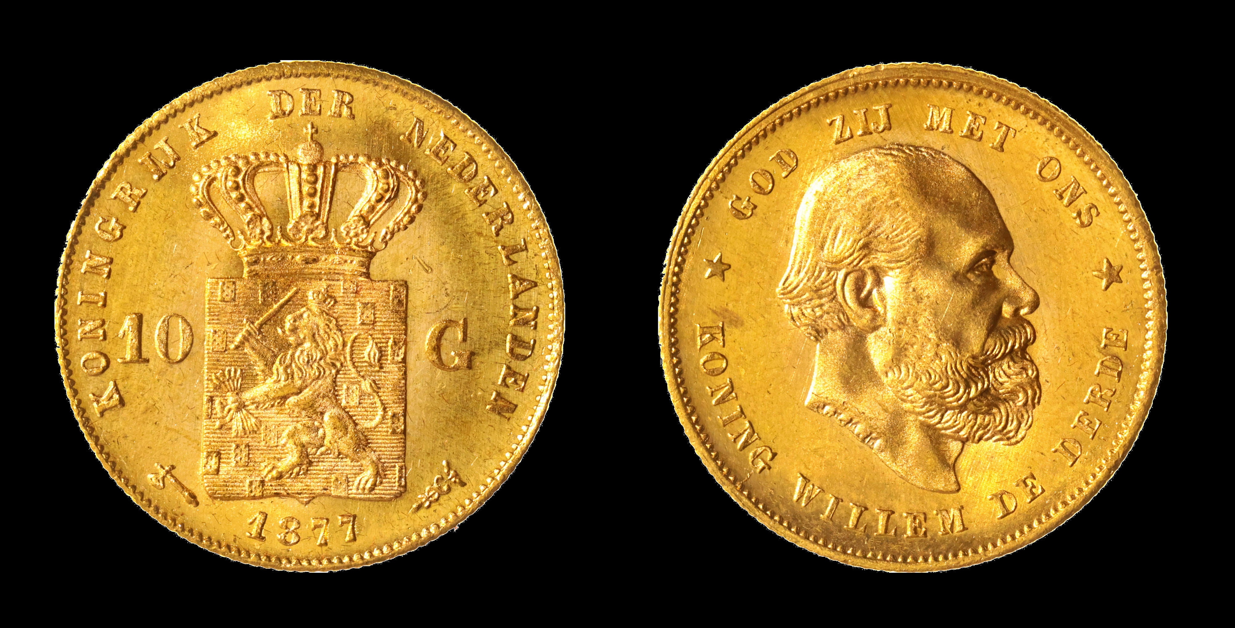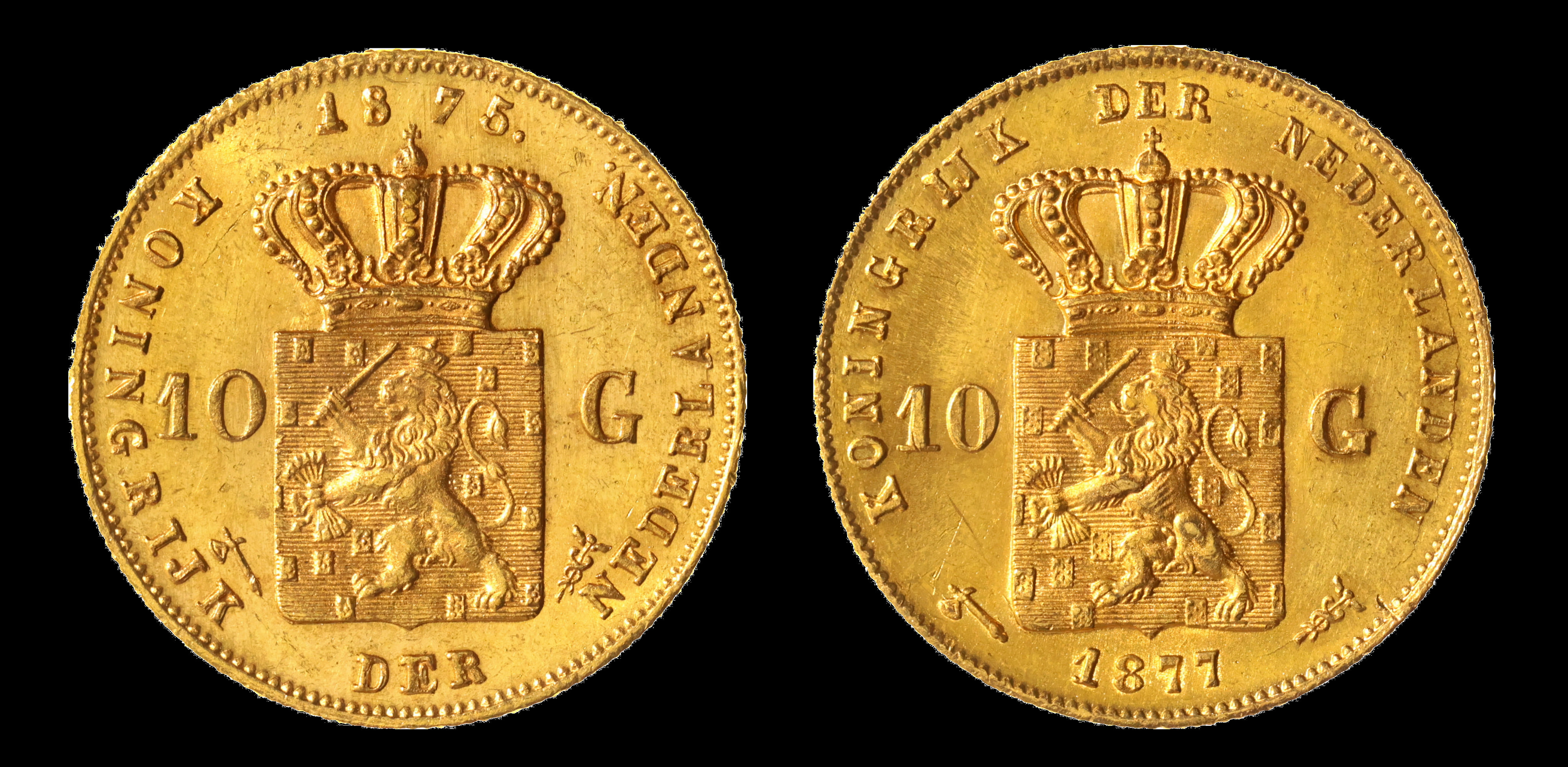 NEDERLAND, gouden 10 gulden koning Willem III 1875 (Sch.549) en 1877 (Sch.551) beide ZF/P (Image)