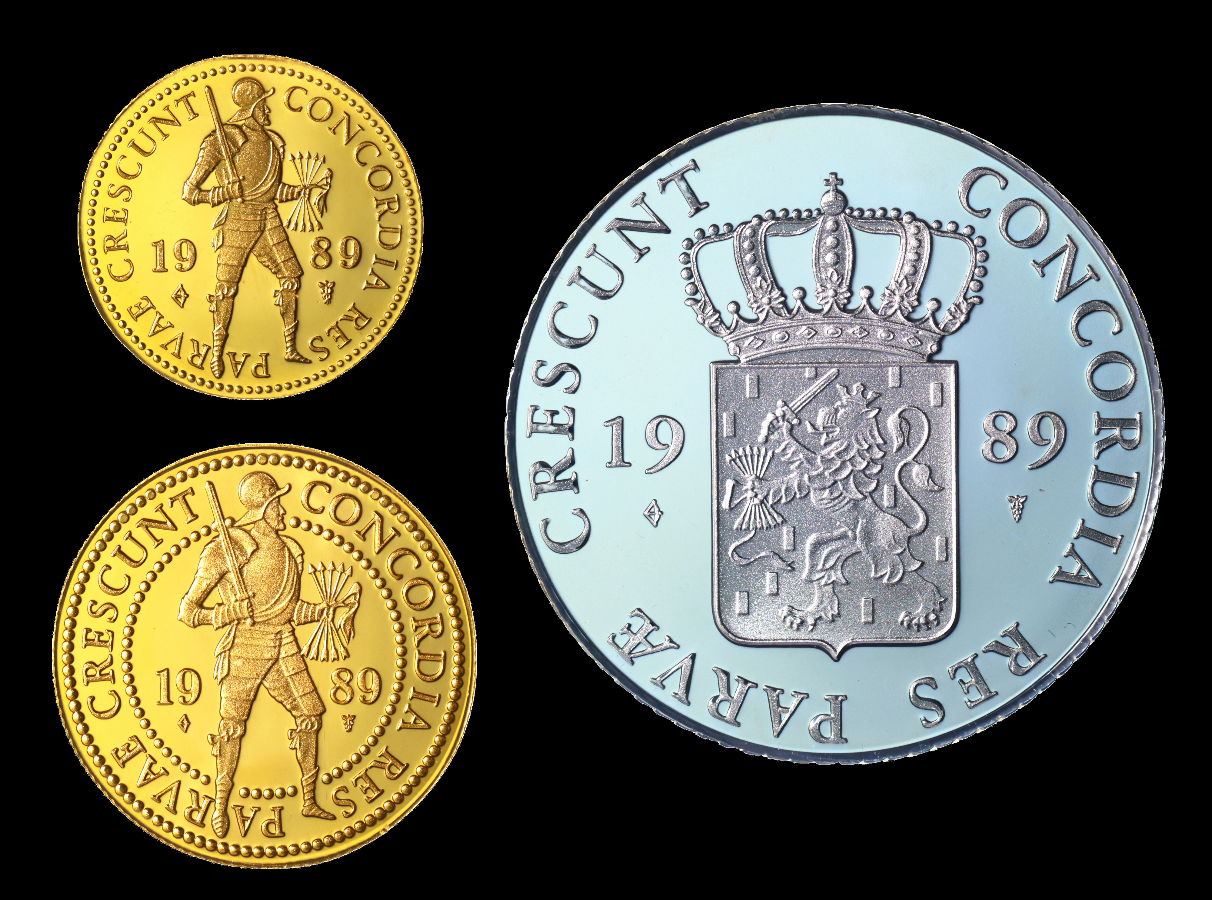 NEDERLAND, Dukaten set 1989 met 1 enkel gouden-, 1 dubbele gouden- en 1 zilveren Dukaat in bijbehorende cassette (Image)
