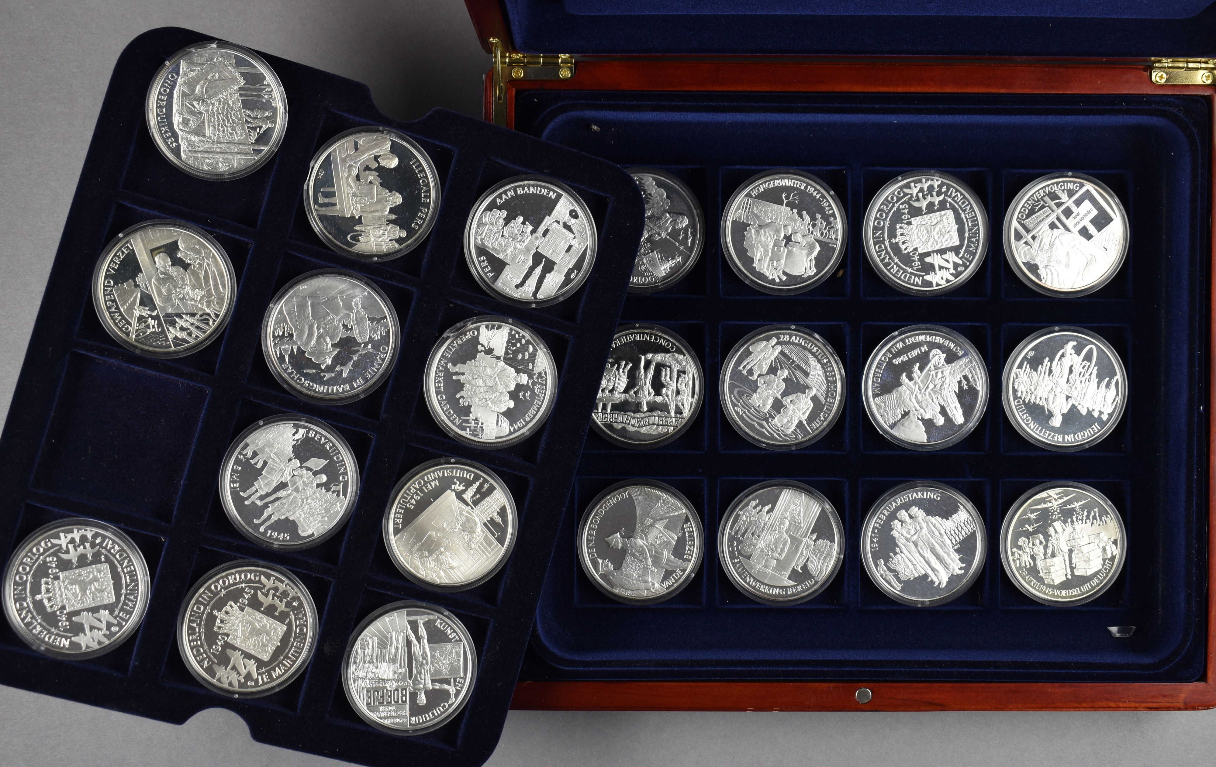 PENNINGEN, 23 Sterling zilveren penningen met thema'Nederland in oorlog' in houten cassette, in totaal 719 gram .925 (Image)