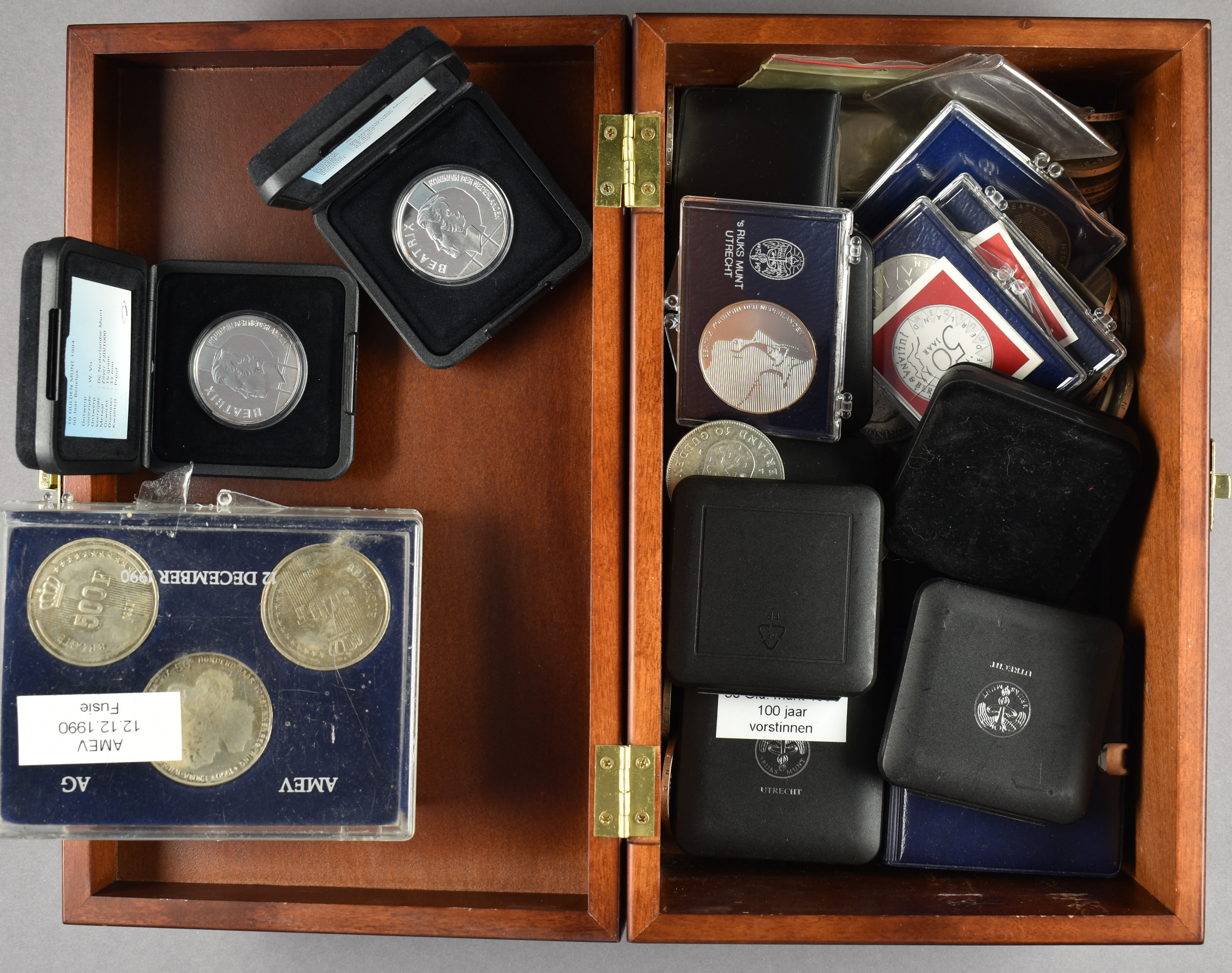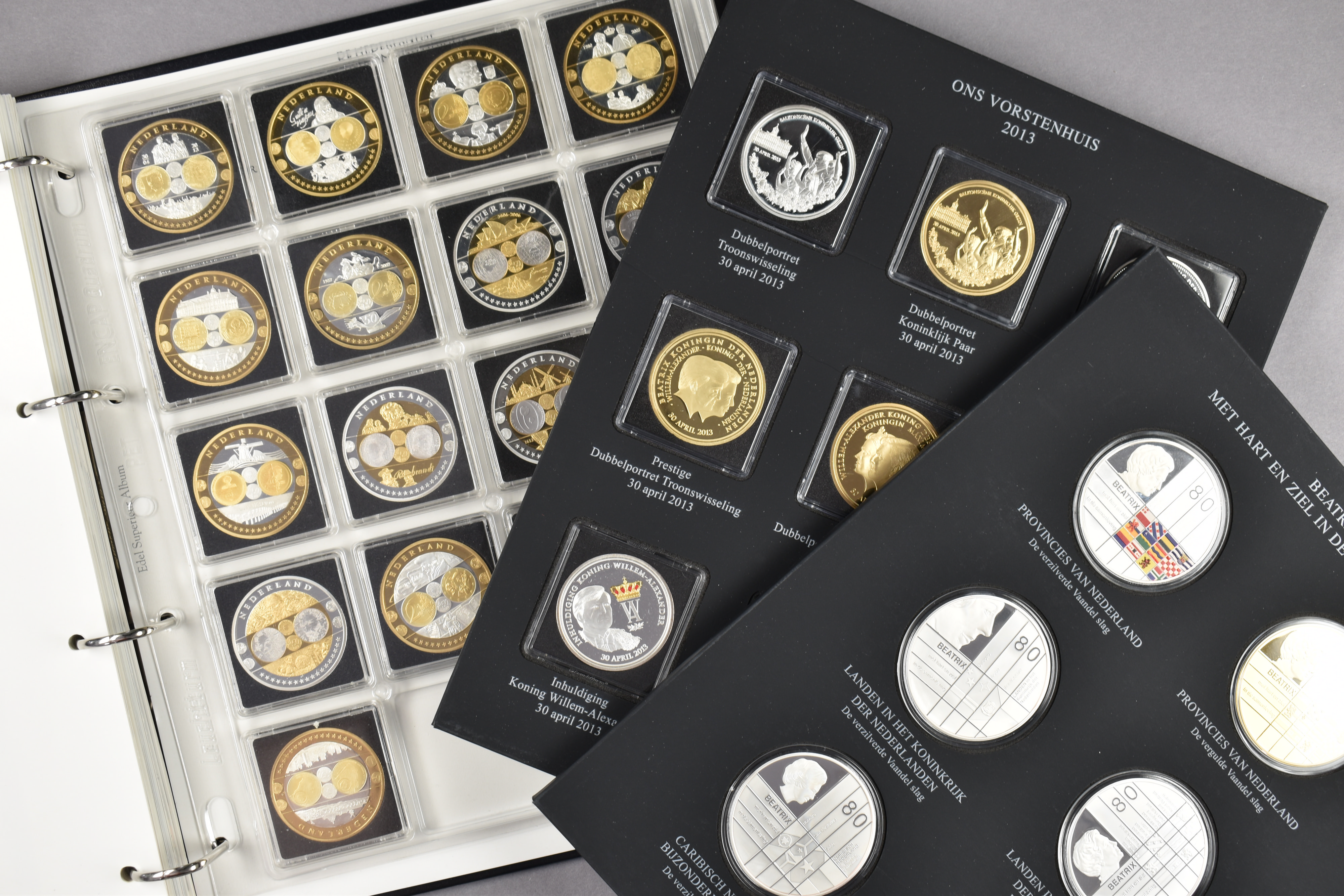 NEDERLAND, 96 verzilverde en vergulde penningen , uitgiften van PostNL en Edel hoofdzakelijk over het koningshuis alsmede 12 zilveren Maple Leafs, in 3 houten cassettes en 3 albums (Image) (Image2)