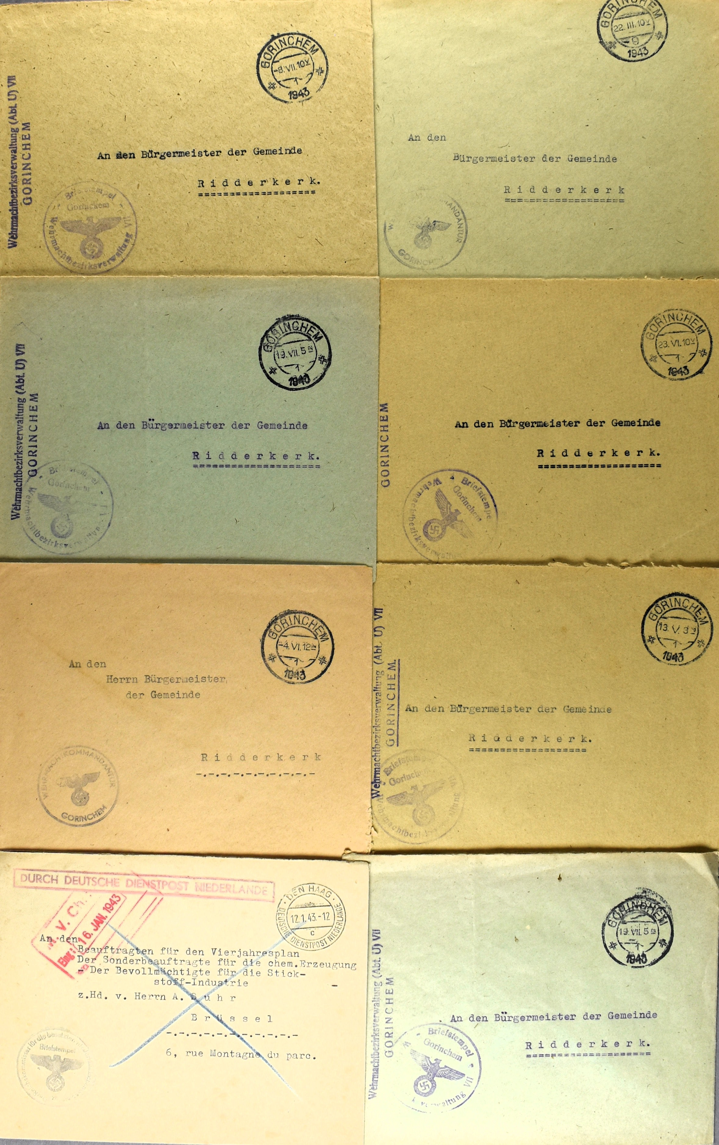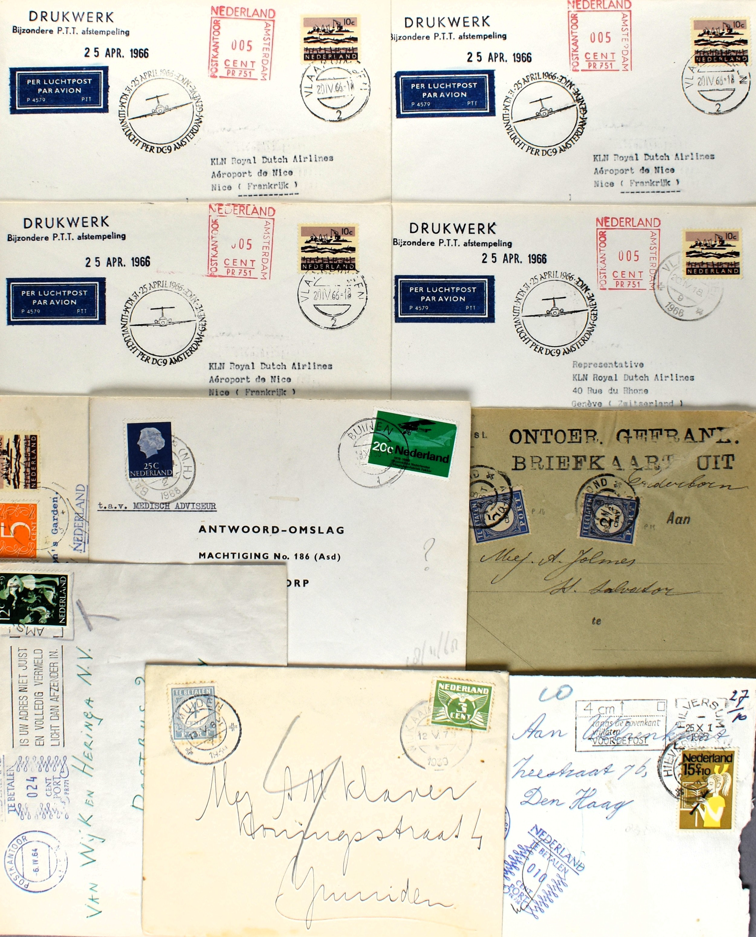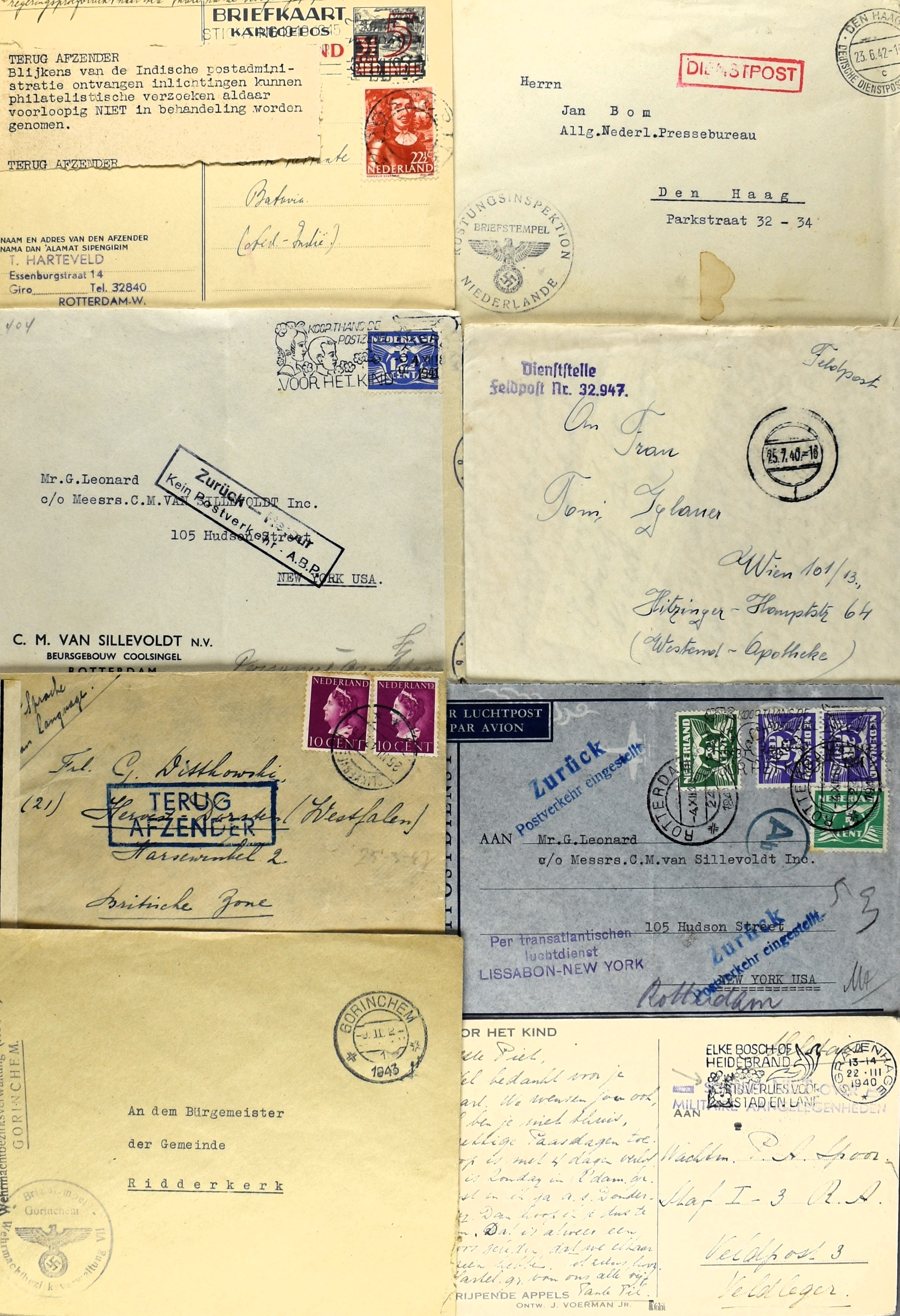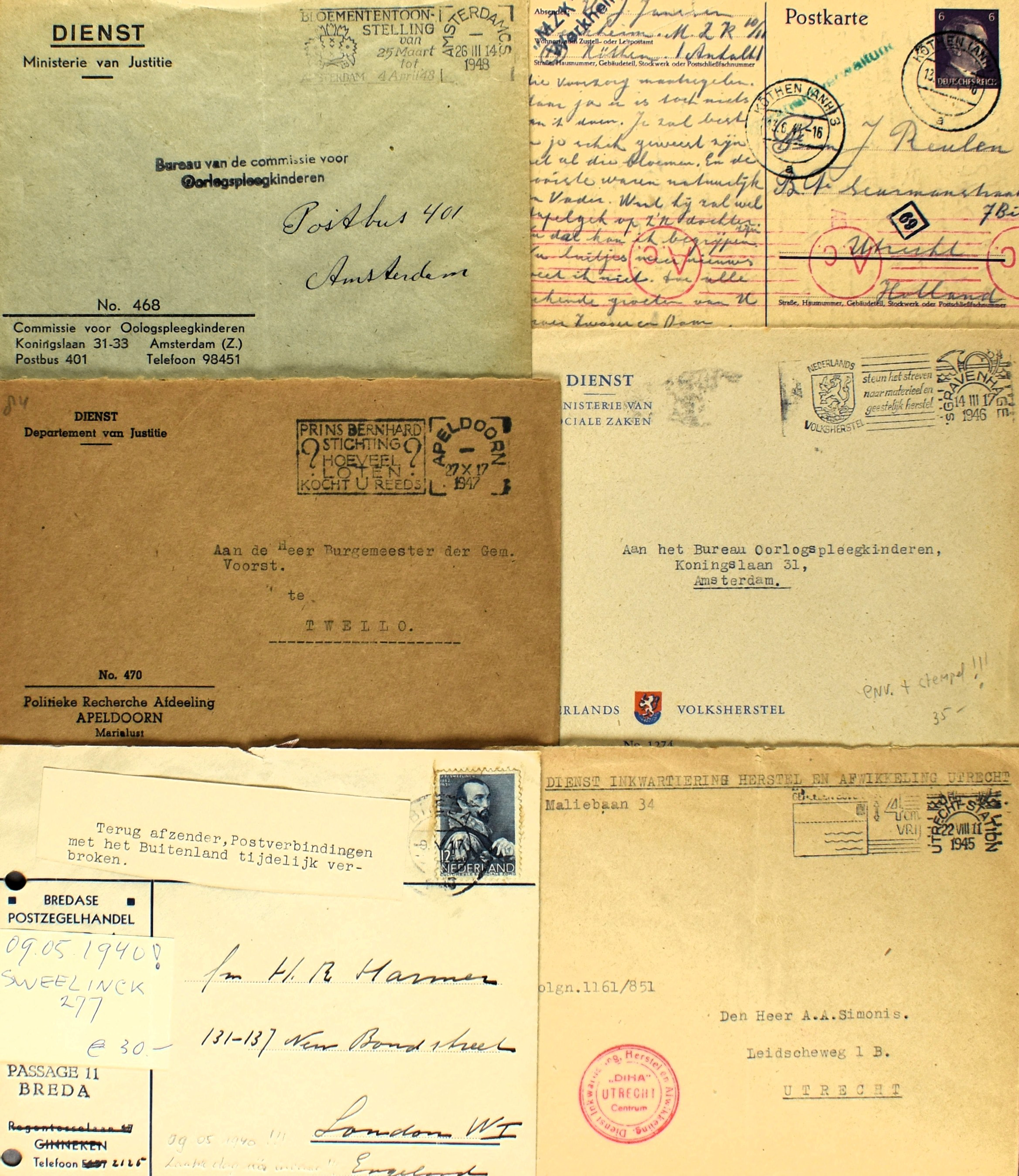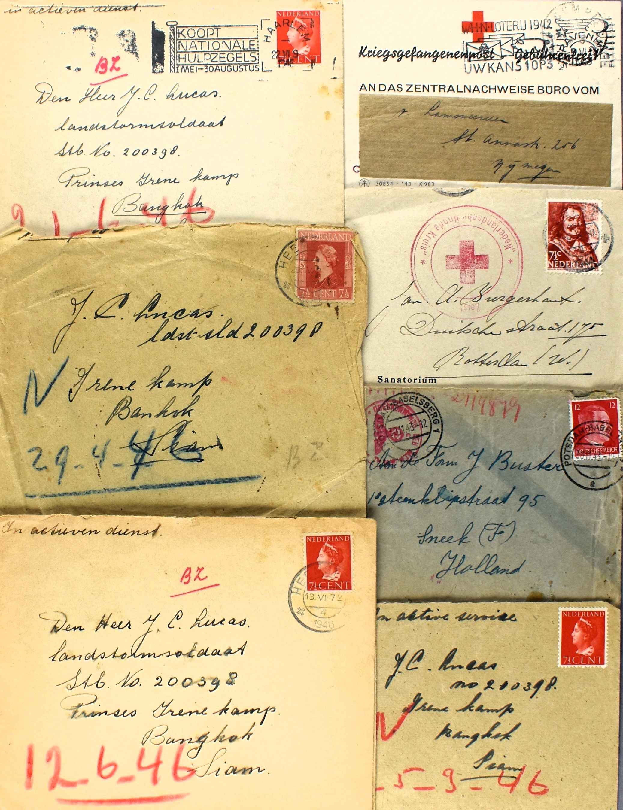 10 imageNEDERLAND TWEEDE WERELDOORLOG inclusief nasleep, 41 poststukken w.o. DDPN, dienstpost van o.a. Bureau van de commissie voor Oorlogspleegkinderen, politieke recherche, Duitse briefkaarten met "MZK" Werkheim uit Köthen (Anh), retour, etiketten, censuren, Rode Kruis, 7 enveloppen uit begin 1946 van Heemstede naar familielid in het Prinses Irene Kamp te Bangkok. Tevens diverse propaganda-sluitzegels van de Nederlandsche Unie, Mussert, en enkele krantenartikelen. Interessant kavel, filatelistisch en vooral historisch! (Image) (Image2) (Image3) (Image4) (Image5) (Image6) (Image7) (Image8) (Image9) (All Images)