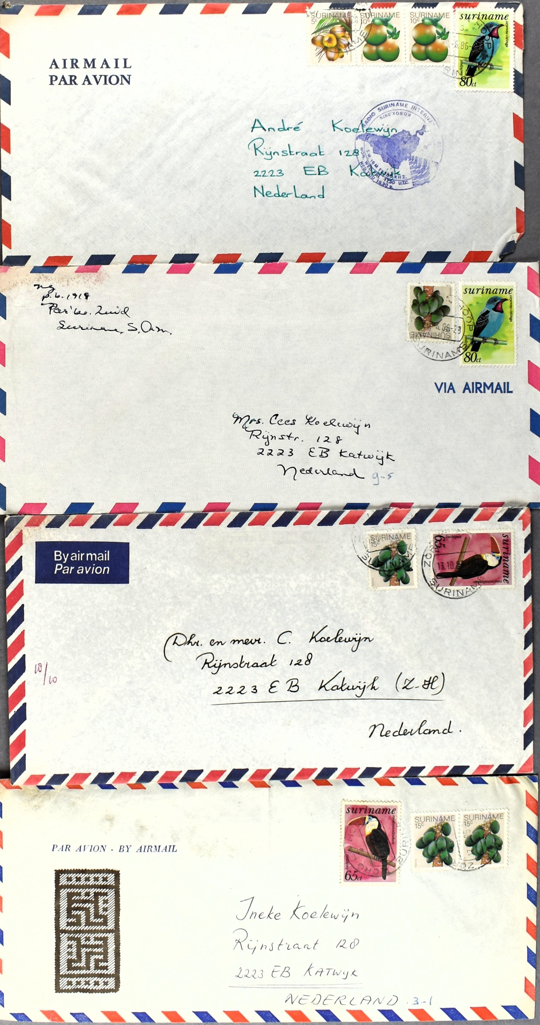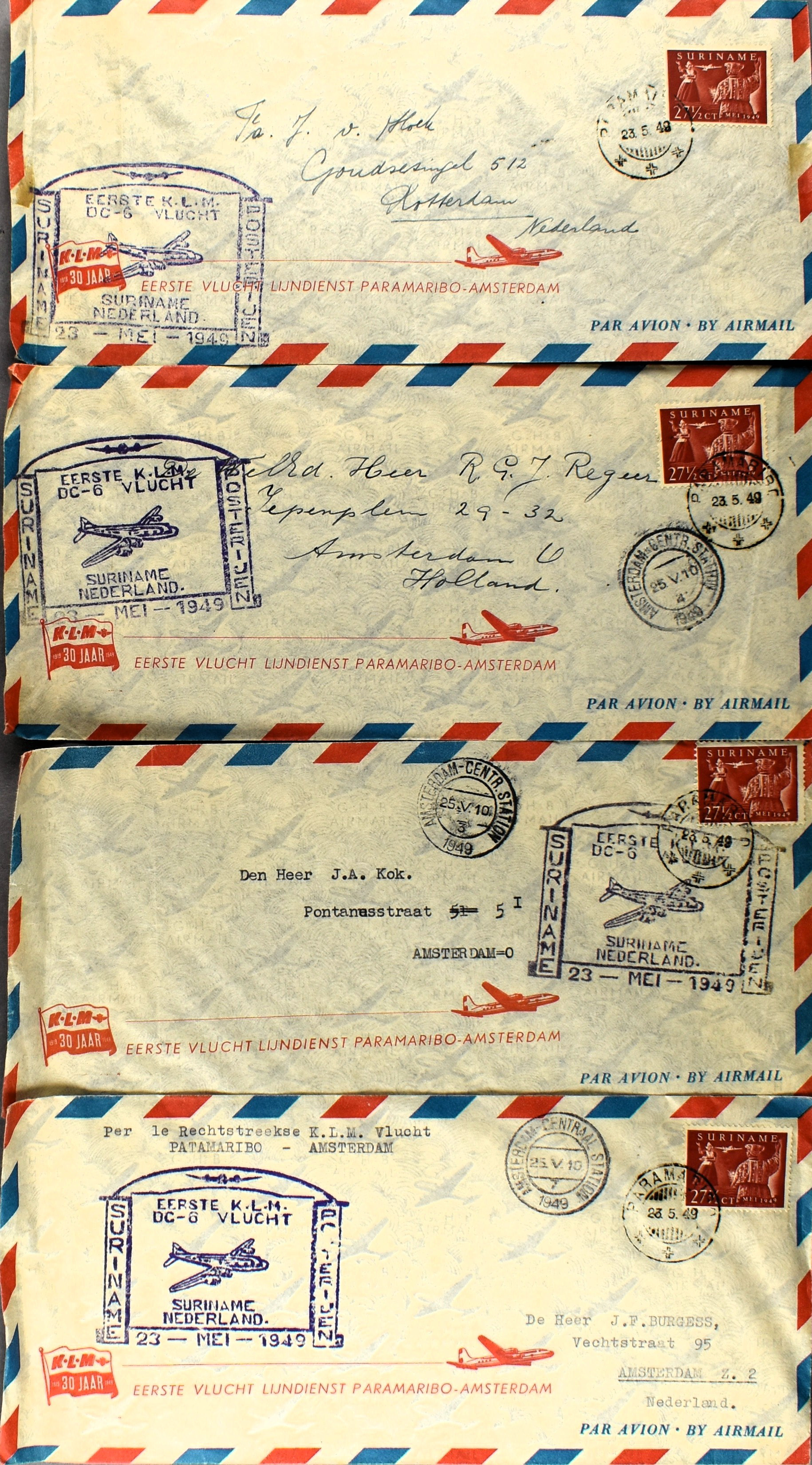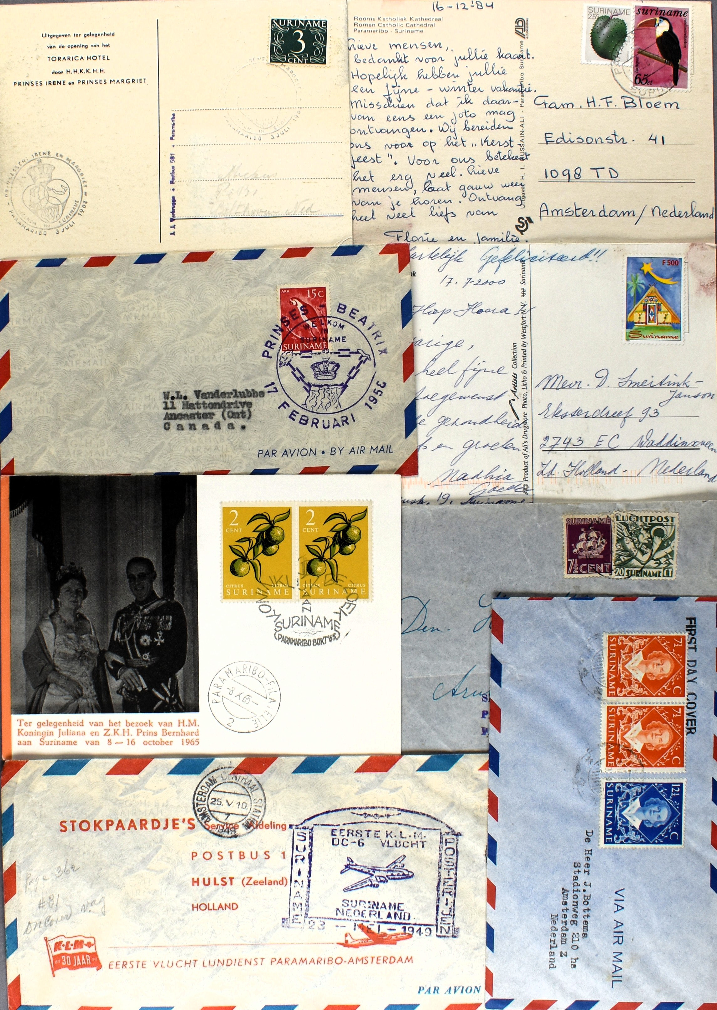 17 imageSURINAME POSTHISTORIE, partij poststukken w.o. (enkel)frankeringen, aardige variëteit aan poststempels, FDC's, luchtpost en speciale vluchten, aangetekend, censuur stempels en stroken, bestemmingen, diversen na 1975, etc. (Image) (Image2) (Image3) (Image4) (Image5) (Image6) (Image7) (All Images)