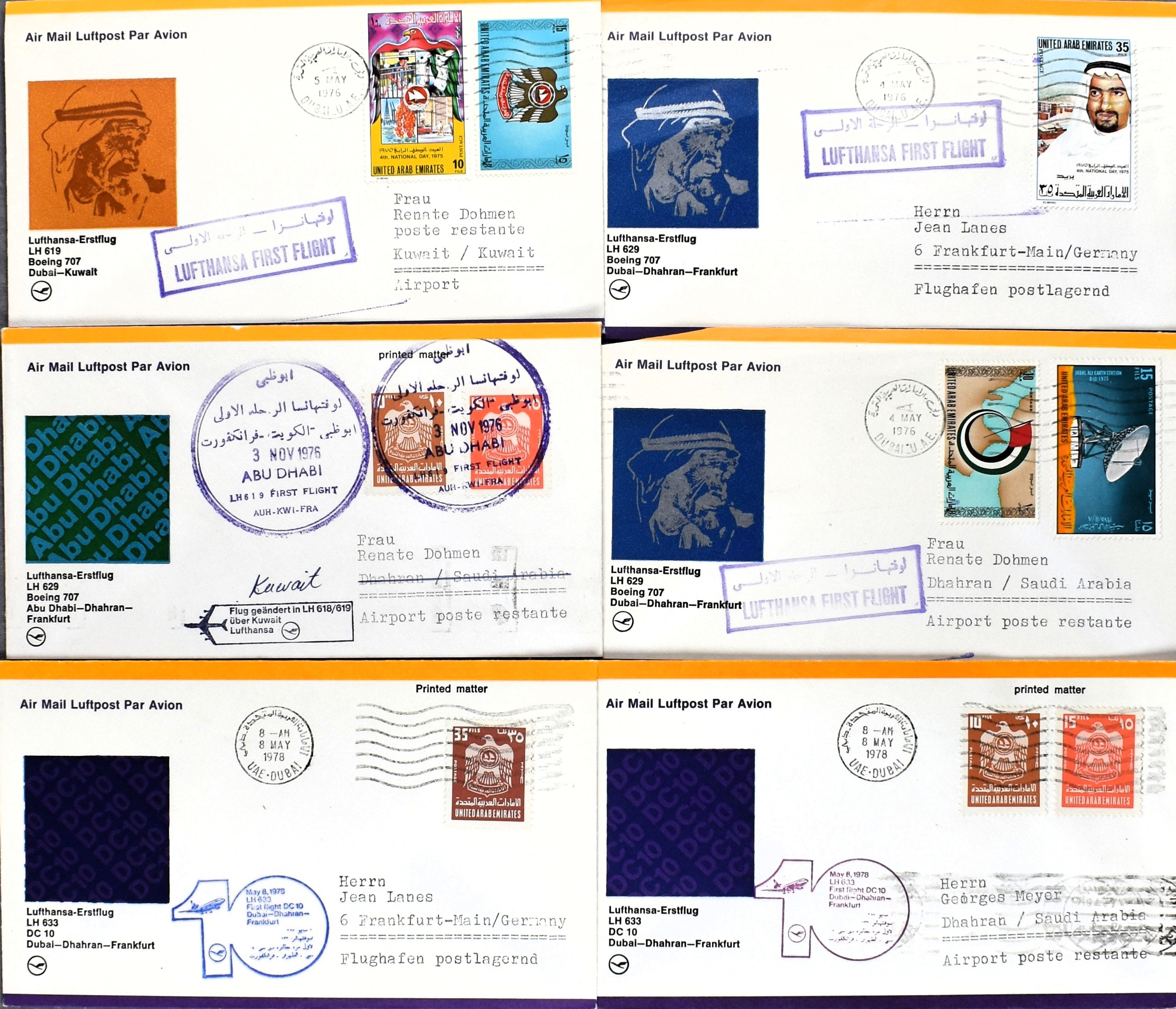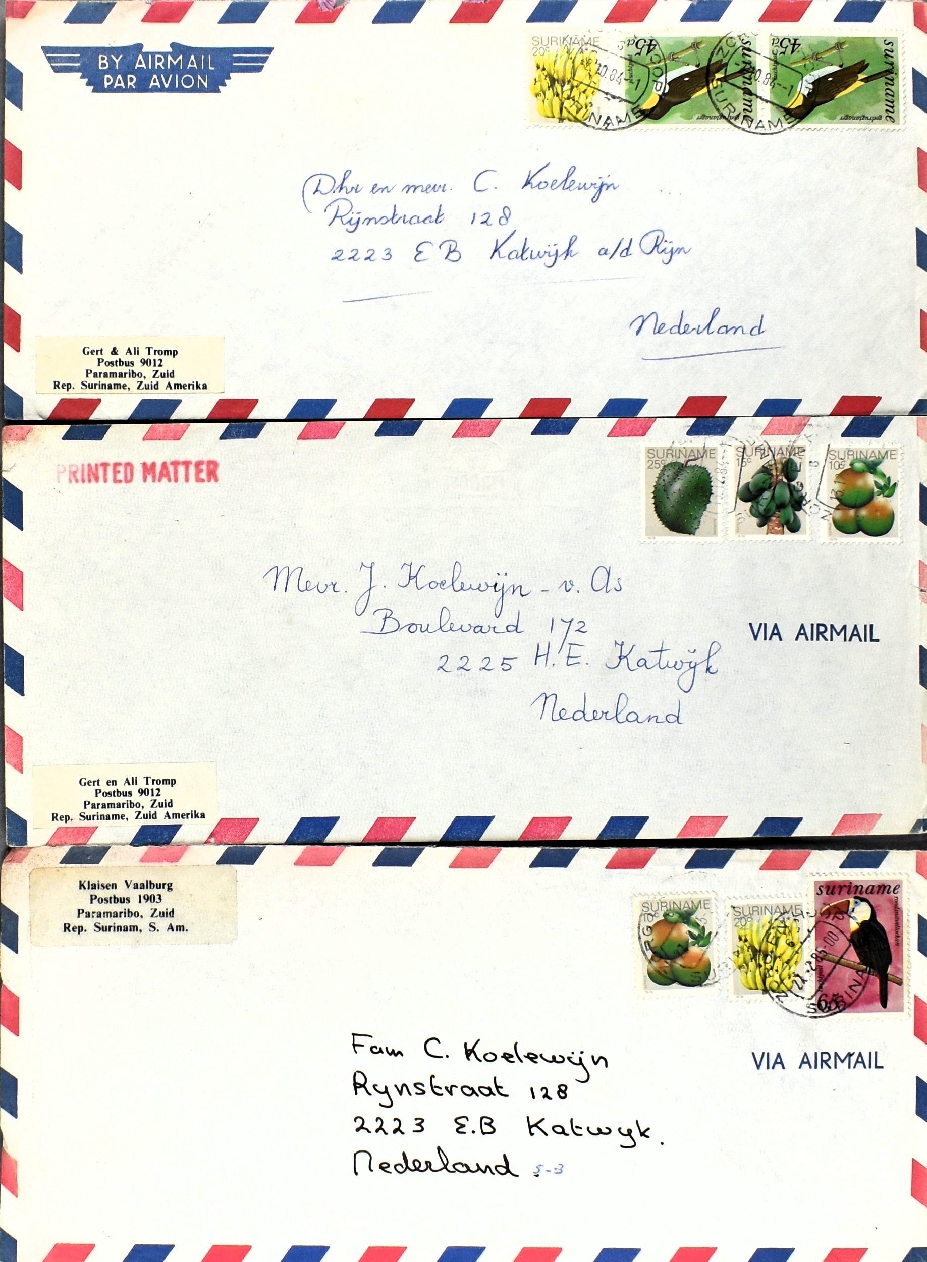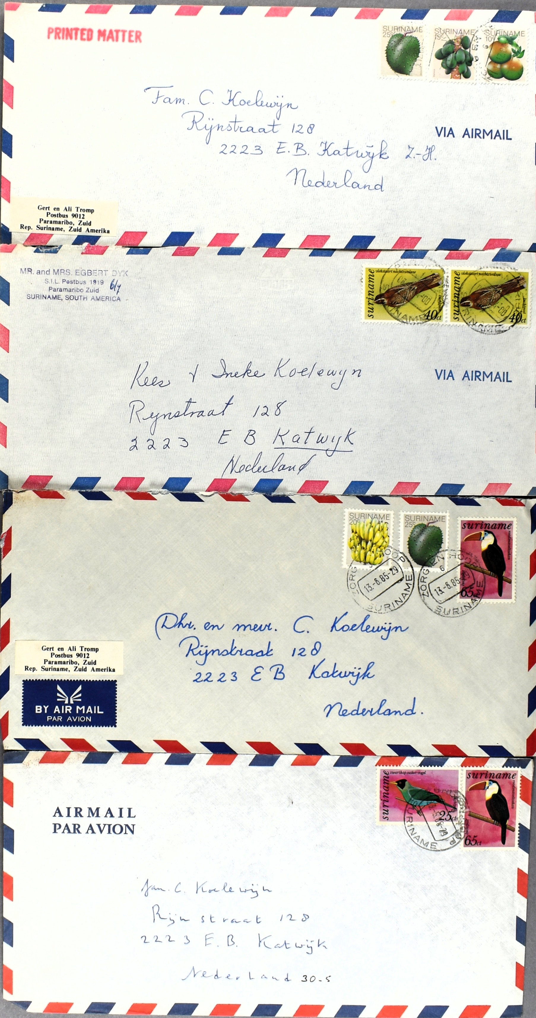 17 imageSURINAME POSTHISTORIE, partij poststukken w.o. (enkel)frankeringen, aardige variëteit aan poststempels, FDC's, luchtpost en speciale vluchten, aangetekend, censuur stempels en stroken, bestemmingen, diversen na 1975, etc. (Image) (Image2) (Image3) (Image4) (Image5) (Image6) (Image7) (All Images)