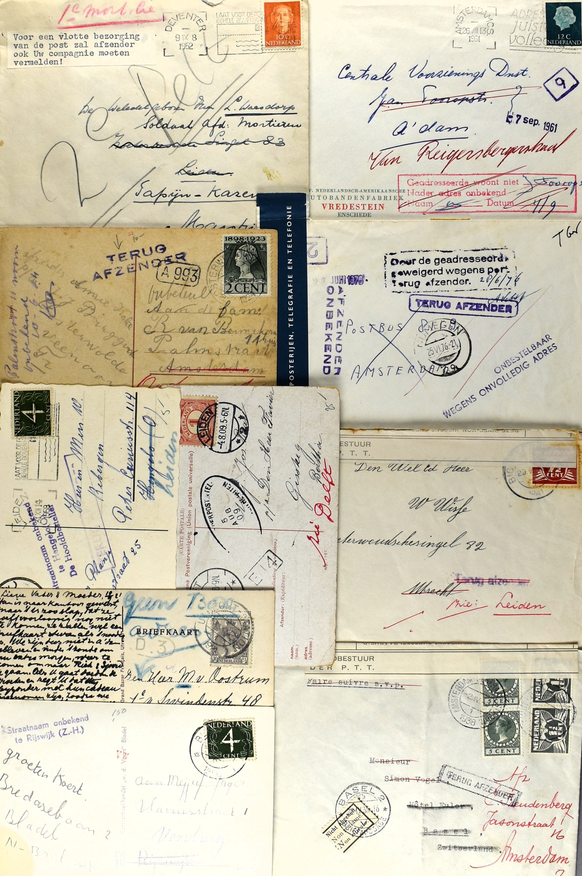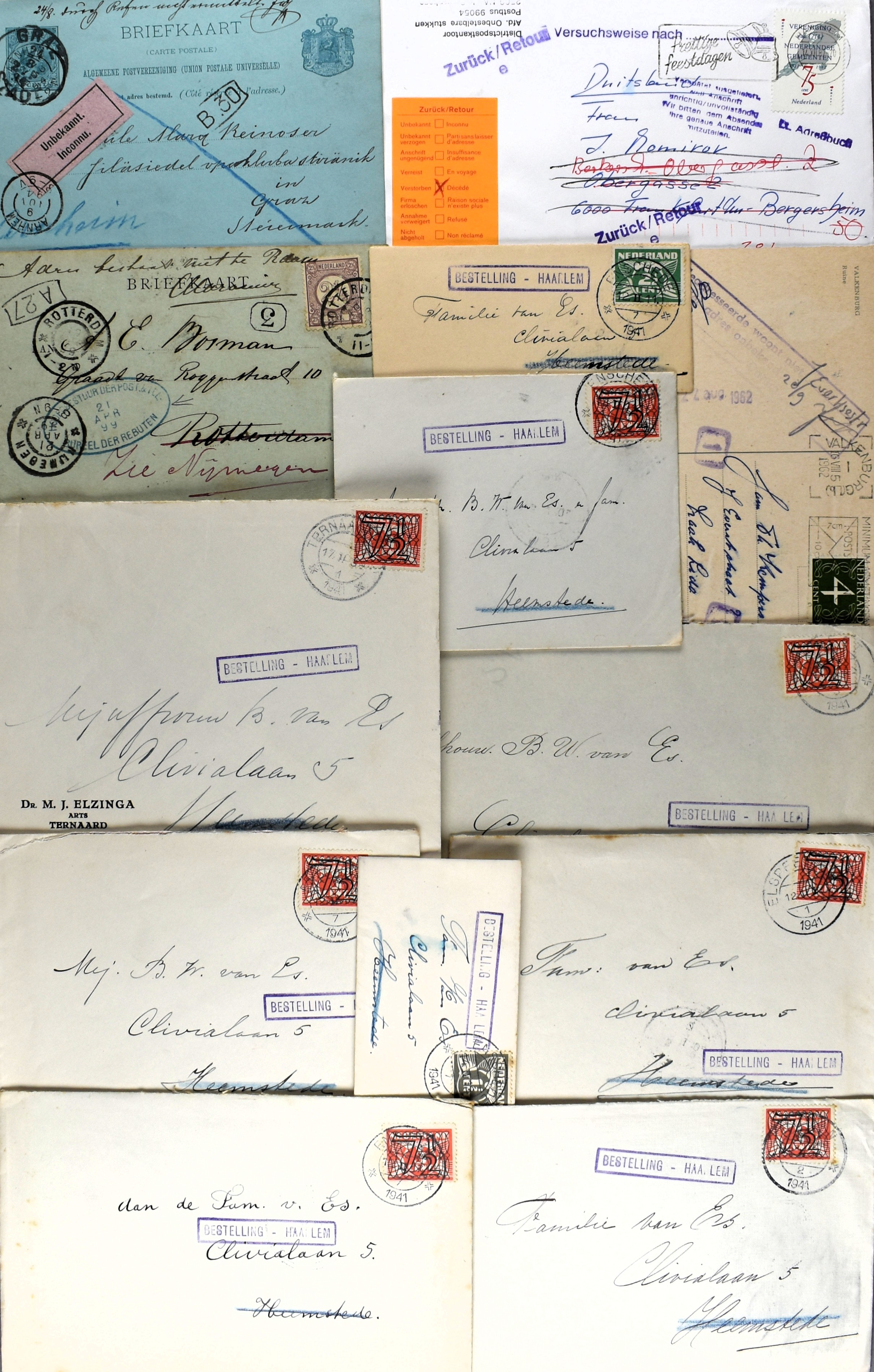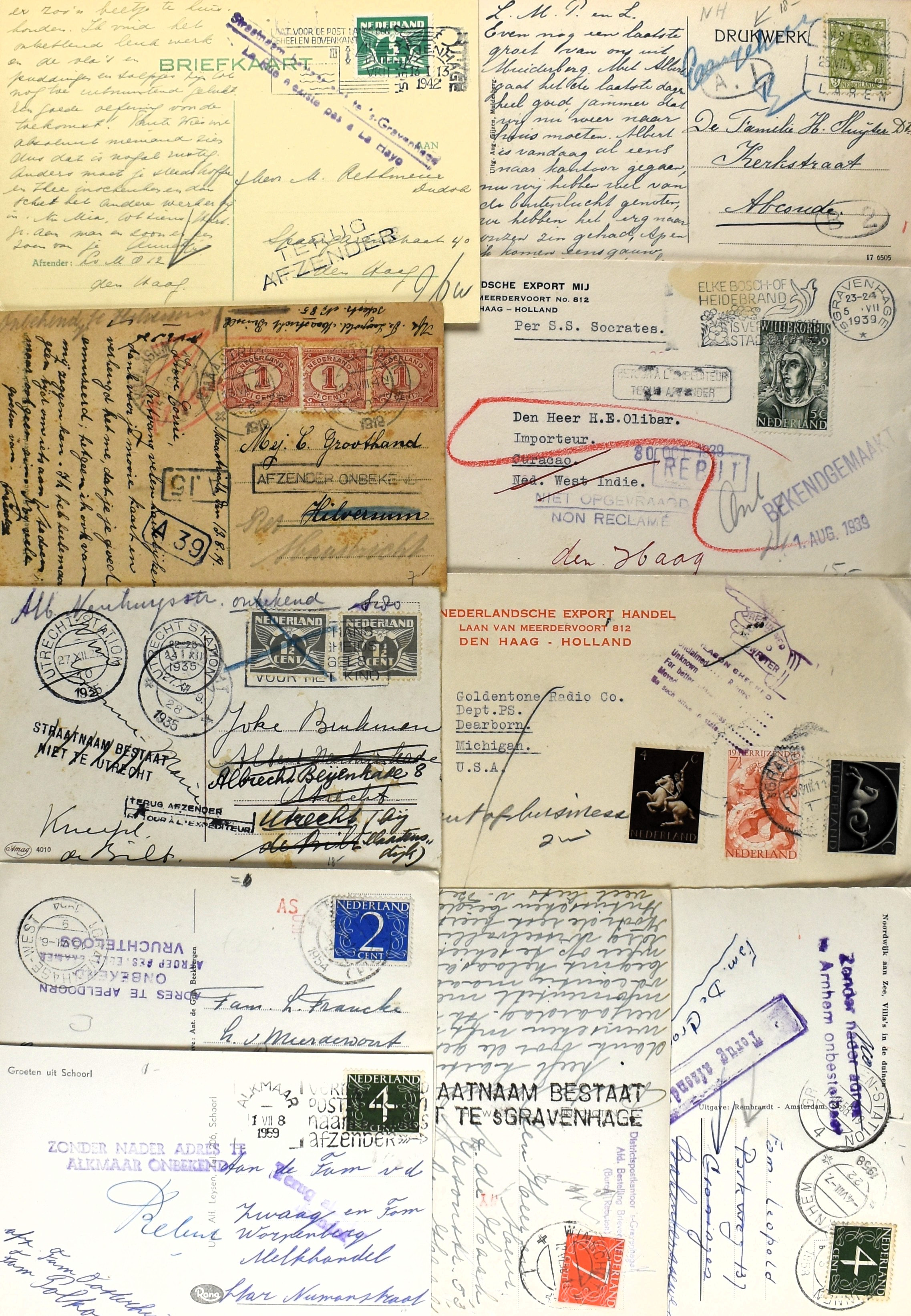 9 imageNEDERLAND POSTHISTORIE, 35 poststukken, merendeels jaren '30-'50, die onbestelbaar waren, waarop stempels (w.o. 'straatnaam onbekend' in diverse typen), retour, onbekend, blauwe PTT-sluitstrook, rebut, en w.o. uit een familiearchiefje 11 brieven uit 1941 naar Heemstede, met stempel 'Bestelling-Haarlem' (Image) (Image2) (Image3) (Image4) (All Images)