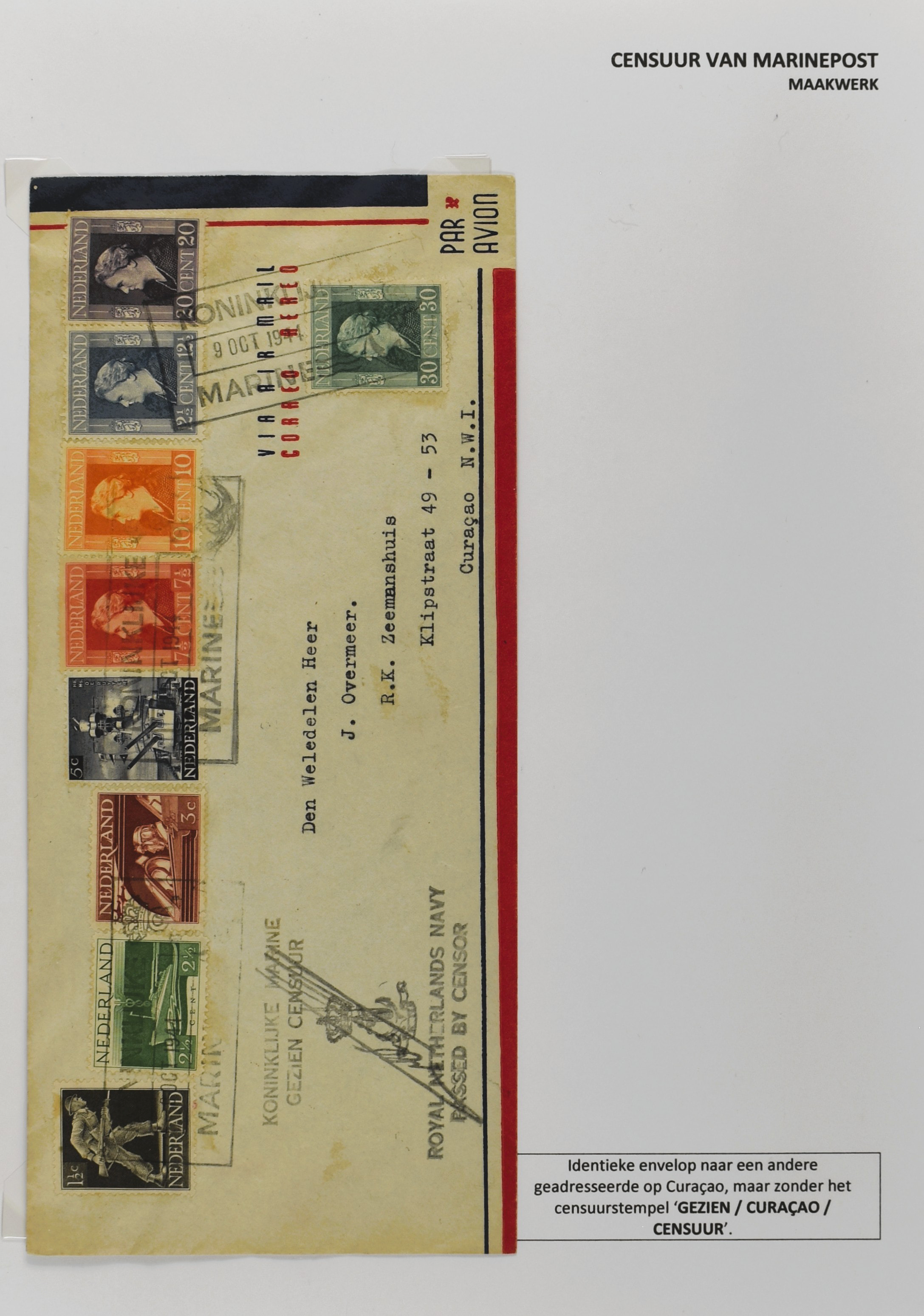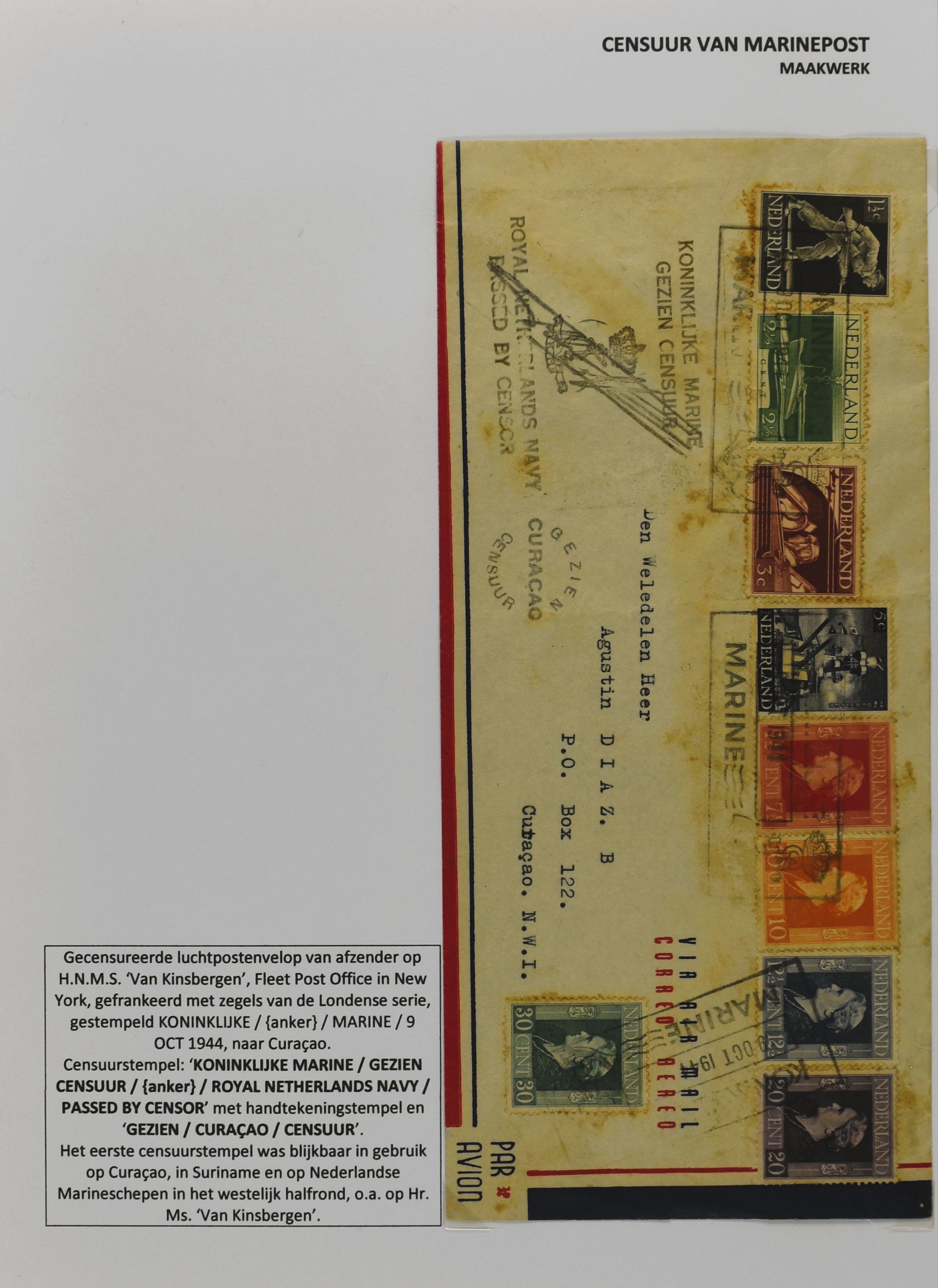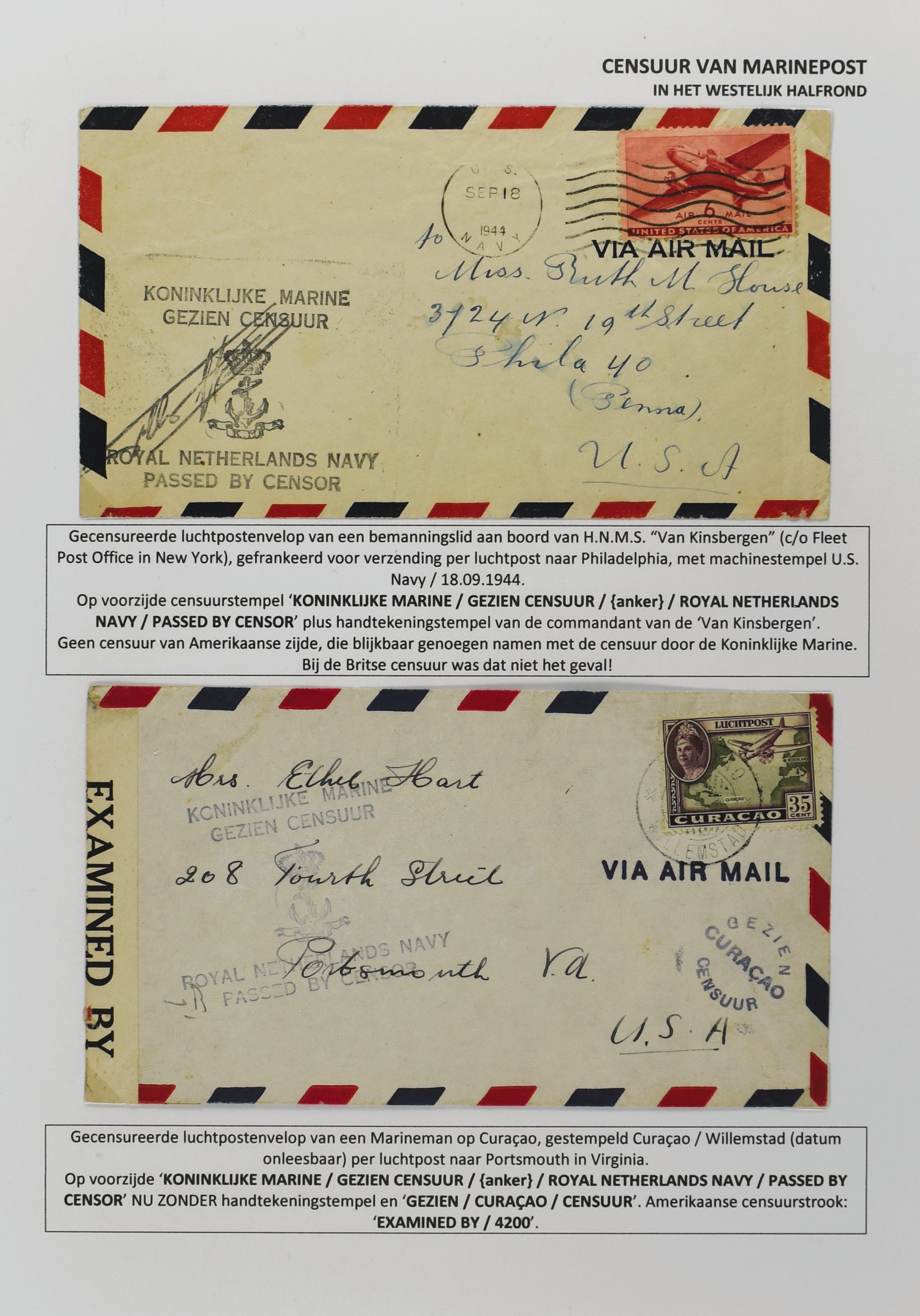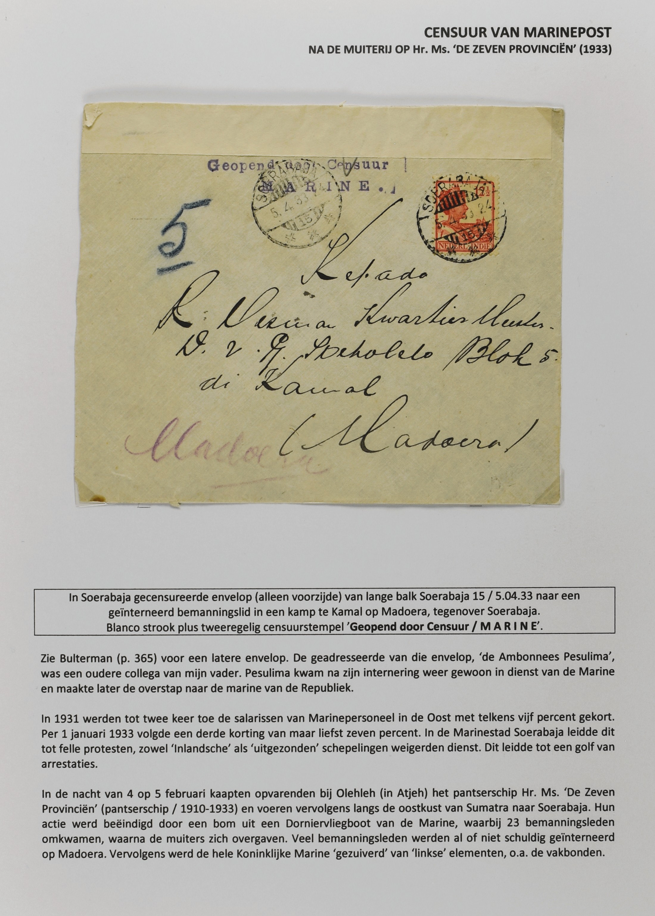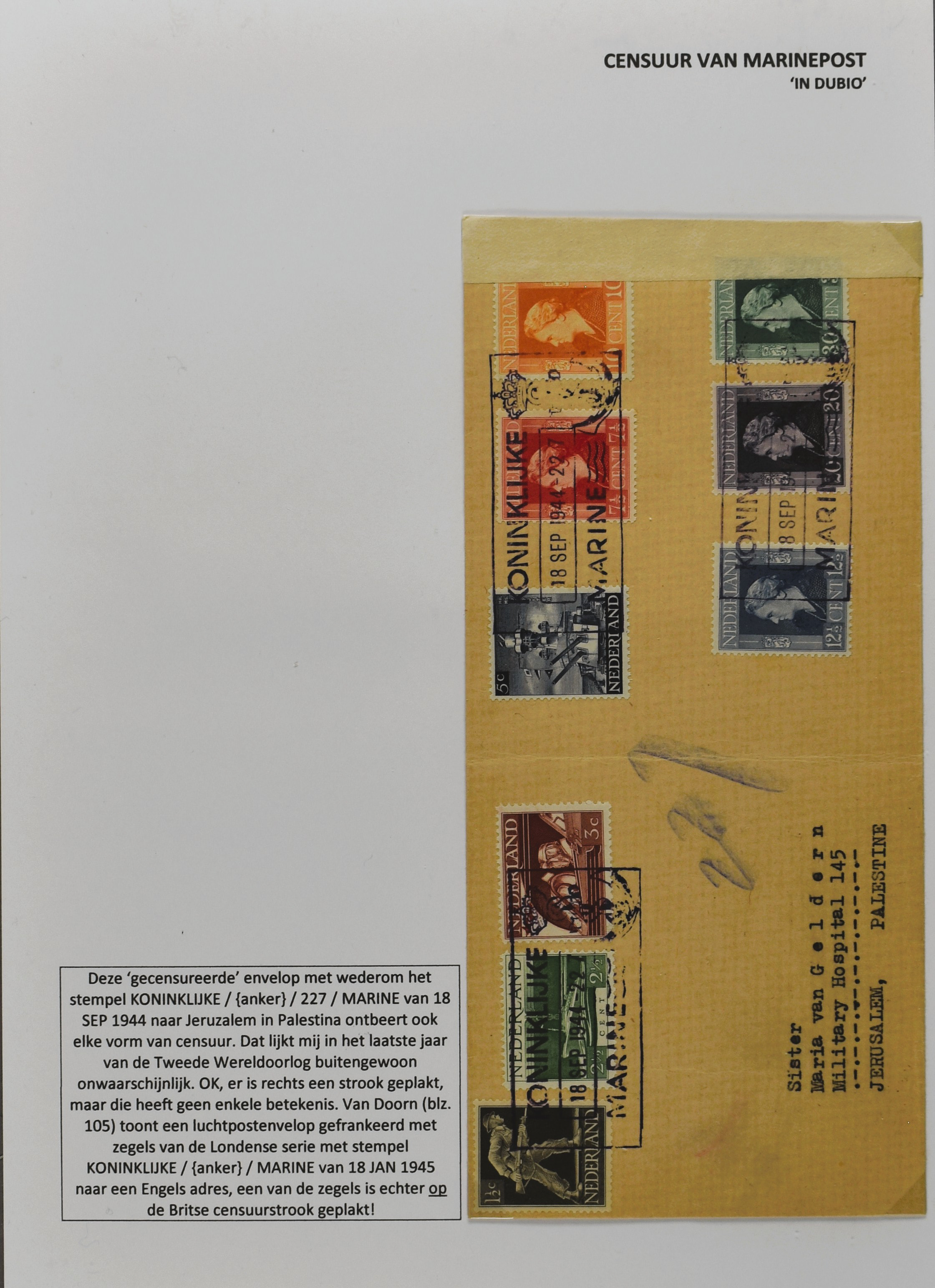 2247 imageCENSUUR VAN DE MARINEPOST, tentoonstellingscollectie bestaande uit 62 buitengewoon nauwgezet en gedocumenteerd beschreven poststukken met allerlei door de Kon. Marine waar ook ter wereld gebruikte censuren, te beginnen in Ned.-Indië met de Muiterij op de Zeven Provinciën (1933), verder censuren in Indië met verschillende stempels en stroken, Marinepost van o.a. Oost- en West-Indië in Groot-Brittannië, Brits-Indië, Australië, in Nederland zelf na de Tweede W.O., enz. Een uitzonderlijk informatieve collectie van posthistorische en geschiedkundige betekenis! De bladen bevinden zich in een platte doos (Image) (Image2) (Image3) (Image4) (Image5) (Image6) (Image7) (Image8) (Image9) (Image10) (Image11) (Image12) (Image13) (Image14) (Image15) (Image16) (Image17) (Image18) (Image19) (Image20) (Image21) (Image22) (Image23) (Image24) (Image25) (Image26) (Image27) (Image28) (Image29) (Image30) (Image31) (Image32) (Image33) (Image34) (Image35) (Image36) (Image37) (Image38) (Image39) (Image40) (Image41) (Image42) (Image43) (Image44) (Image45) (Image46) (Image47) (Image48) (All Images)