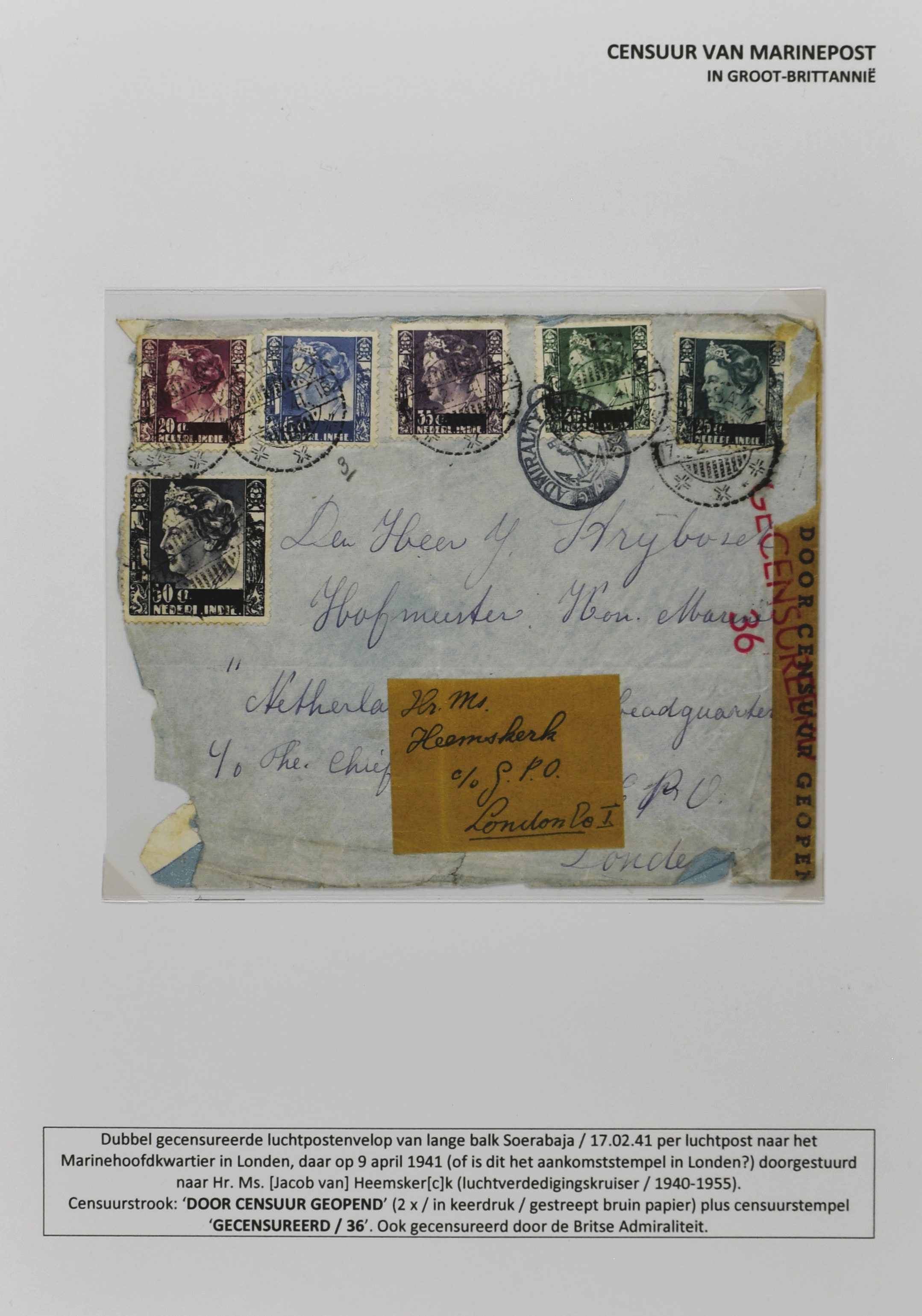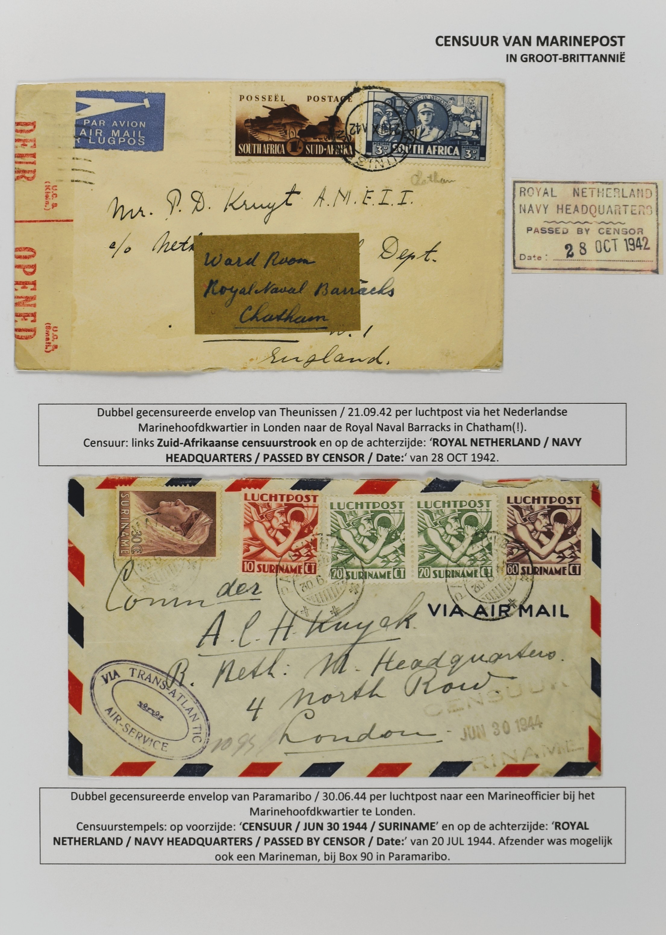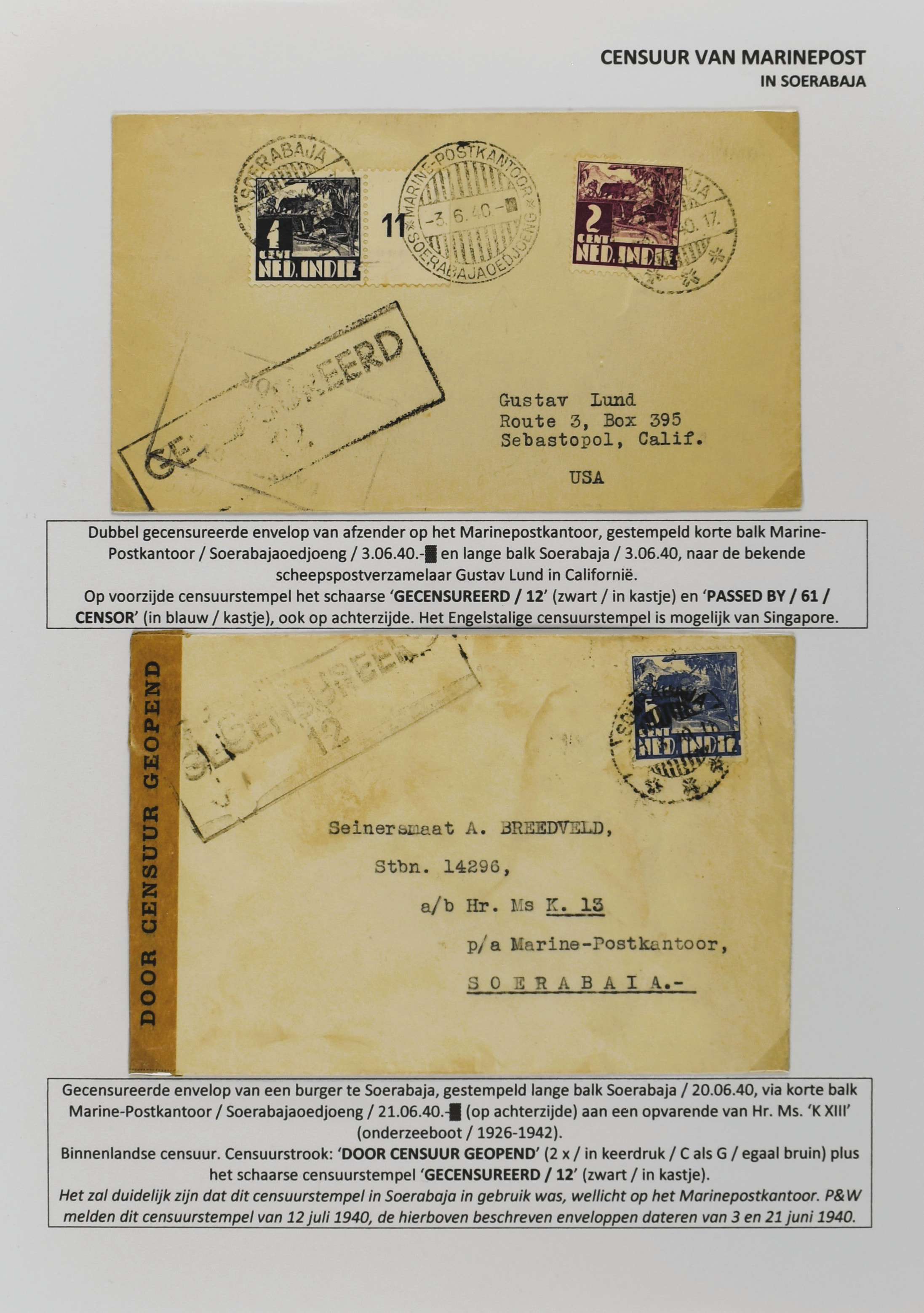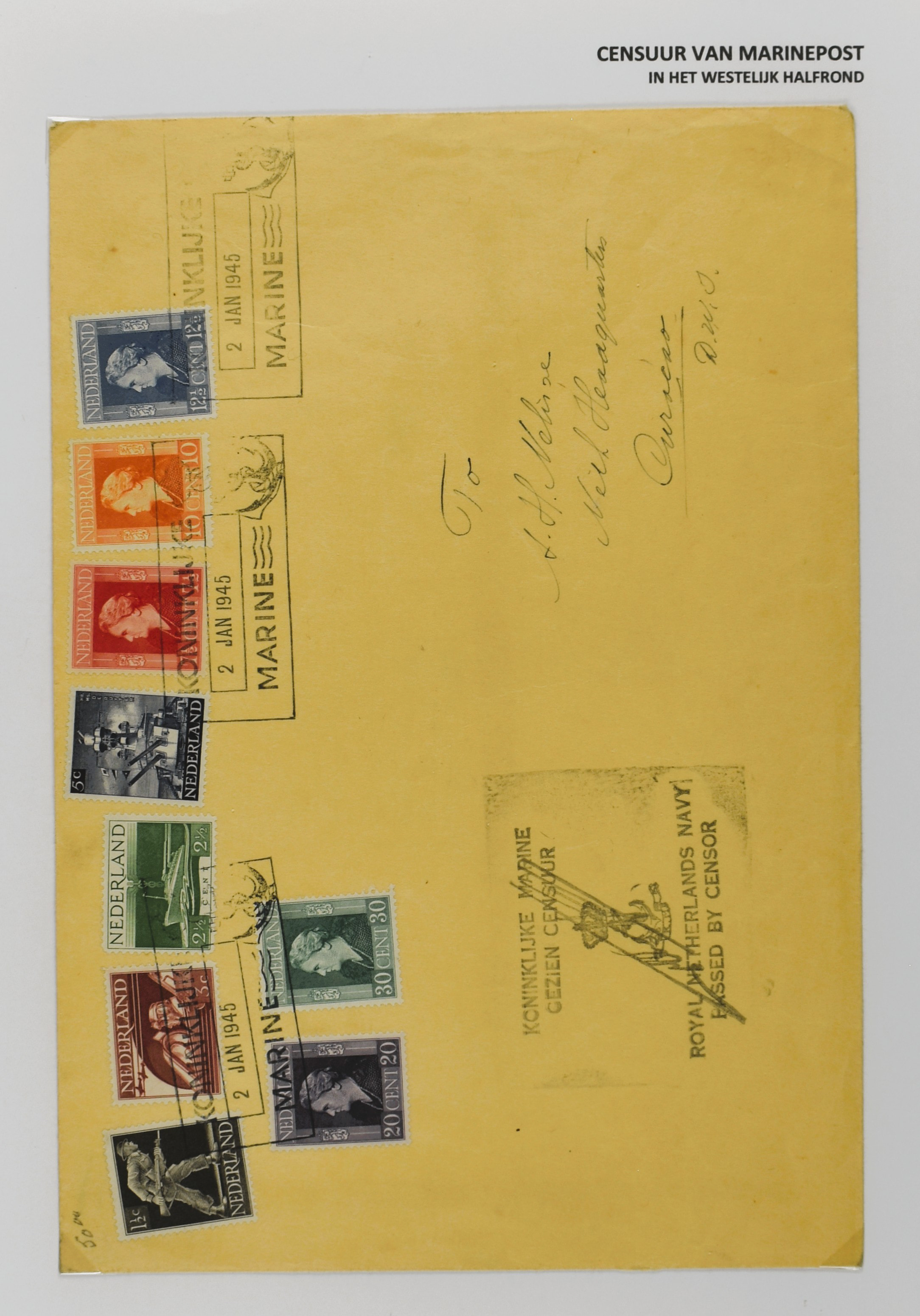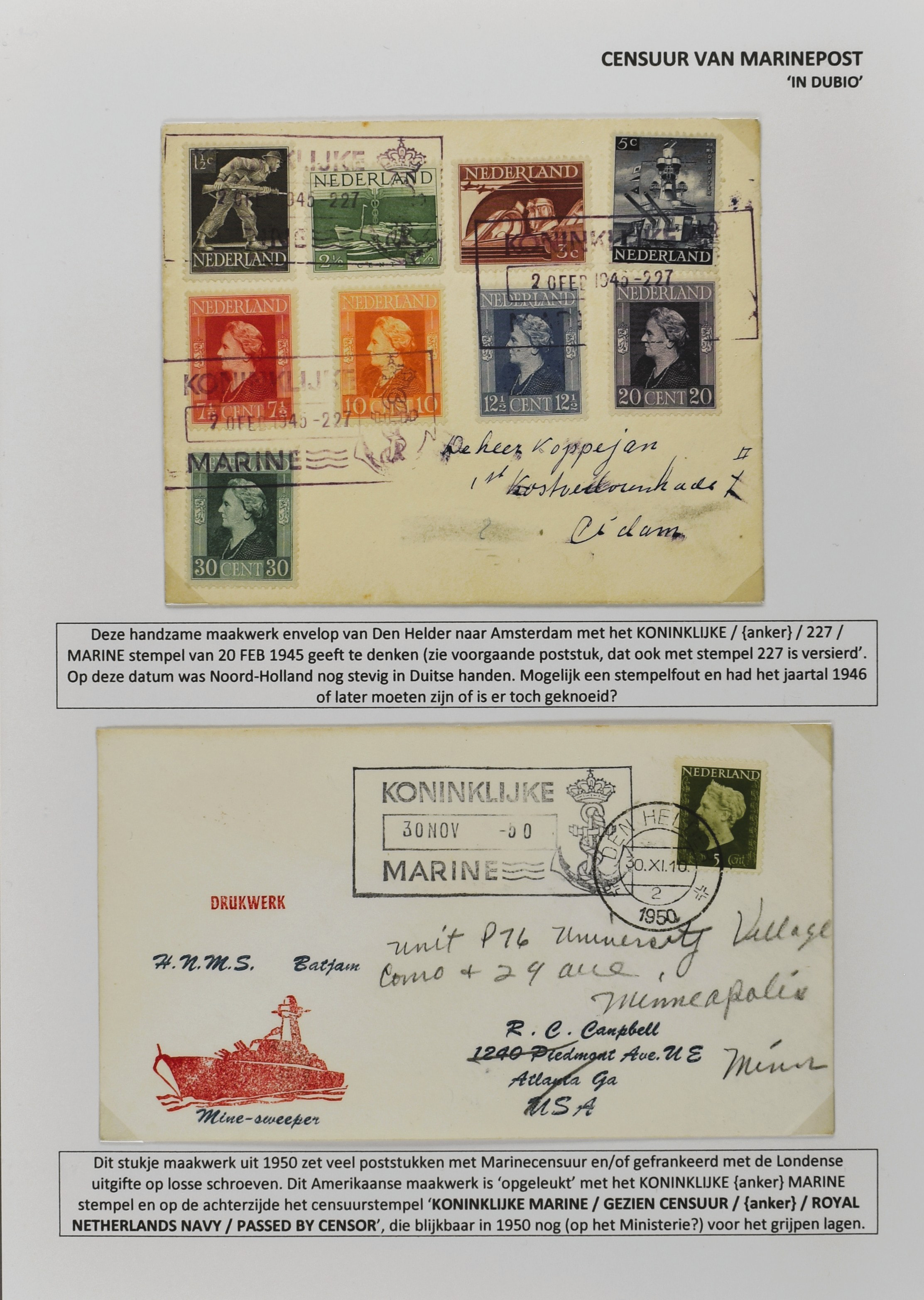 2247 imageCENSUUR VAN DE MARINEPOST, tentoonstellingscollectie bestaande uit 62 buitengewoon nauwgezet en gedocumenteerd beschreven poststukken met allerlei door de Kon. Marine waar ook ter wereld gebruikte censuren, te beginnen in Ned.-Indië met de Muiterij op de Zeven Provinciën (1933), verder censuren in Indië met verschillende stempels en stroken, Marinepost van o.a. Oost- en West-Indië in Groot-Brittannië, Brits-Indië, Australië, in Nederland zelf na de Tweede W.O., enz. Een uitzonderlijk informatieve collectie van posthistorische en geschiedkundige betekenis! De bladen bevinden zich in een platte doos (Image) (Image2) (Image3) (Image4) (Image5) (Image6) (Image7) (Image8) (Image9) (Image10) (Image11) (Image12) (Image13) (Image14) (Image15) (Image16) (Image17) (Image18) (Image19) (Image20) (Image21) (Image22) (Image23) (Image24) (Image25) (Image26) (Image27) (Image28) (Image29) (Image30) (Image31) (Image32) (Image33) (Image34) (Image35) (Image36) (Image37) (Image38) (Image39) (Image40) (Image41) (Image42) (Image43) (Image44) (Image45) (Image46) (Image47) (Image48) (All Images)