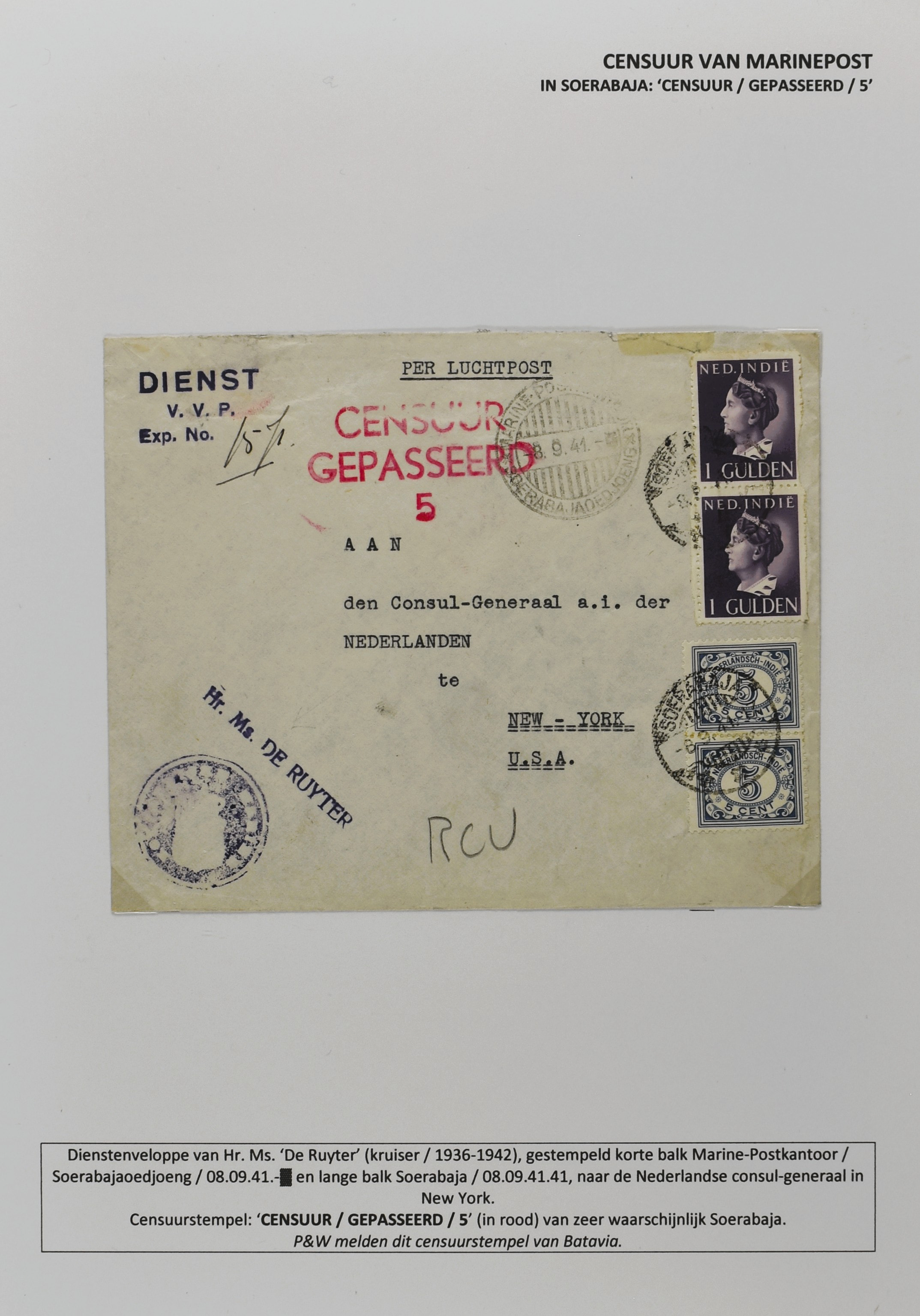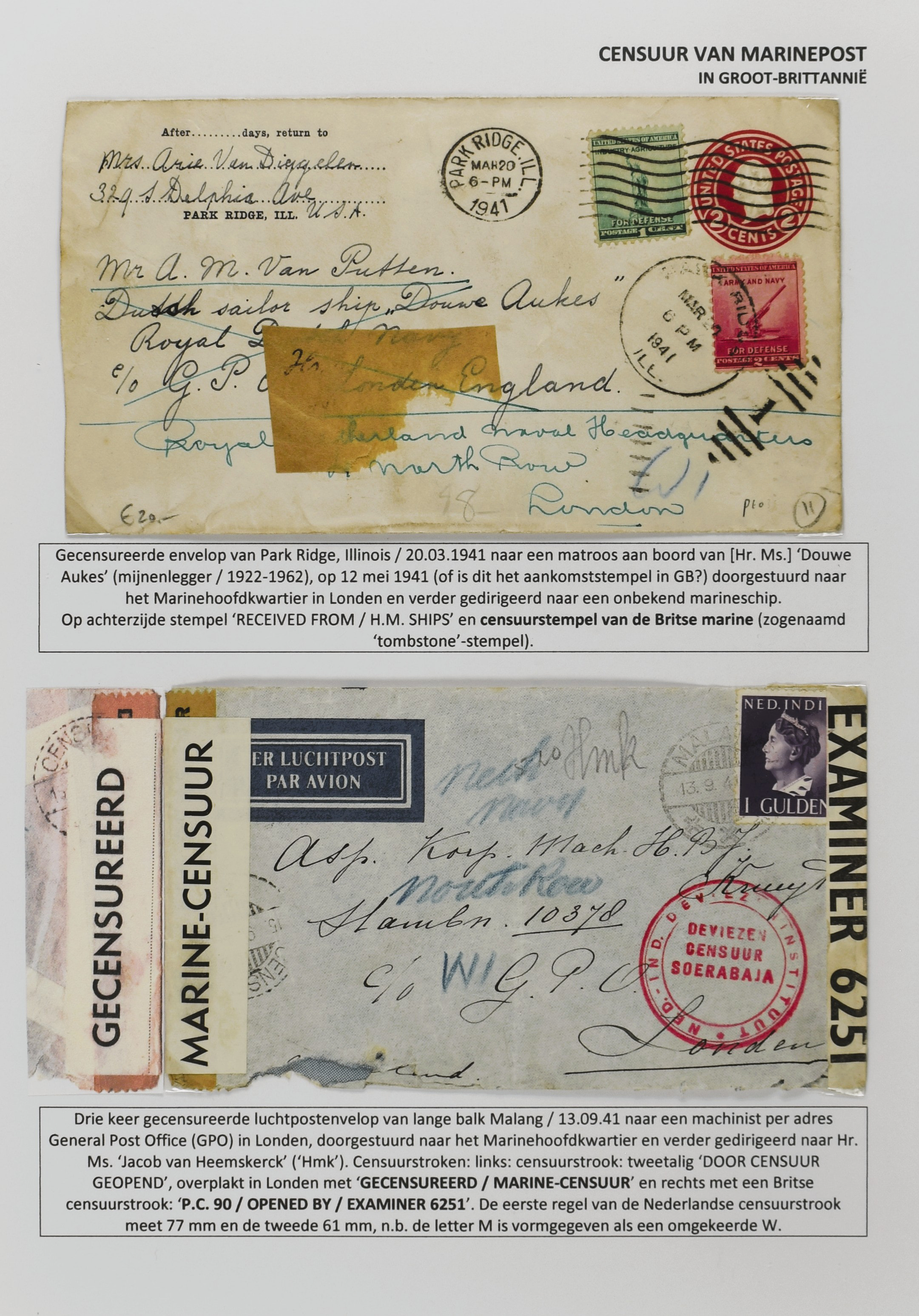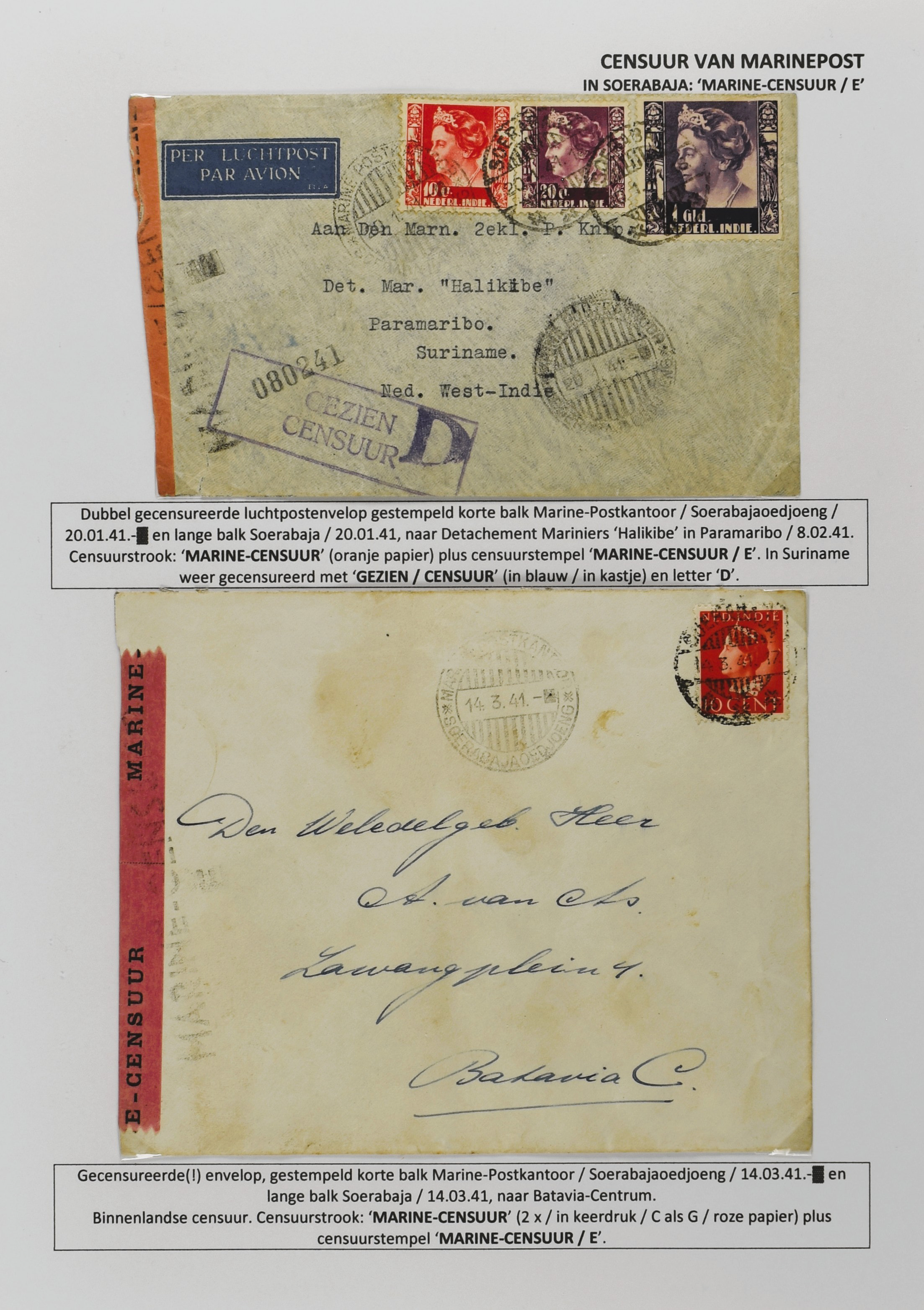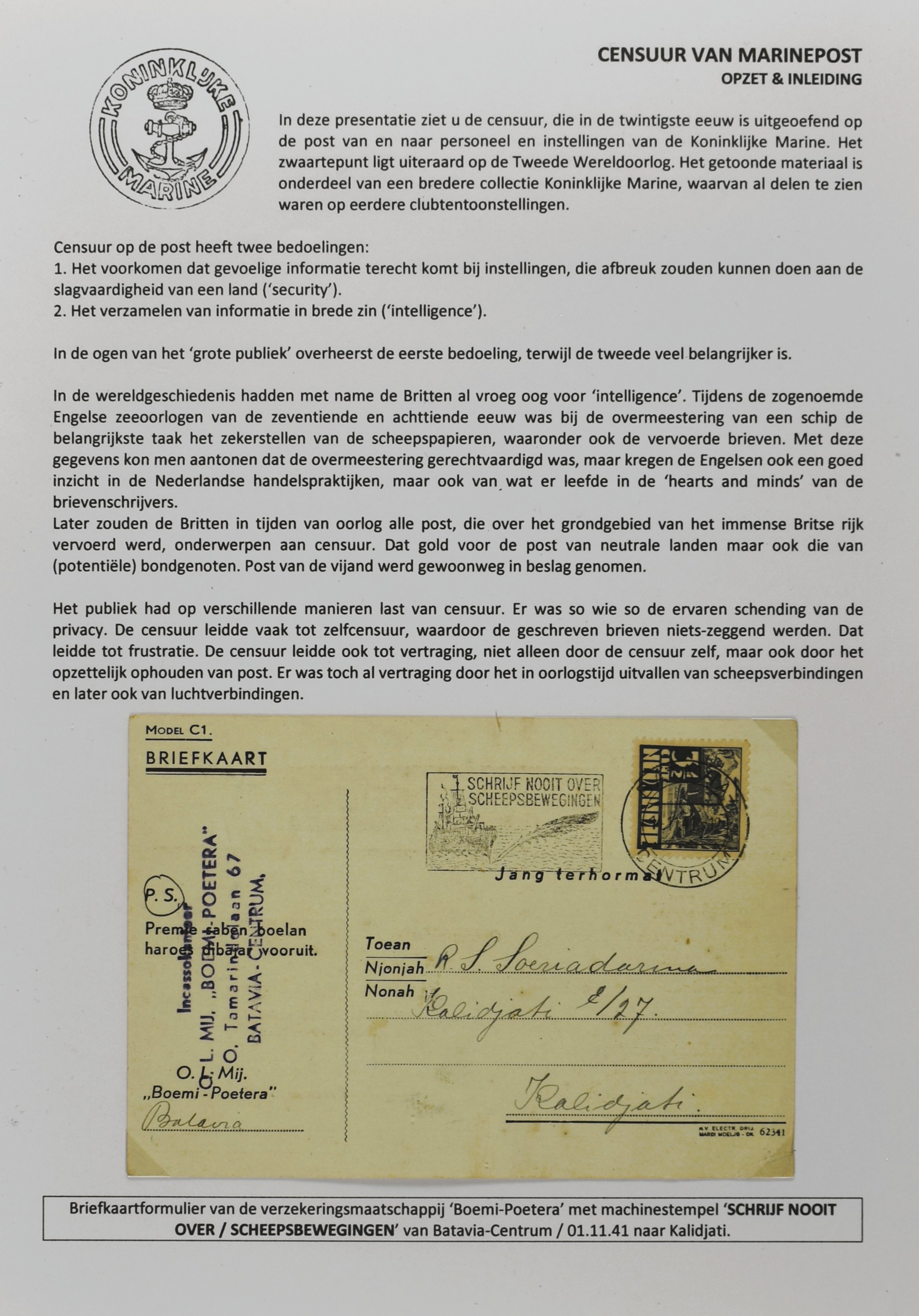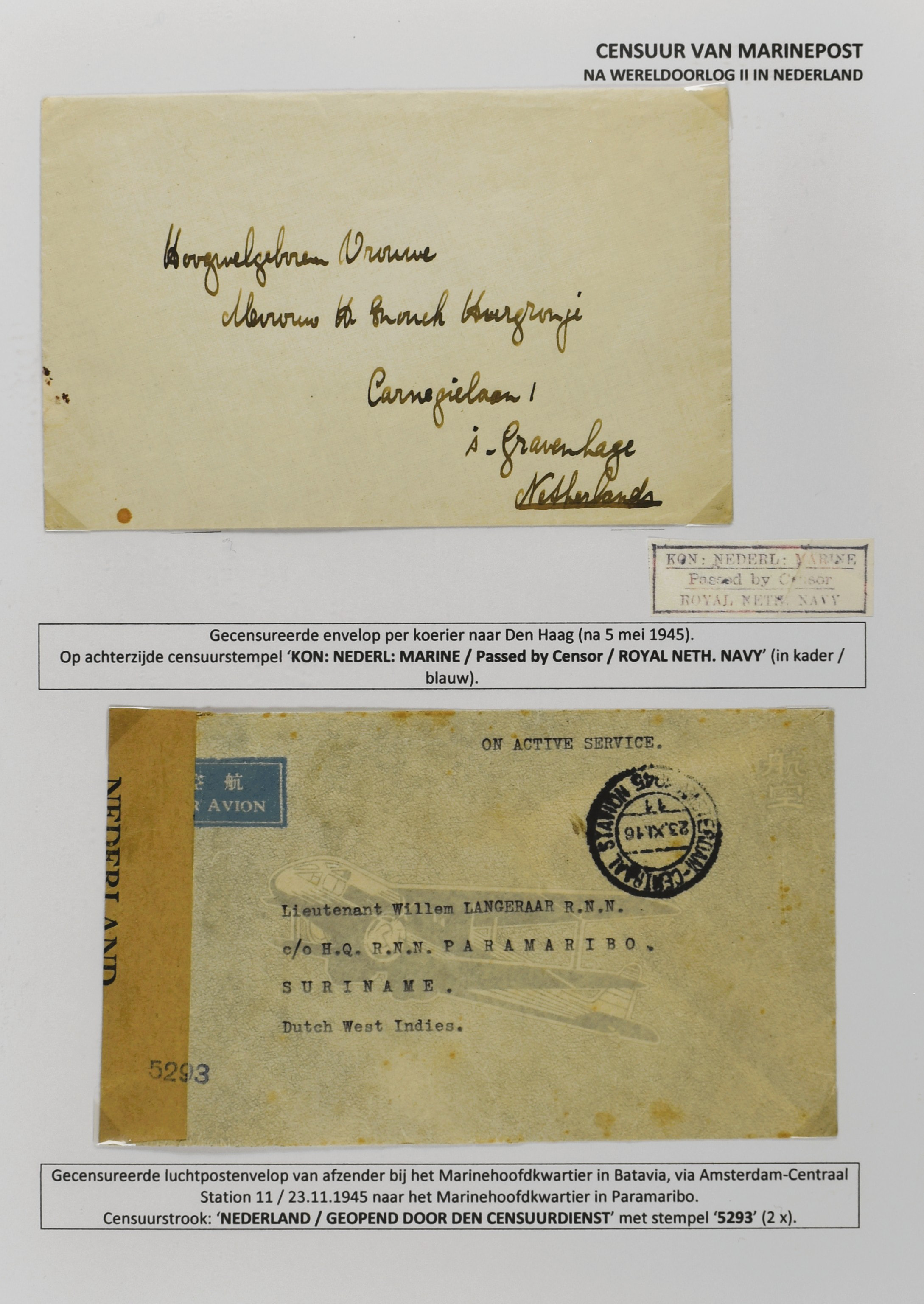 2247 imageCENSUUR VAN DE MARINEPOST, tentoonstellingscollectie bestaande uit 62 buitengewoon nauwgezet en gedocumenteerd beschreven poststukken met allerlei door de Kon. Marine waar ook ter wereld gebruikte censuren, te beginnen in Ned.-Indië met de Muiterij op de Zeven Provinciën (1933), verder censuren in Indië met verschillende stempels en stroken, Marinepost van o.a. Oost- en West-Indië in Groot-Brittannië, Brits-Indië, Australië, in Nederland zelf na de Tweede W.O., enz. Een uitzonderlijk informatieve collectie van posthistorische en geschiedkundige betekenis! De bladen bevinden zich in een platte doos (Image) (Image2) (Image3) (Image4) (Image5) (Image6) (Image7) (Image8) (Image9) (Image10) (Image11) (Image12) (Image13) (Image14) (Image15) (Image16) (Image17) (Image18) (Image19) (Image20) (Image21) (Image22) (Image23) (Image24) (Image25) (Image26) (Image27) (Image28) (Image29) (Image30) (Image31) (Image32) (Image33) (Image34) (Image35) (Image36) (Image37) (Image38) (Image39) (Image40) (Image41) (Image42) (Image43) (Image44) (Image45) (Image46) (Image47) (Image48) (All Images)