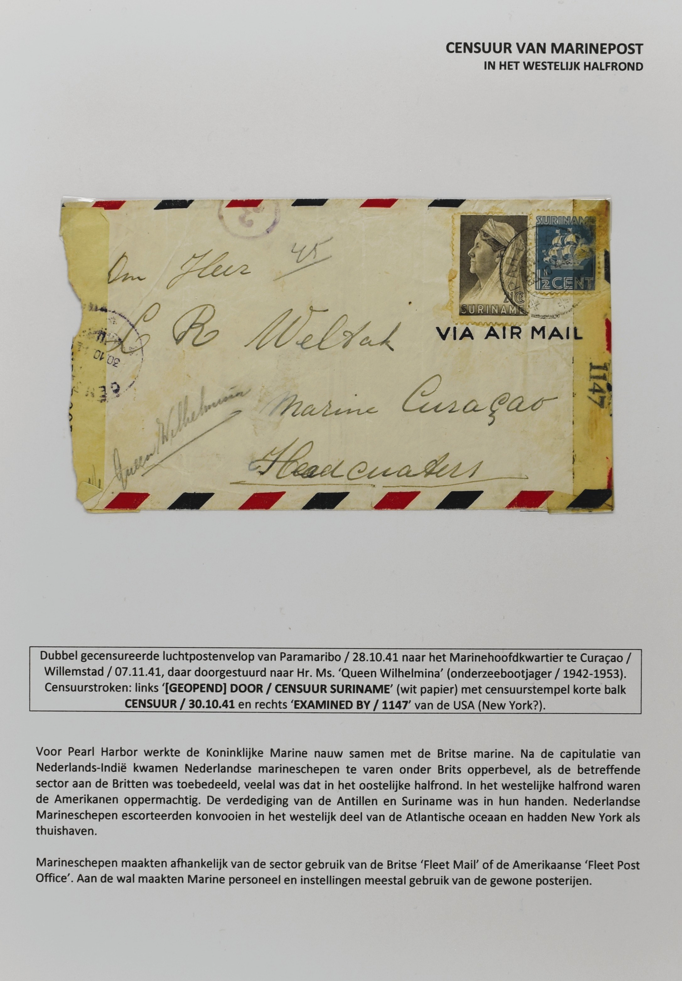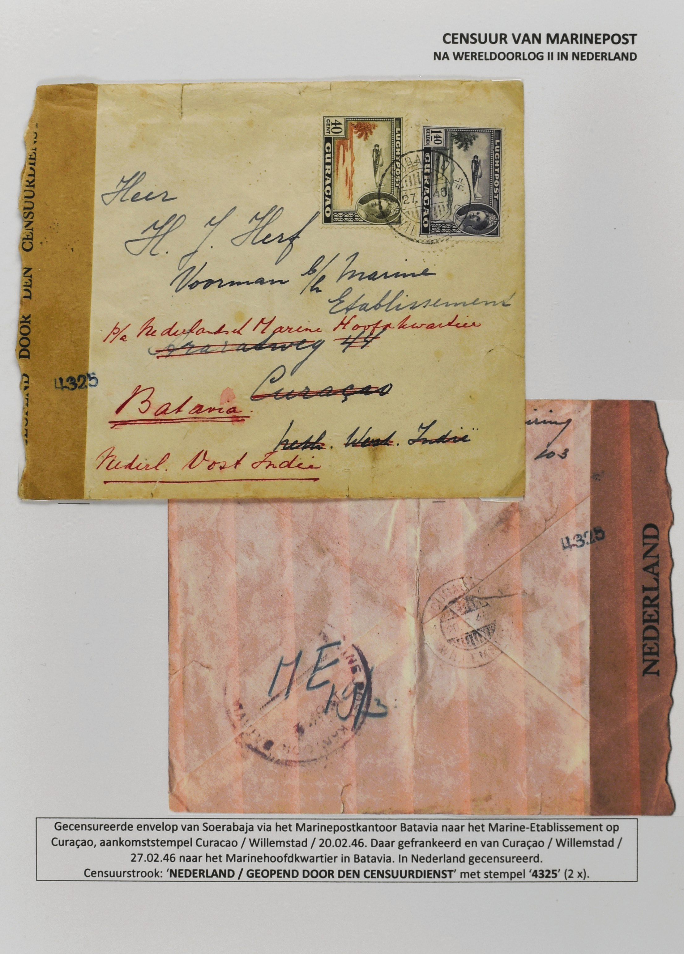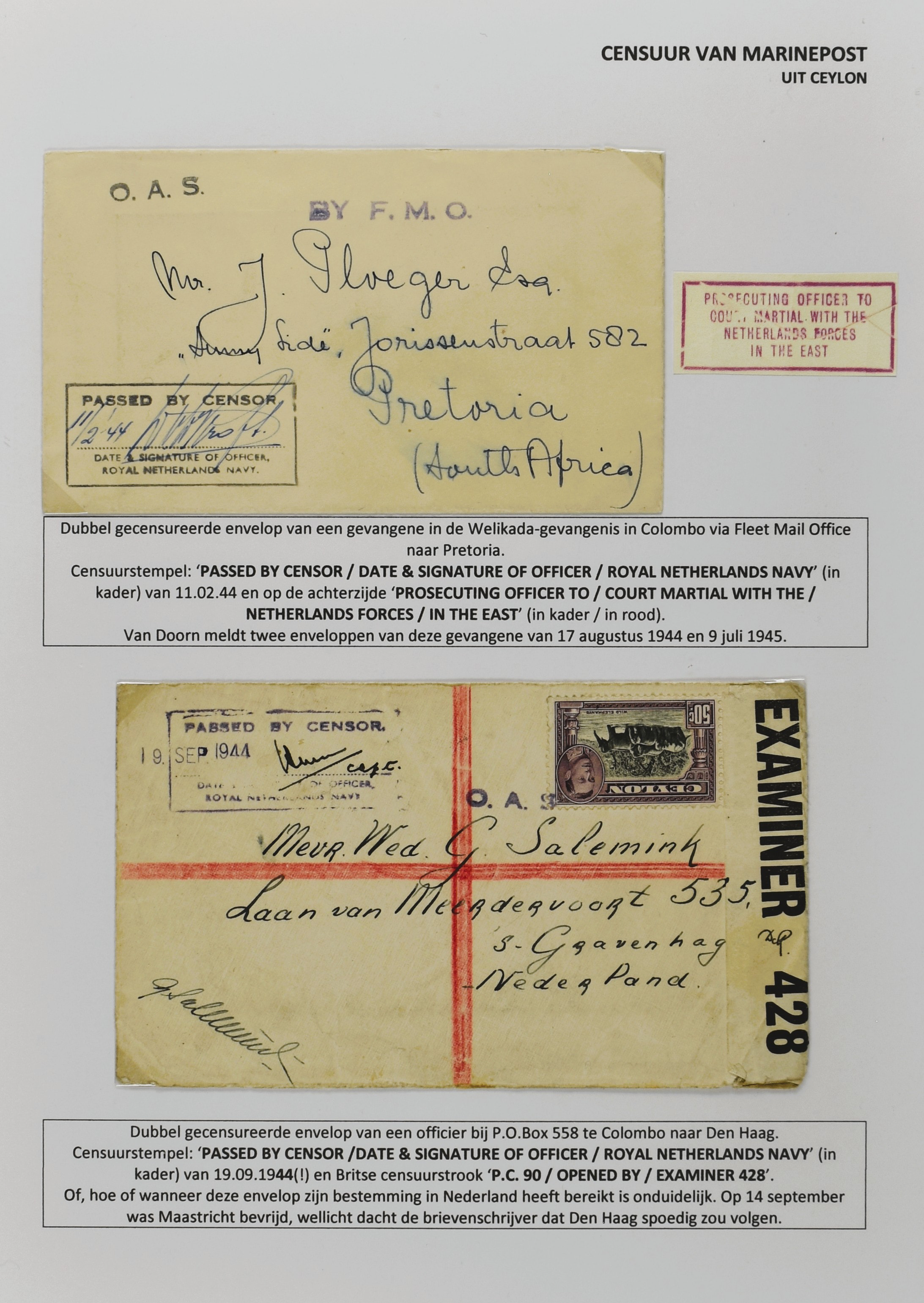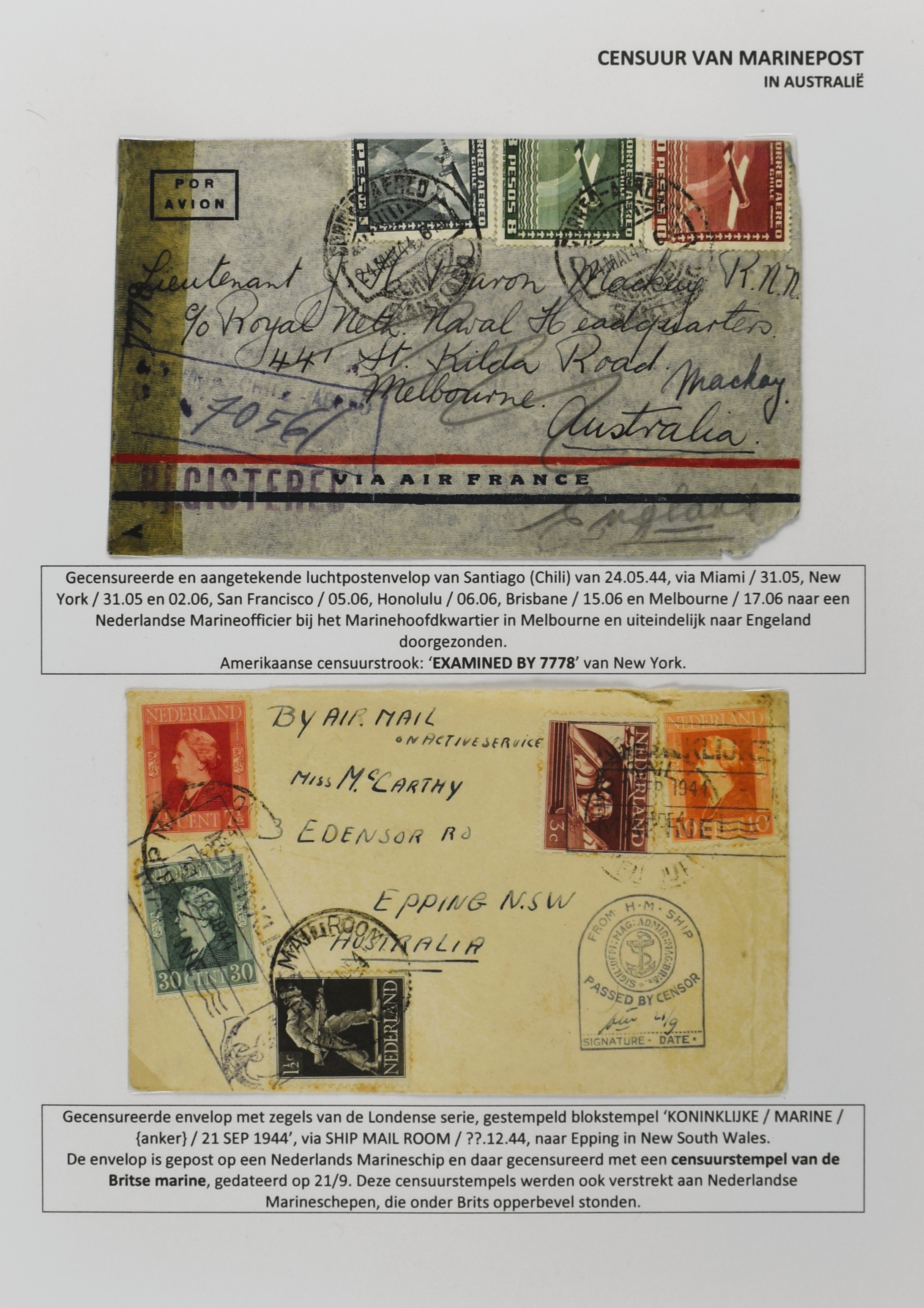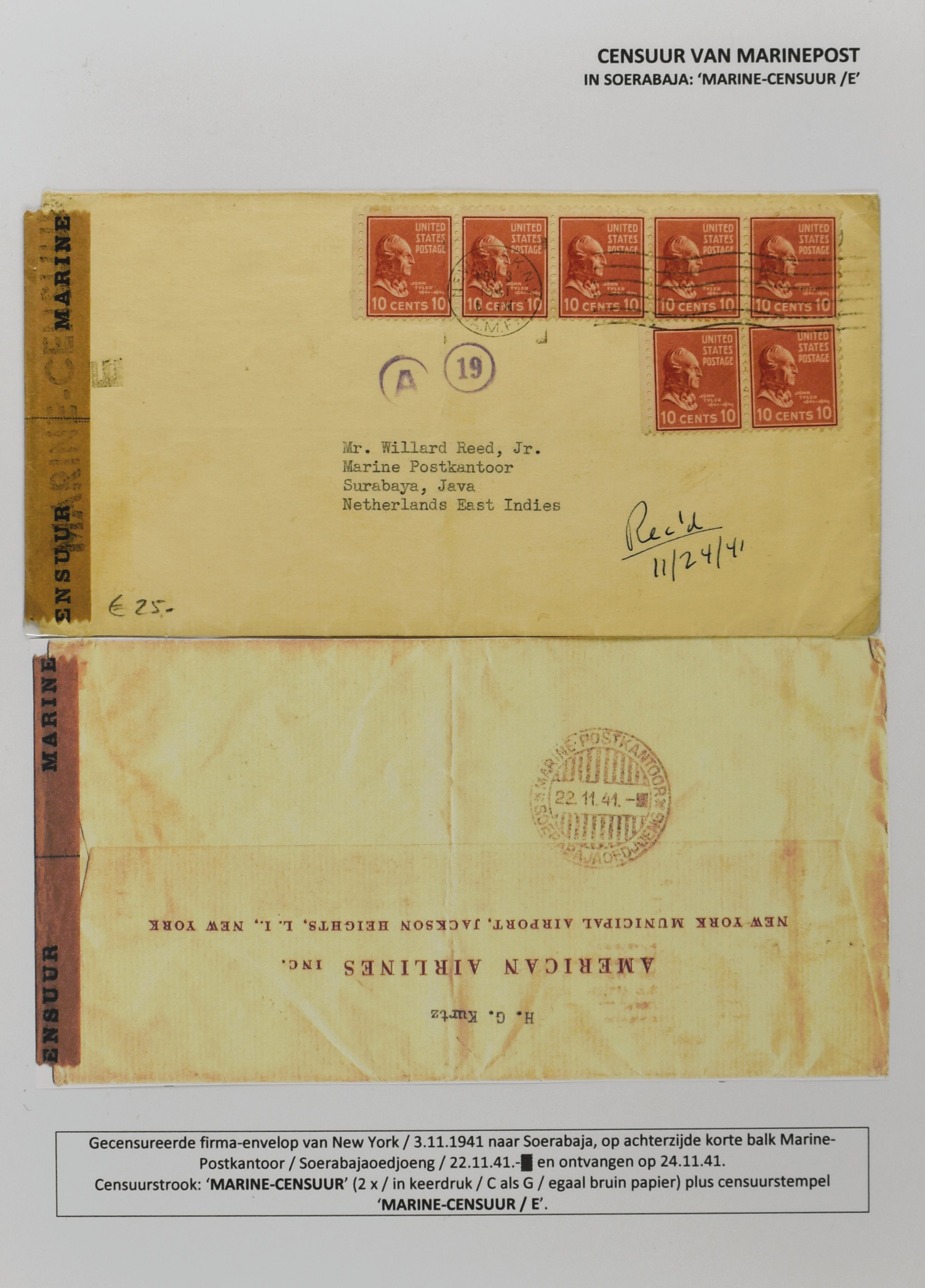2247 imageCENSUUR VAN DE MARINEPOST, tentoonstellingscollectie bestaande uit 62 buitengewoon nauwgezet en gedocumenteerd beschreven poststukken met allerlei door de Kon. Marine waar ook ter wereld gebruikte censuren, te beginnen in Ned.-Indië met de Muiterij op de Zeven Provinciën (1933), verder censuren in Indië met verschillende stempels en stroken, Marinepost van o.a. Oost- en West-Indië in Groot-Brittannië, Brits-Indië, Australië, in Nederland zelf na de Tweede W.O., enz. Een uitzonderlijk informatieve collectie van posthistorische en geschiedkundige betekenis! De bladen bevinden zich in een platte doos (Image) (Image2) (Image3) (Image4) (Image5) (Image6) (Image7) (Image8) (Image9) (Image10) (Image11) (Image12) (Image13) (Image14) (Image15) (Image16) (Image17) (Image18) (Image19) (Image20) (Image21) (Image22) (Image23) (Image24) (Image25) (Image26) (Image27) (Image28) (Image29) (Image30) (Image31) (Image32) (Image33) (Image34) (Image35) (Image36) (Image37) (Image38) (Image39) (Image40) (Image41) (Image42) (Image43) (Image44) (Image45) (Image46) (Image47) (Image48) (All Images)