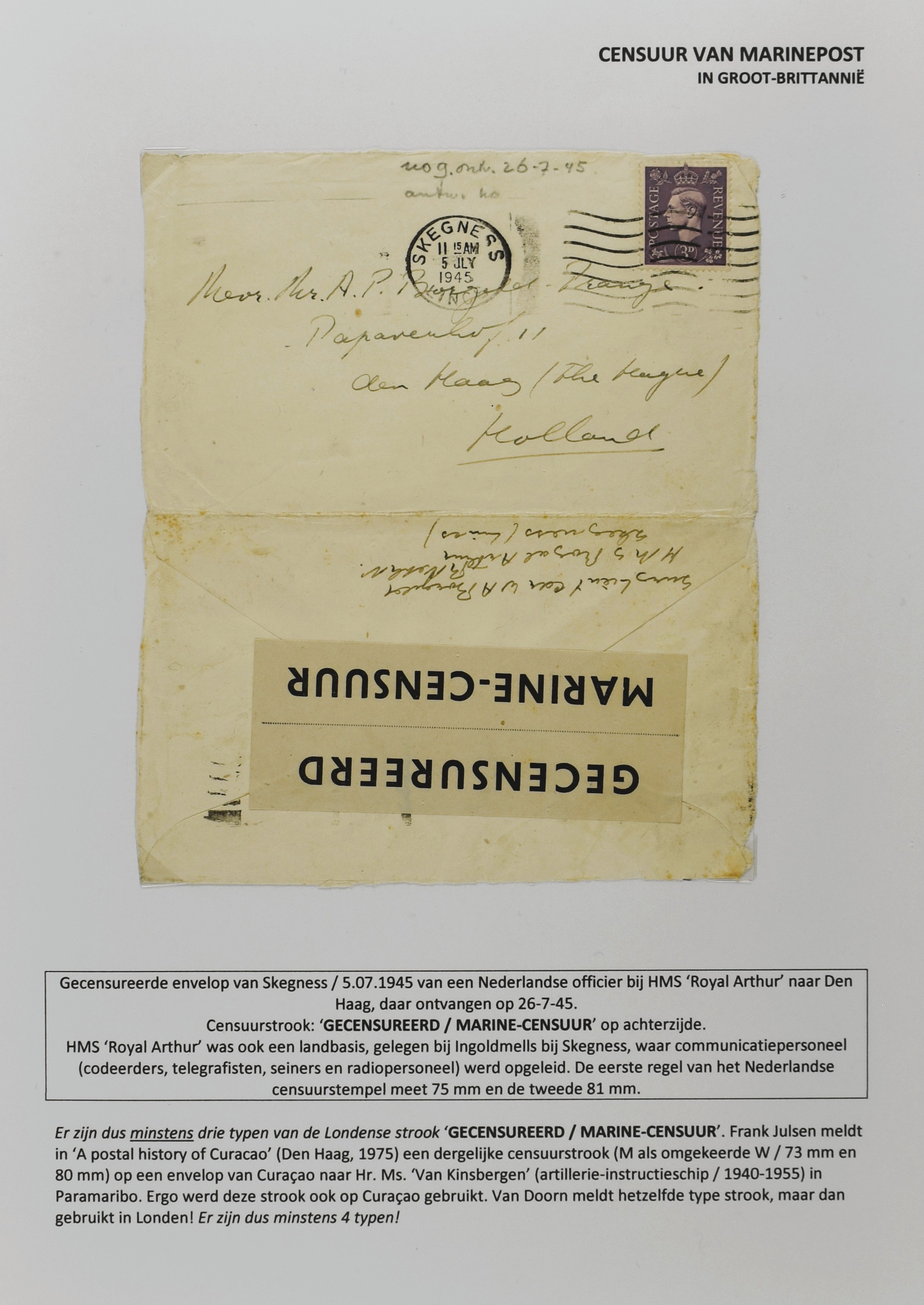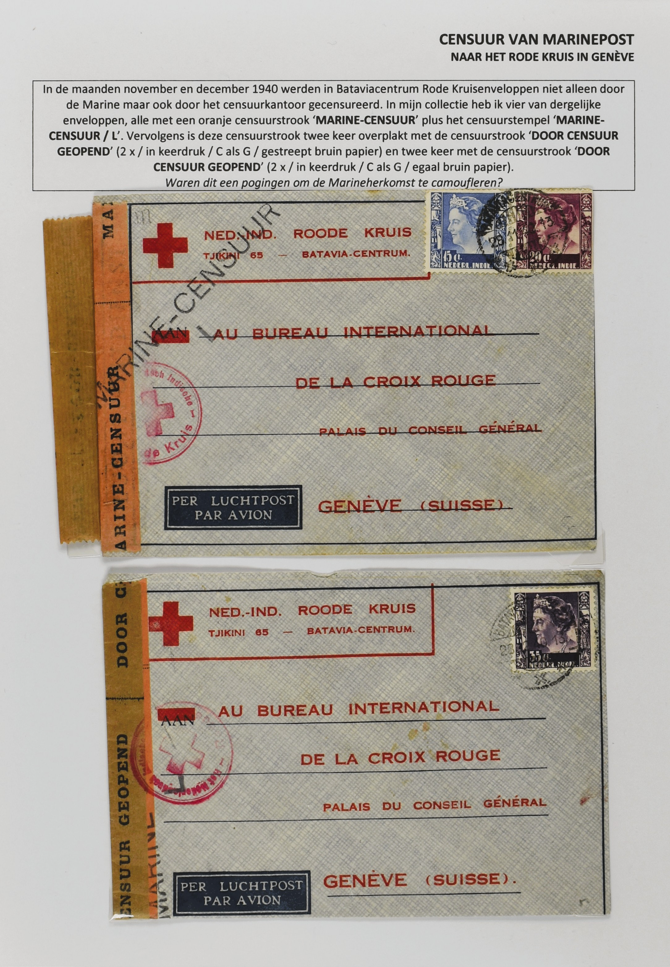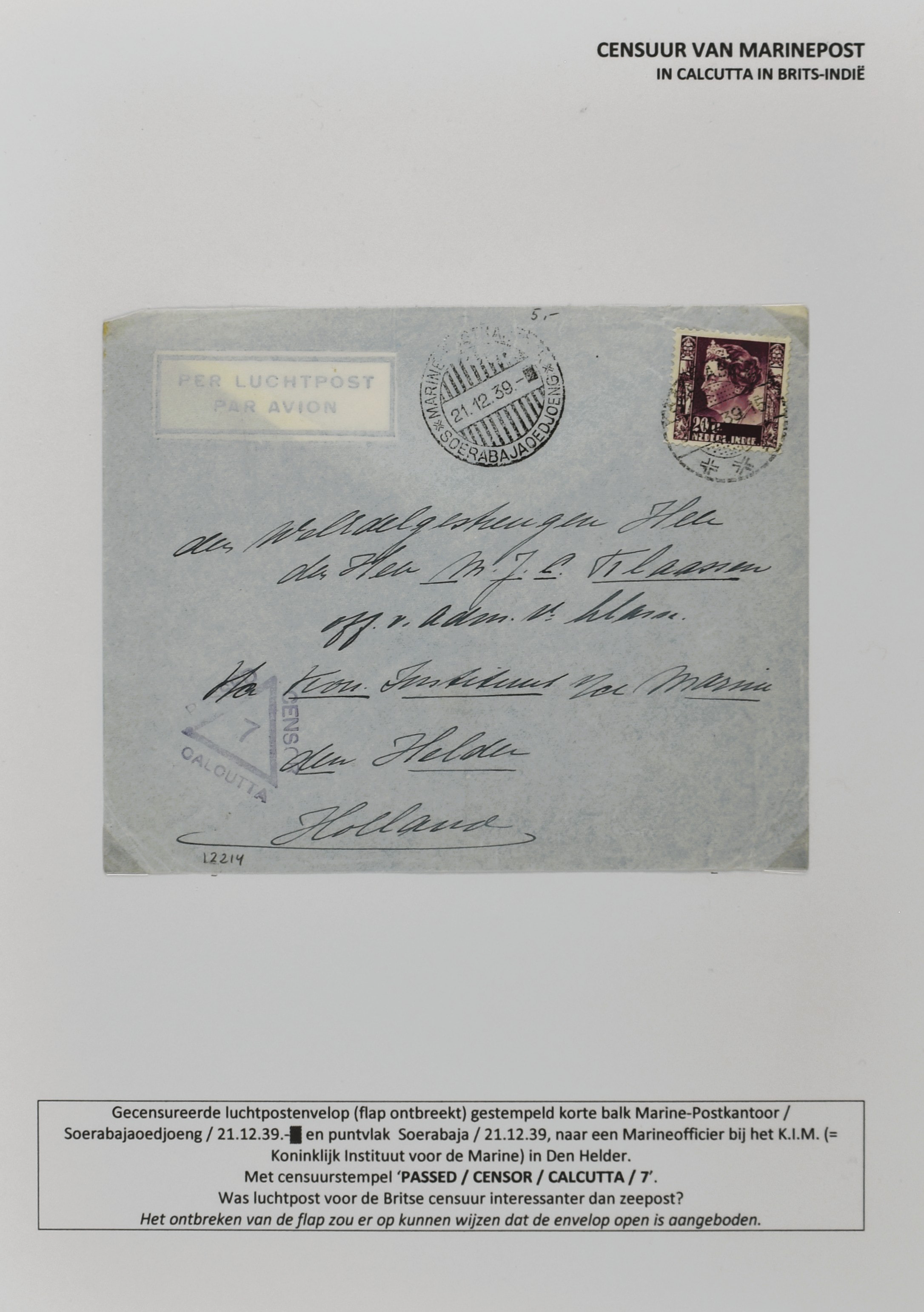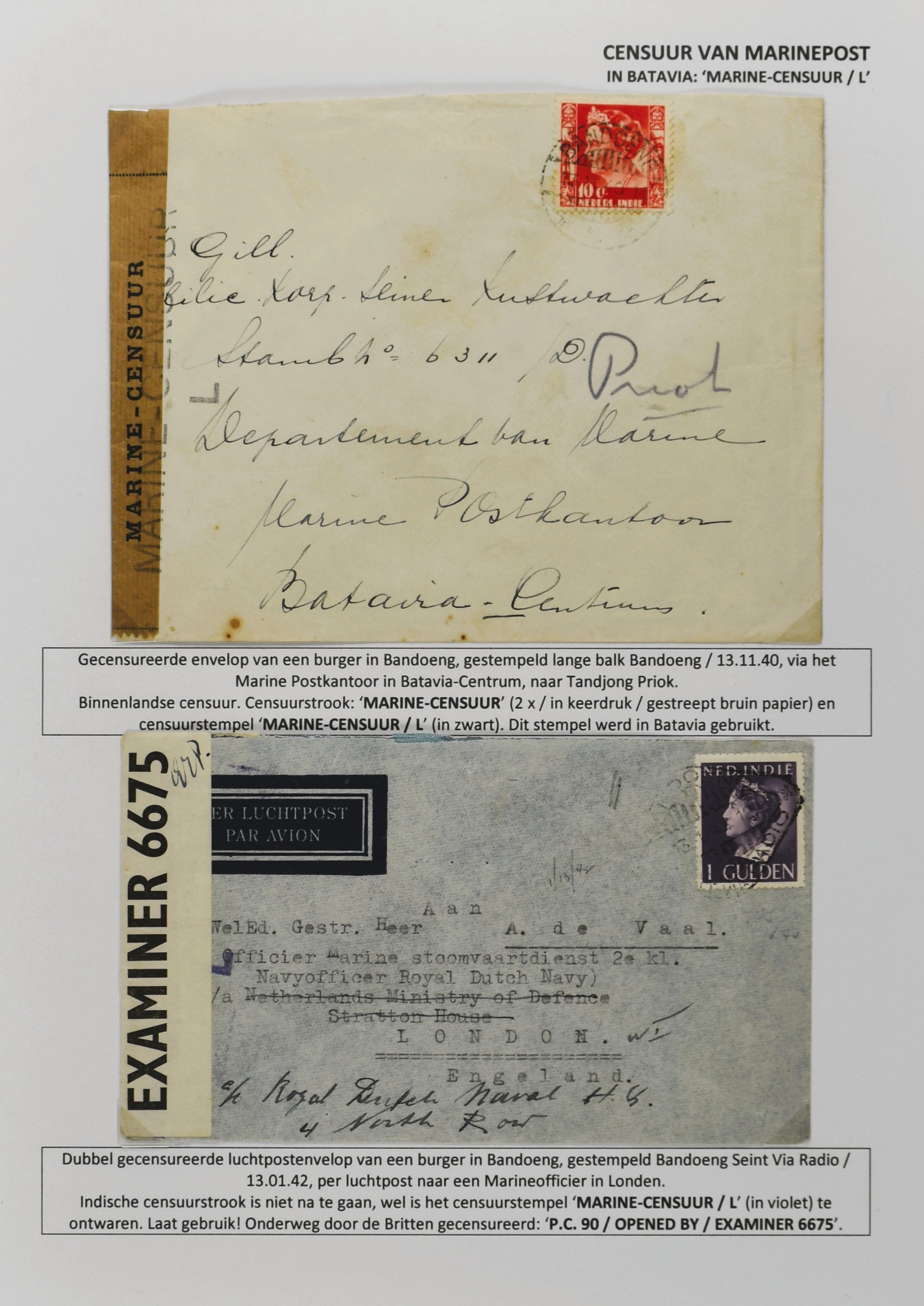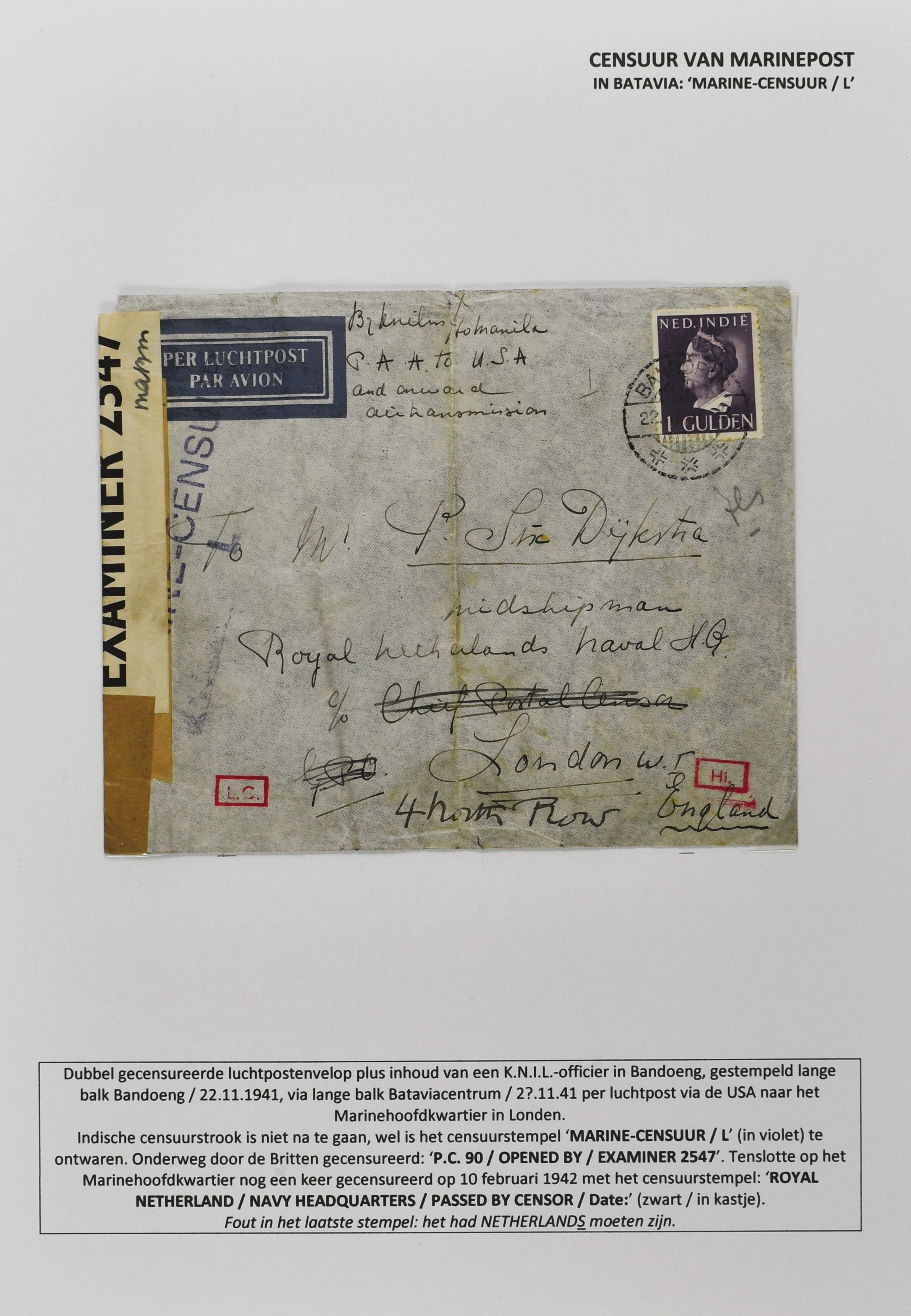 2247 imageCENSUUR VAN DE MARINEPOST, tentoonstellingscollectie bestaande uit 62 buitengewoon nauwgezet en gedocumenteerd beschreven poststukken met allerlei door de Kon. Marine waar ook ter wereld gebruikte censuren, te beginnen in Ned.-Indië met de Muiterij op de Zeven Provinciën (1933), verder censuren in Indië met verschillende stempels en stroken, Marinepost van o.a. Oost- en West-Indië in Groot-Brittannië, Brits-Indië, Australië, in Nederland zelf na de Tweede W.O., enz. Een uitzonderlijk informatieve collectie van posthistorische en geschiedkundige betekenis! De bladen bevinden zich in een platte doos (Image) (Image2) (Image3) (Image4) (Image5) (Image6) (Image7) (Image8) (Image9) (Image10) (Image11) (Image12) (Image13) (Image14) (Image15) (Image16) (Image17) (Image18) (Image19) (Image20) (Image21) (Image22) (Image23) (Image24) (Image25) (Image26) (Image27) (Image28) (Image29) (Image30) (Image31) (Image32) (Image33) (Image34) (Image35) (Image36) (Image37) (Image38) (Image39) (Image40) (Image41) (Image42) (Image43) (Image44) (Image45) (Image46) (Image47) (Image48) (All Images)