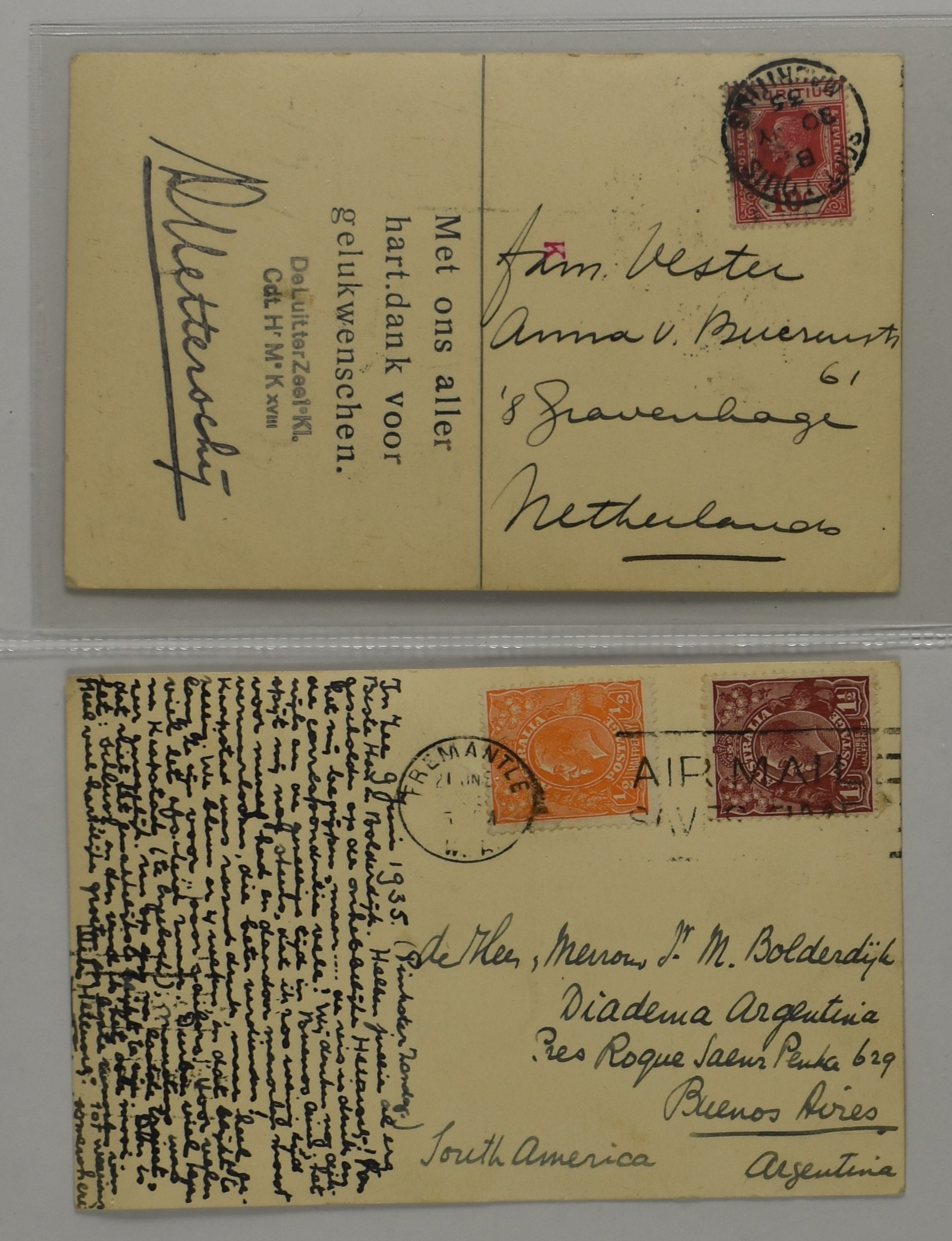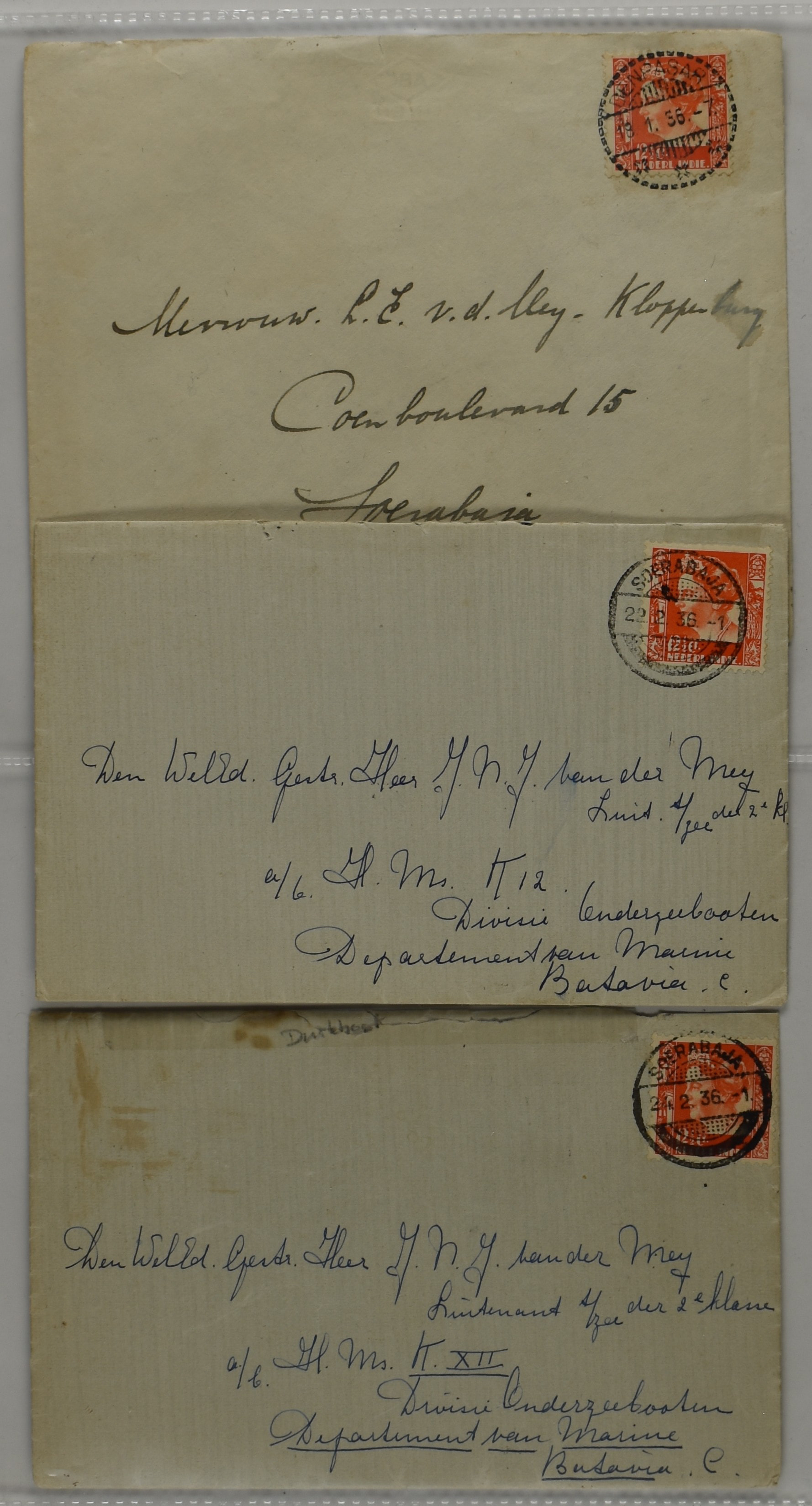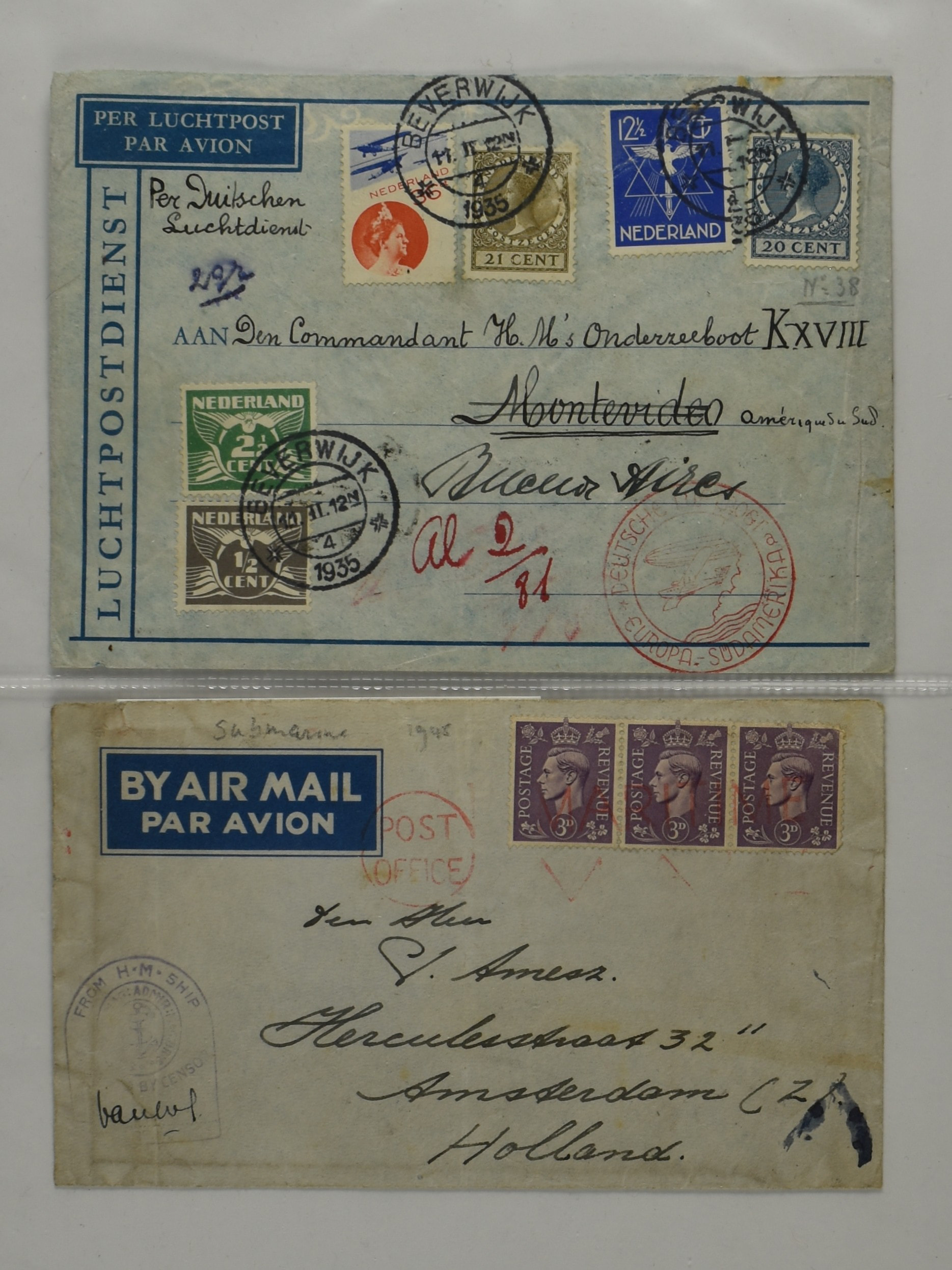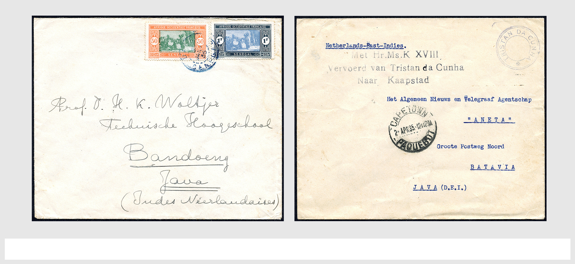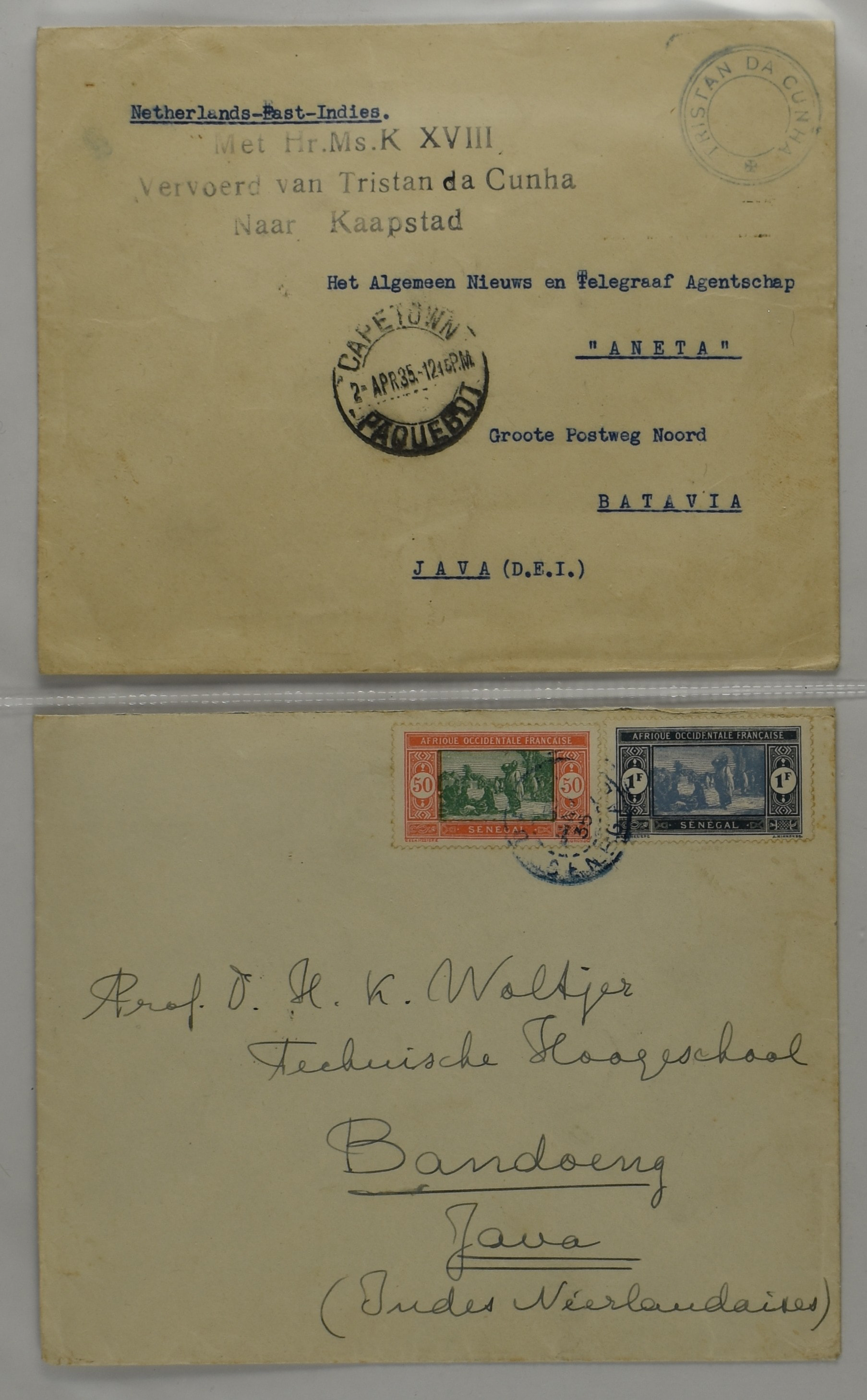 2248 imageNEDERLAND/NED.- INDIË, kleine maar zeer bijzondere verzameling van post van/naar onderzeeboten uit de K-klasse, vnl. van de wereldreis die Hr.Ms.K XVIII heeft gemaakt van Nieuwediep 14-11-1934 naar Soerabaja 11-7-1935, w.o. 2 zeer zeldzame enveloppen met op de az. gedrukt afzendadres van de onderzeeboot, 1 ex. verstuurd vanuit Tristan da Cunha over Kaapstad 2-4-1935 naar Batavia-C. 2-5-1935, 1 ex. gefrankeerd met 2 zegels van Senegal uit Dakar 5(€)-1-1935 naar Bandoeng 14-2-1935. Beide enveloppen zijn uiterst zeldzame poststukken! Tevens enkele andere brieven w.o. envelop (waterschade€) van Beverwijk 11-2-1935 met de Duitse luchtpost naar de commandant van de K XVIII via Montevideo naar Buenos Aires 23-2-1935, prentbriefkaarten, post van/naar K XVII etc., documentatie, foto's en een herdenkingsboek 'De Wereldreis van H.M. KXVIII'. Unieke koop! (Image) (Image2) (Image3) (Image4) (Image5) (Image6) (Image7) (Image8) (Image9) (Image10) (Image11) (All Images)